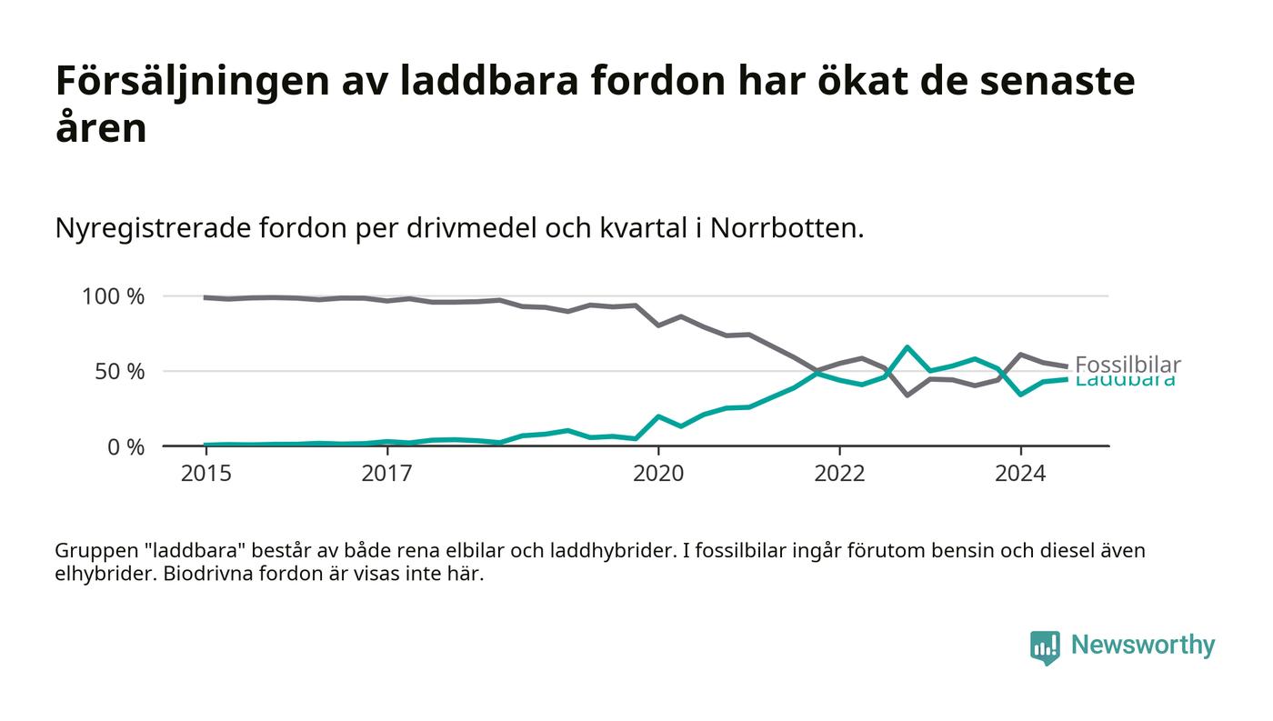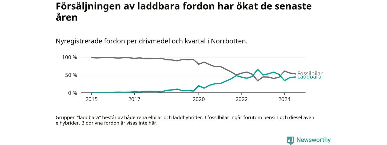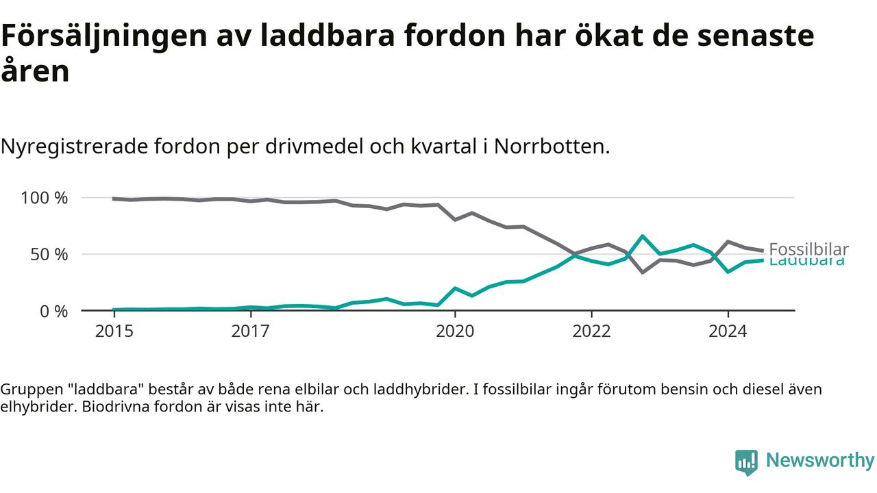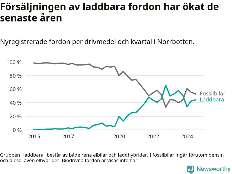 De senaste åren har vi sett en kraftig ökning i försäljning av laddbilar i Sverige. Under slutet av 2023 och början av 2024 har utvecklingen stannat av. I Norrbotten peakade andelen laddbara under fjärde kvartalet 2022 (66 procent).