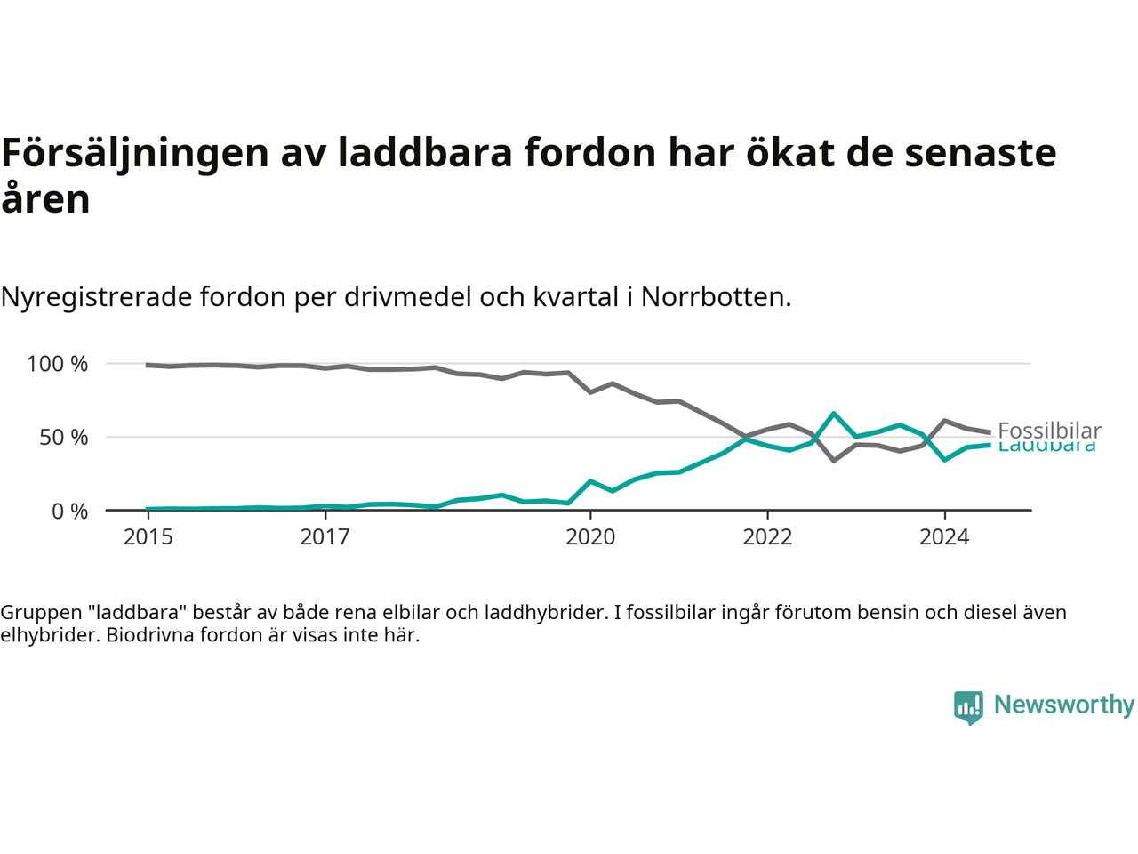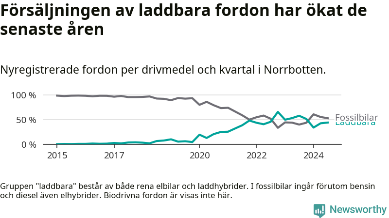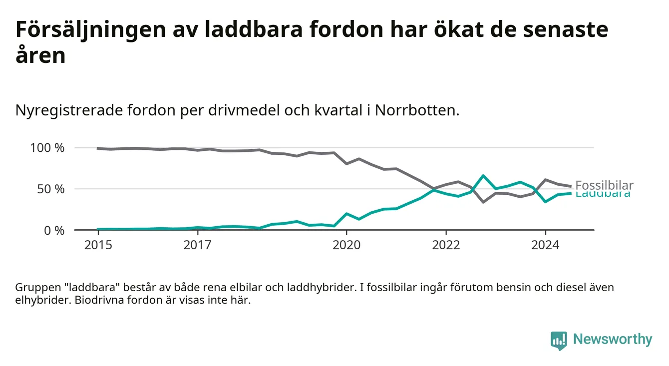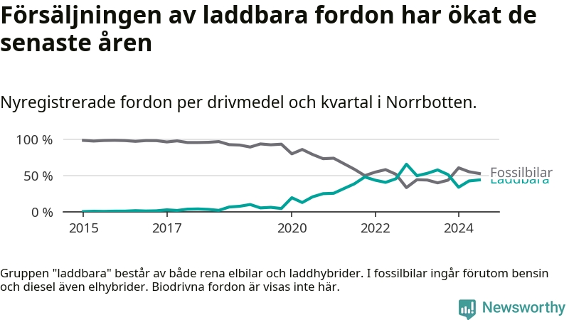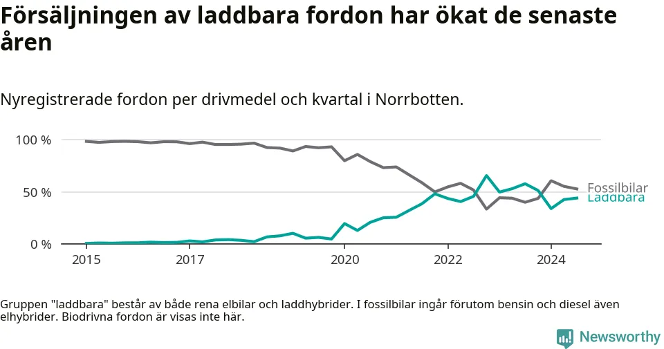 De senaste åren har vi sett en kraftig ökning i försäljning av laddbilar i Sverige. Under slutet av 2023 och början av 2024 har utvecklingen stannat av. I Norrbotten peakade andelen laddbara under fjärde kvartalet 2022 (66 procent).