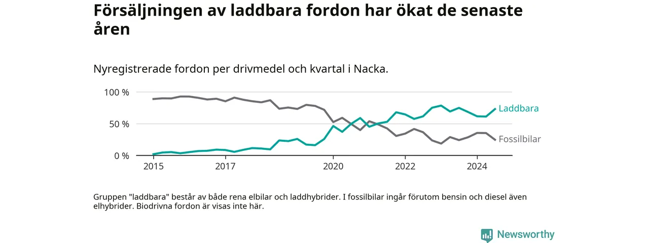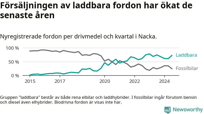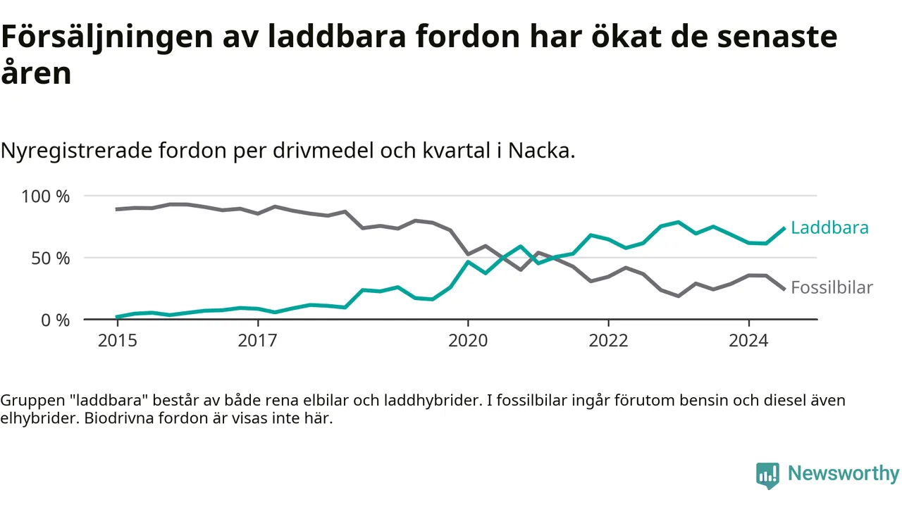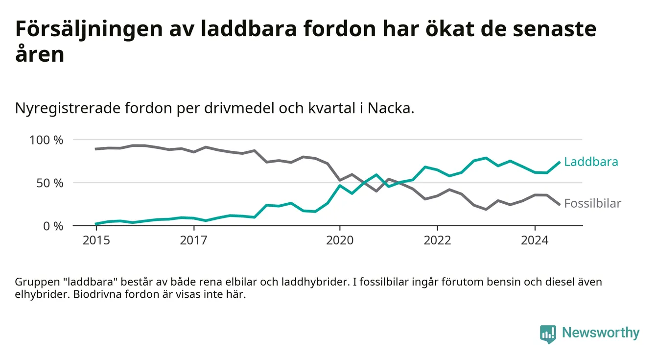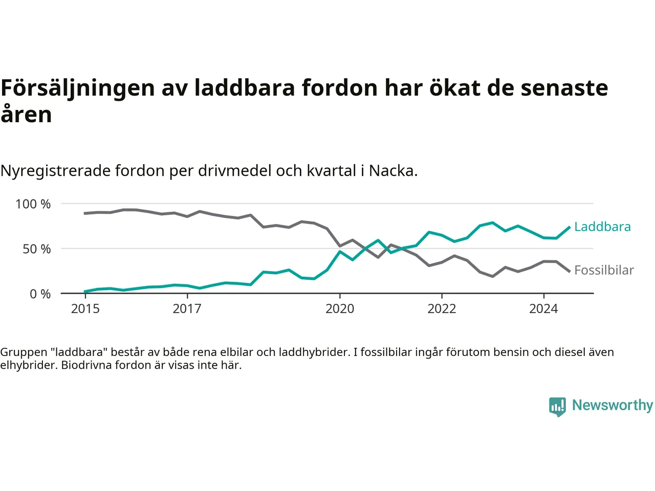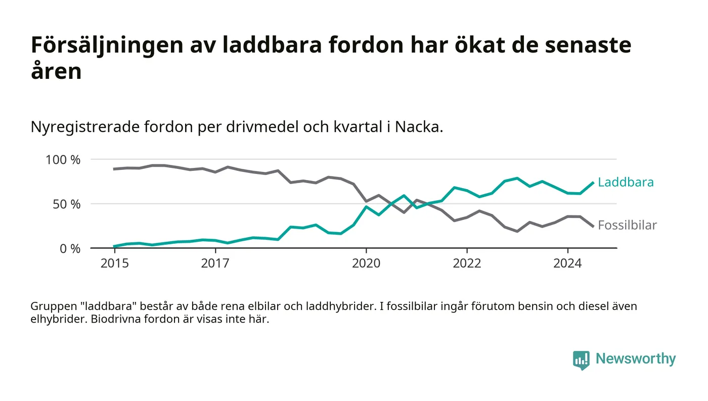 Under tredje kvartalet 2024 var 73 procent av alla nyregistrerade personbilar i Nacka laddbara (sammanlagt registrerades 1 375 nya bilar). Merparten av de laddbara bilarna var rena elbilar (46 procent av alla).