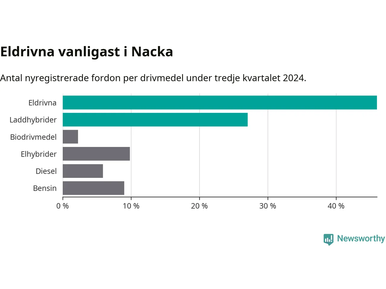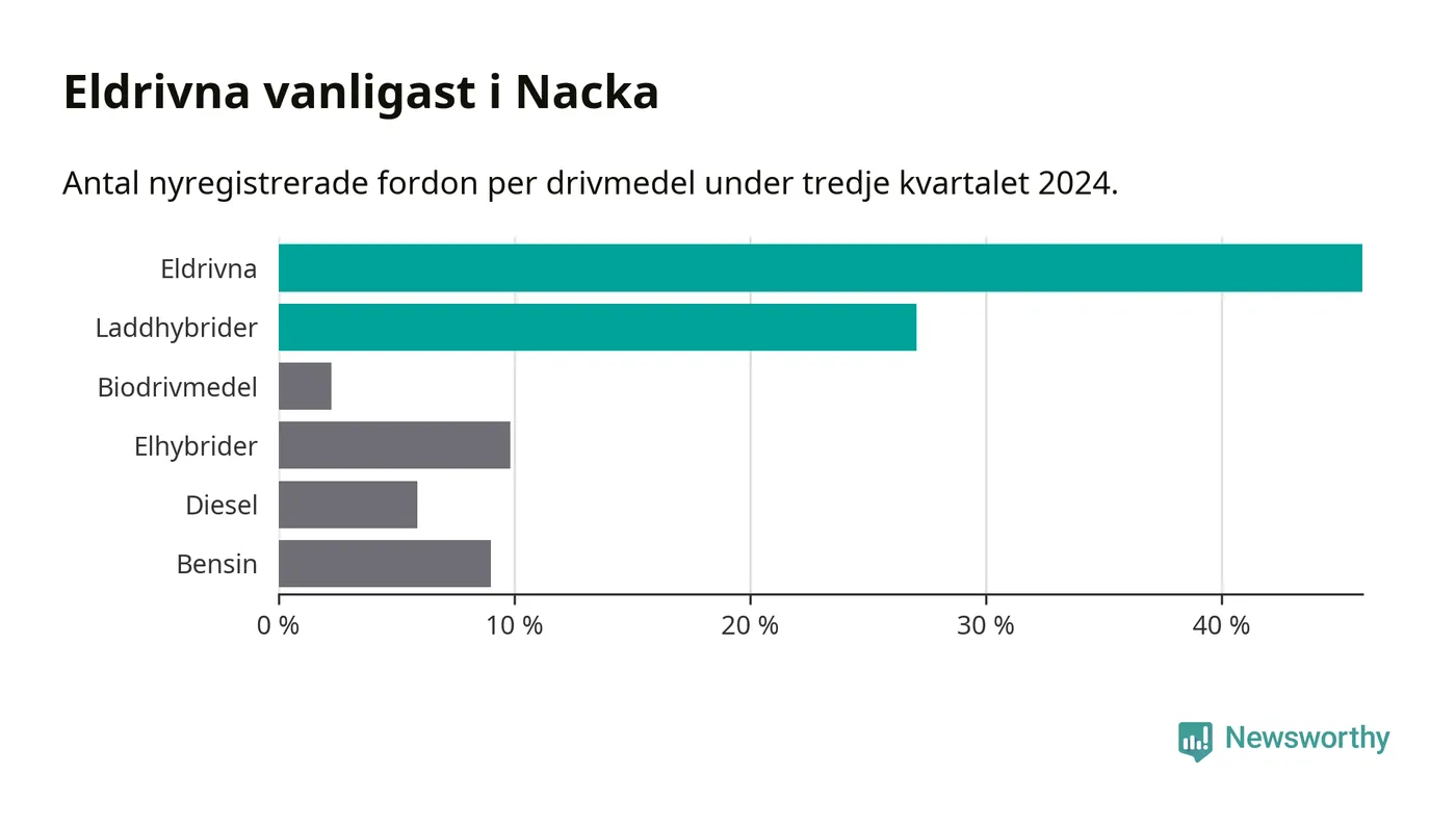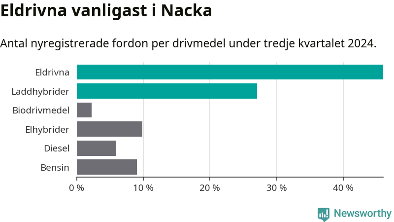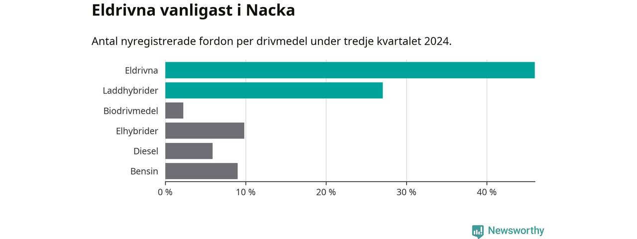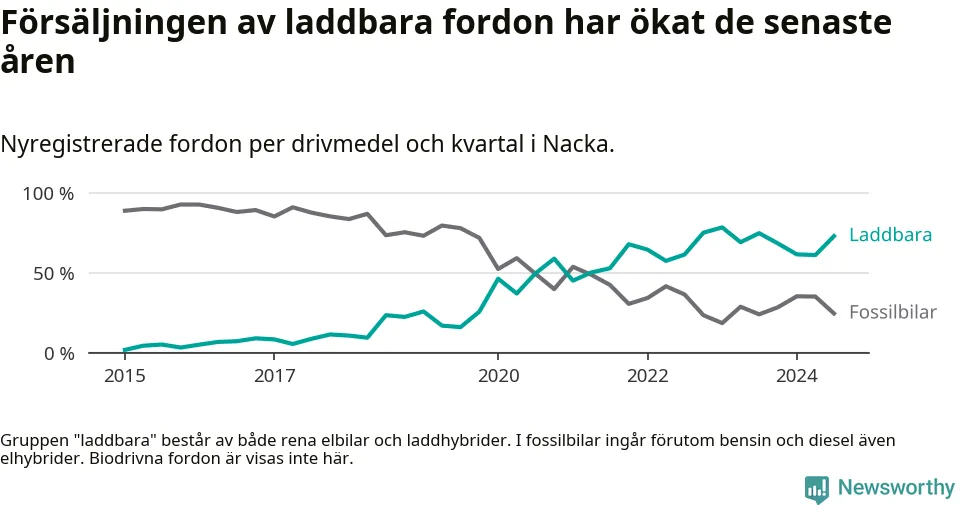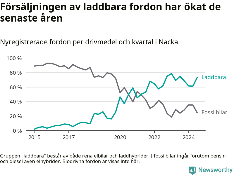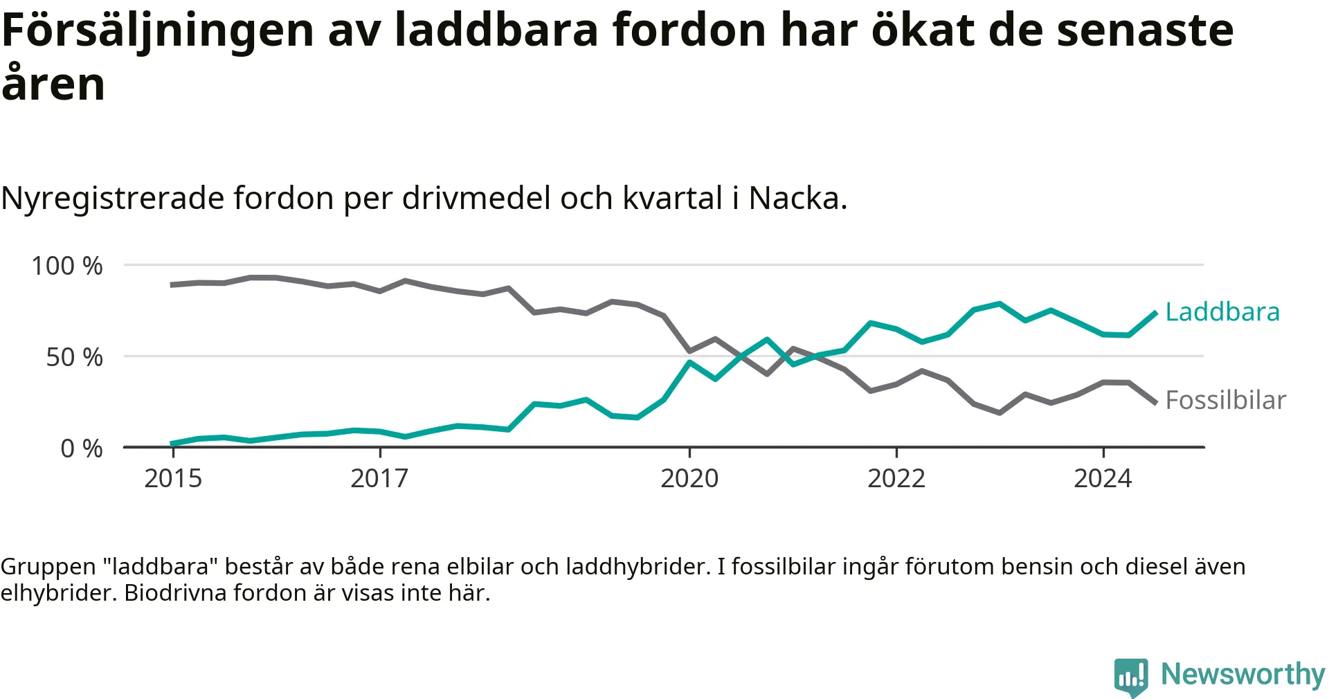 Under tredje kvartalet 2024 var 73 procent av alla nyregistrerade personbilar i Nacka laddbara (sammanlagt registrerades 1 375 nya bilar). Merparten av de laddbara bilarna var rena elbilar (46 procent av alla).