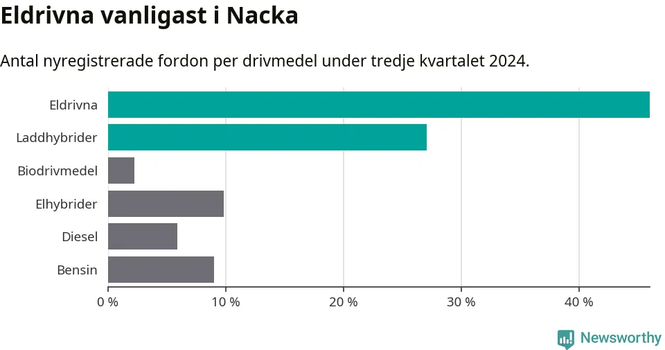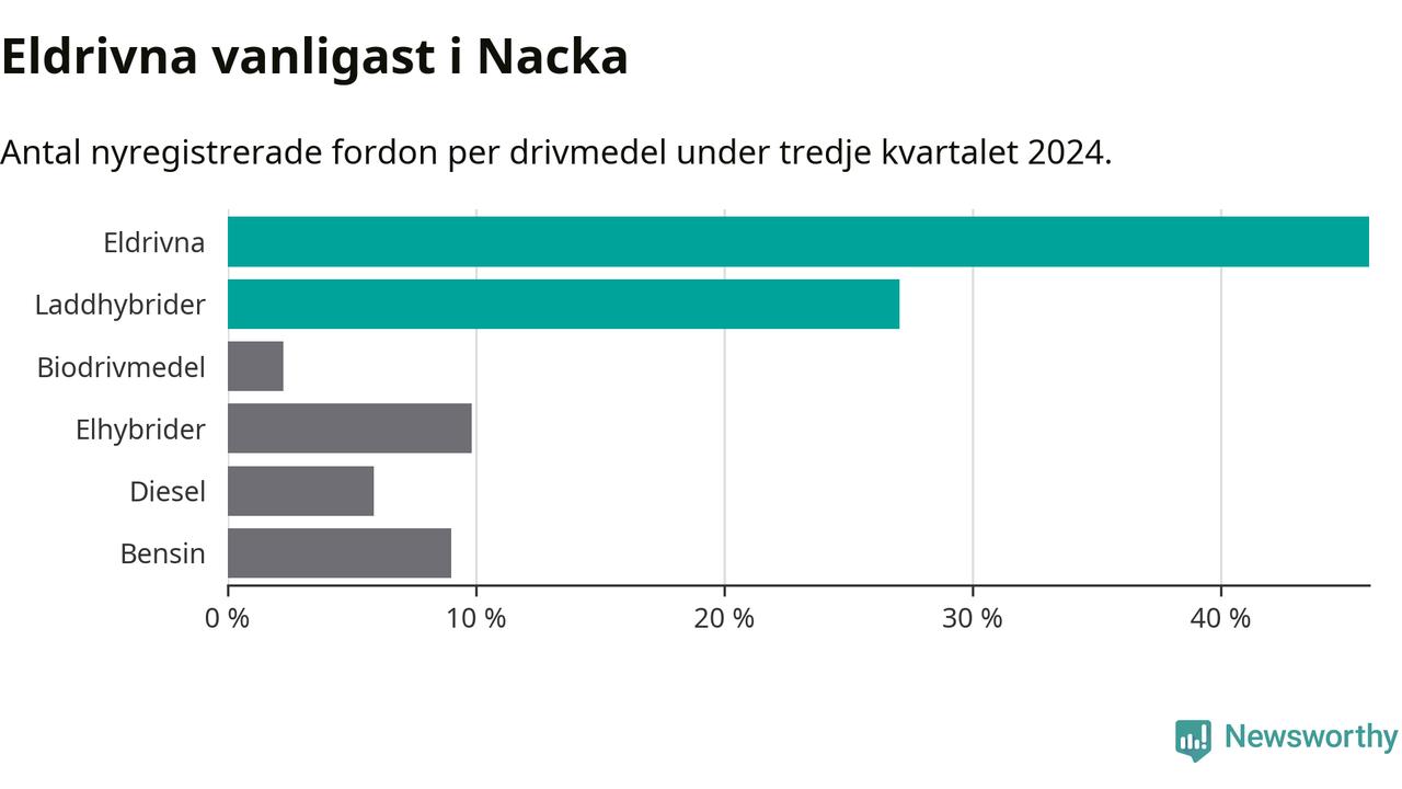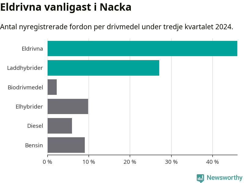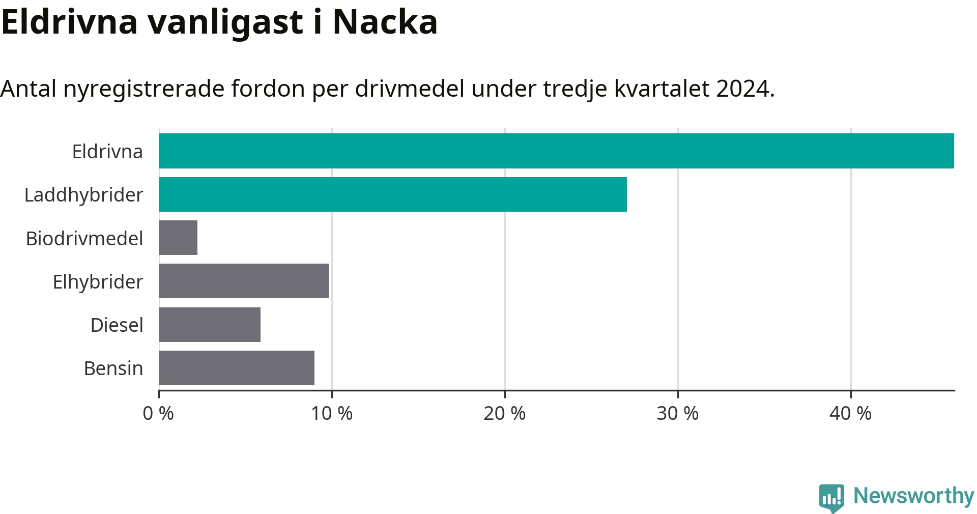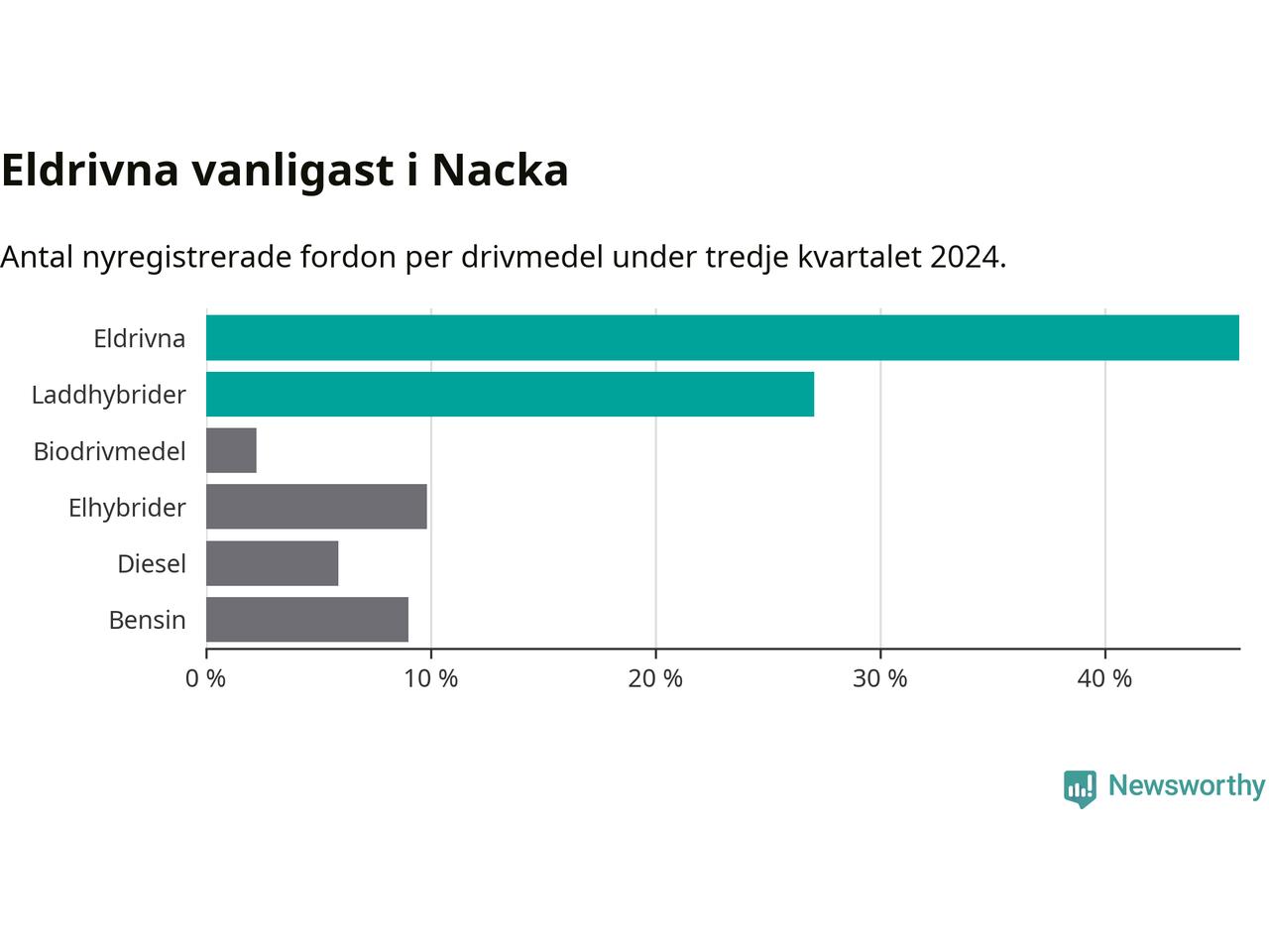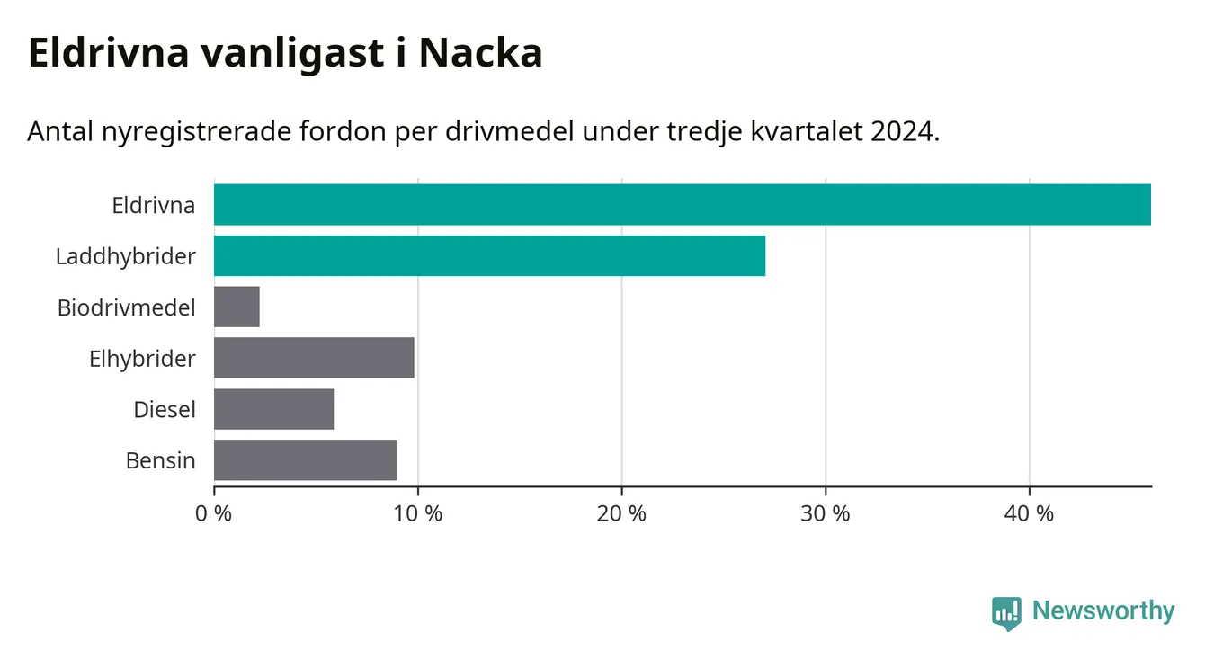 Under tredje kvartalet 2024 var 73 procent av alla nyregistrerade personbilar i Nacka laddbara (sammanlagt registrerades 1 375 nya bilar). Merparten av de laddbara bilarna var rena elbilar (46 procent av alla).