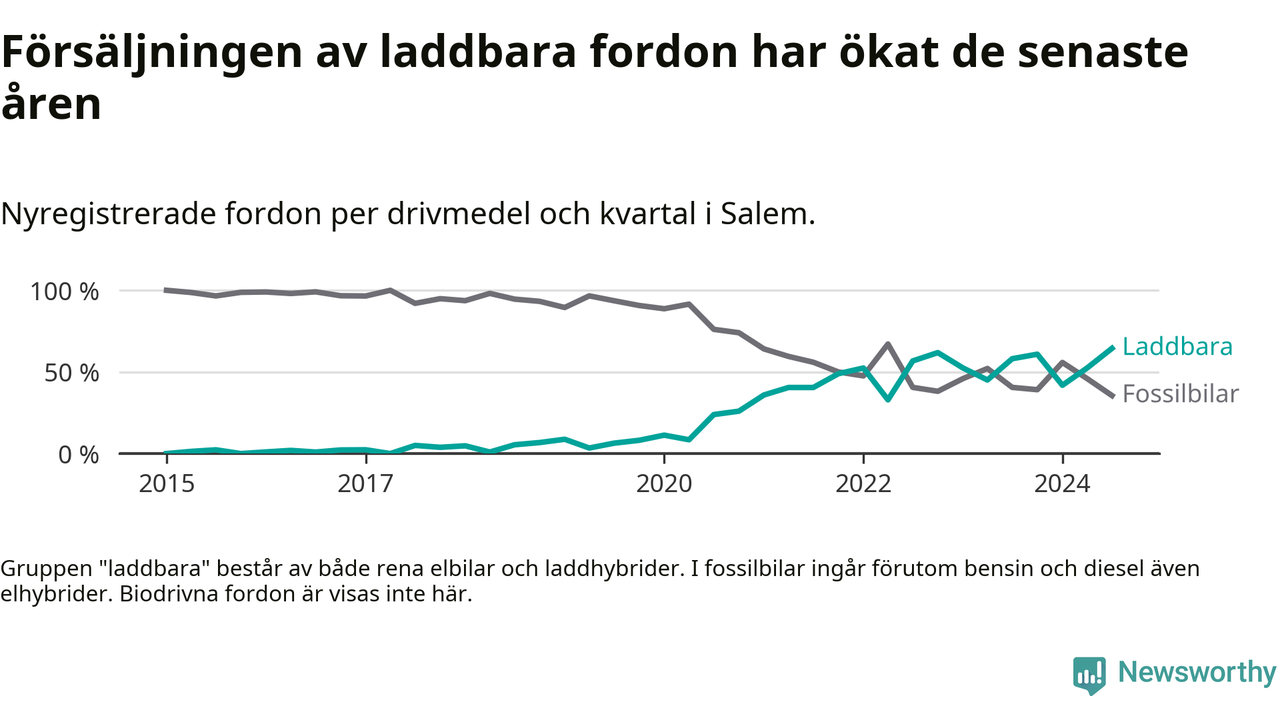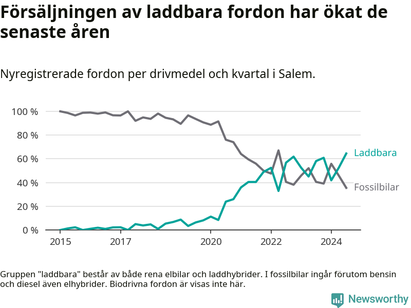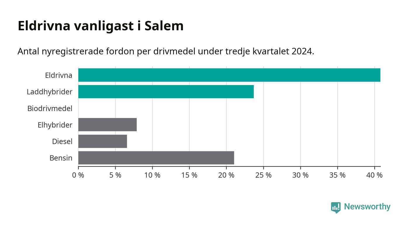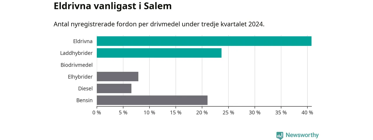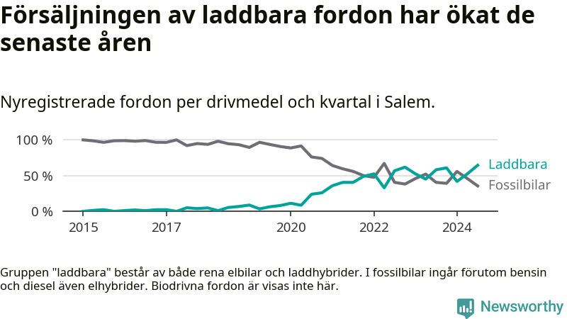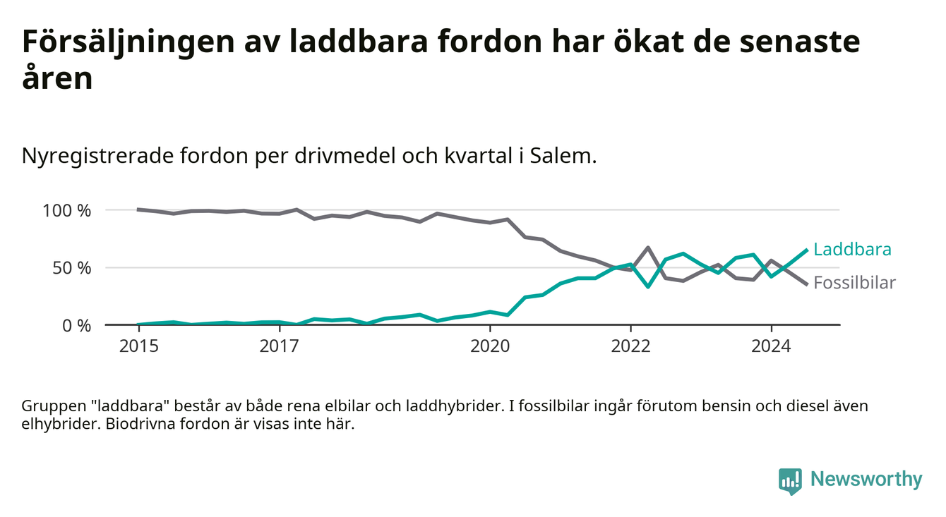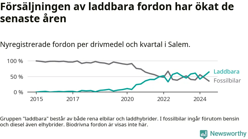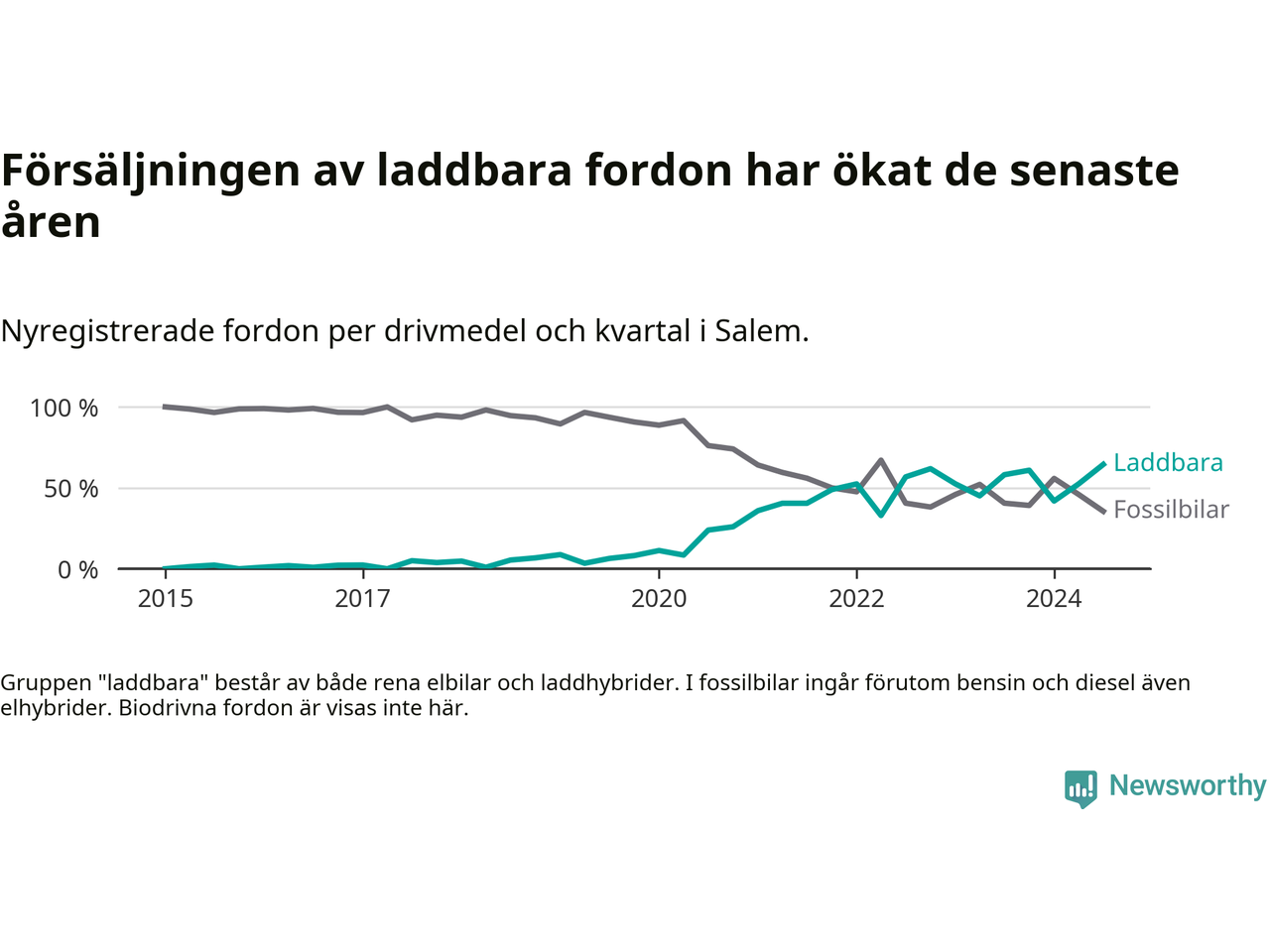 Under tredje kvartalet 2024 var 64 procent av alla nyregistrerade personbilar i Salem laddbara (sammanlagt registrerades 76 nya bilar). Merparten av de laddbara bilarna var rena elbilar (41 procent av alla).