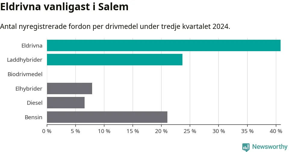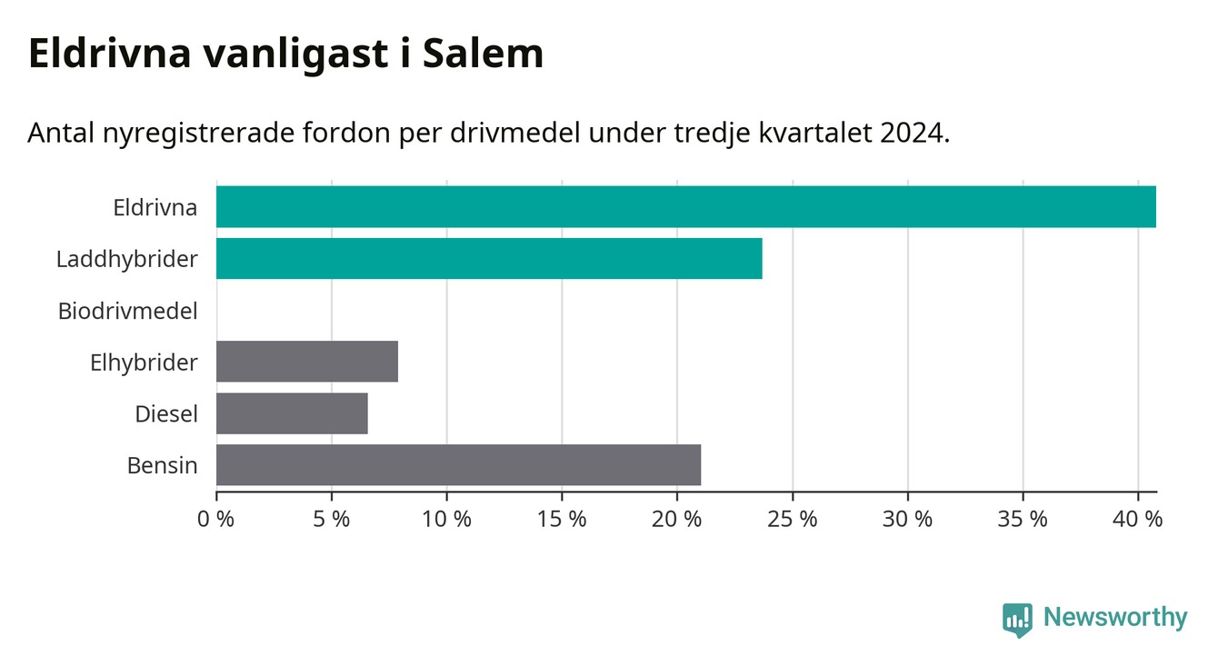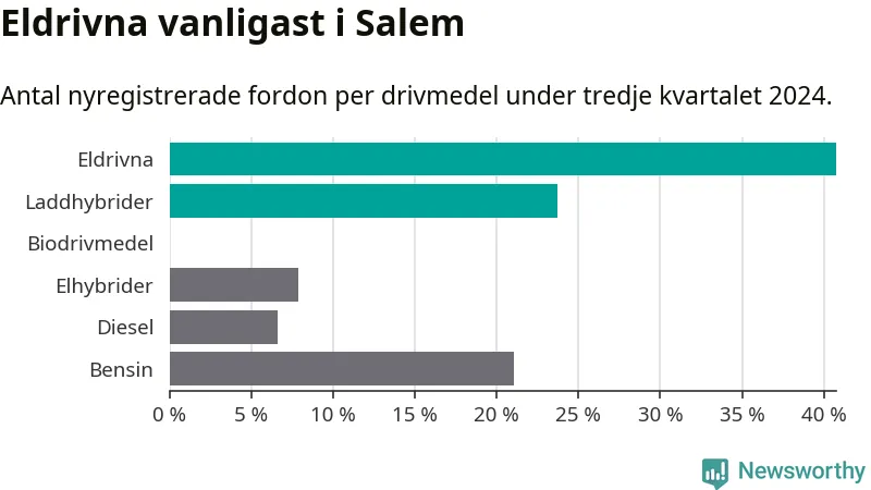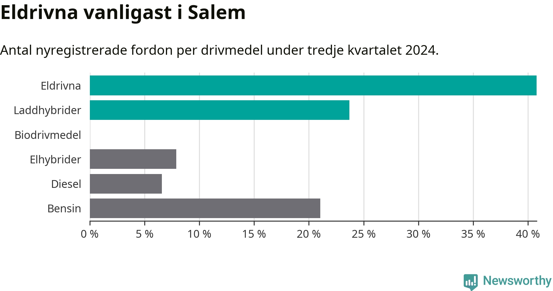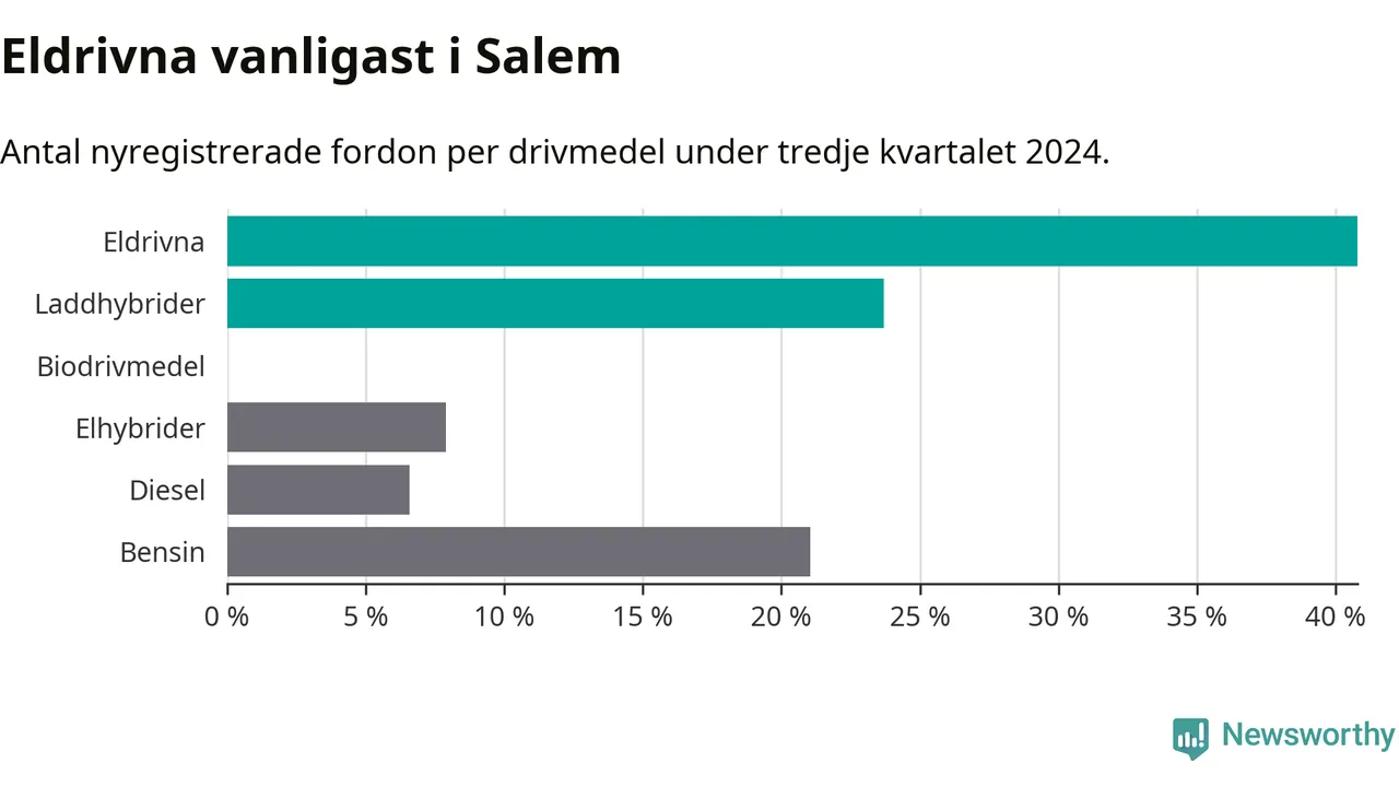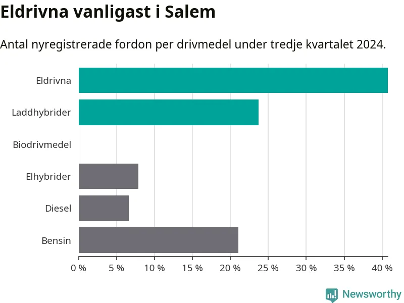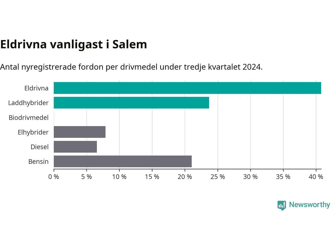 Under tredje kvartalet 2024 var 64 procent av alla nyregistrerade personbilar i Salem laddbara (sammanlagt registrerades 76 nya bilar). Merparten av de laddbara bilarna var rena elbilar (41 procent av alla).