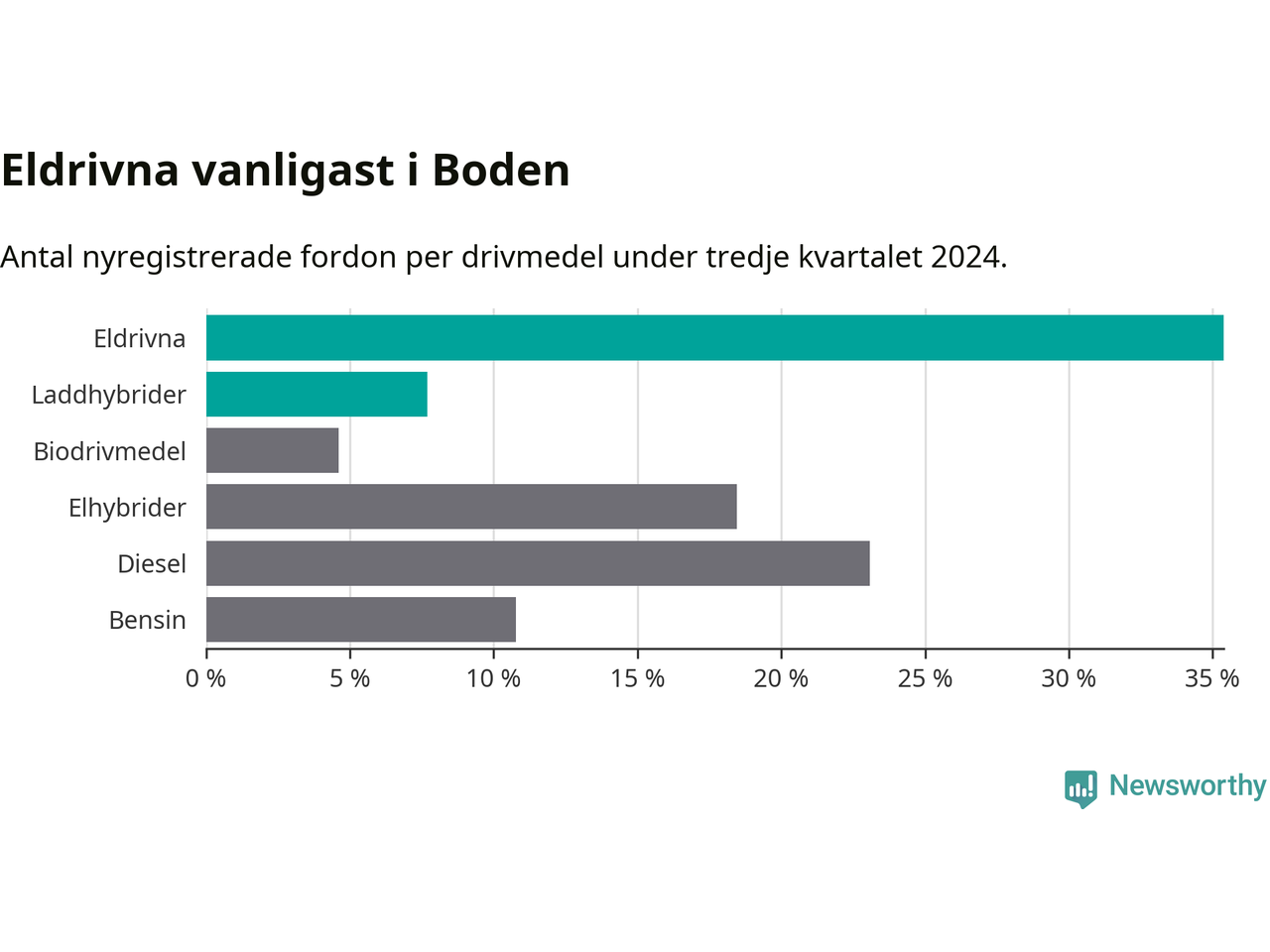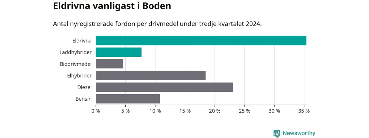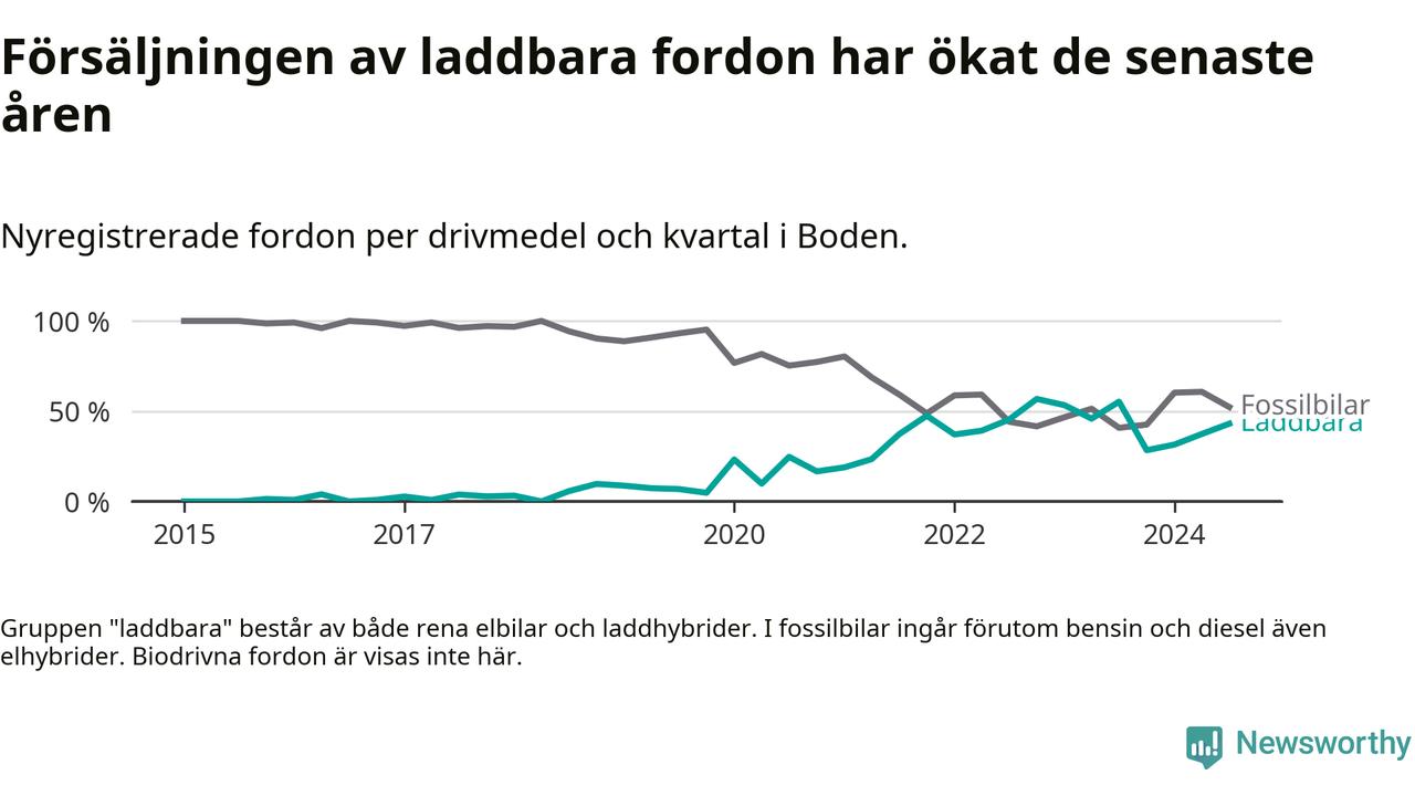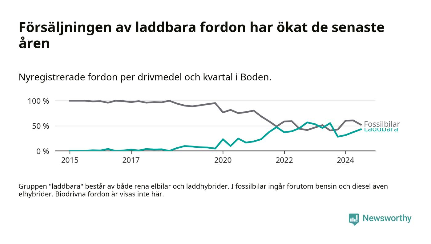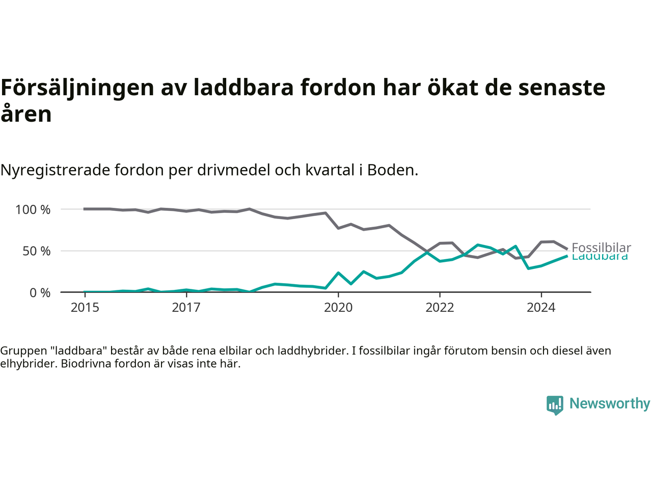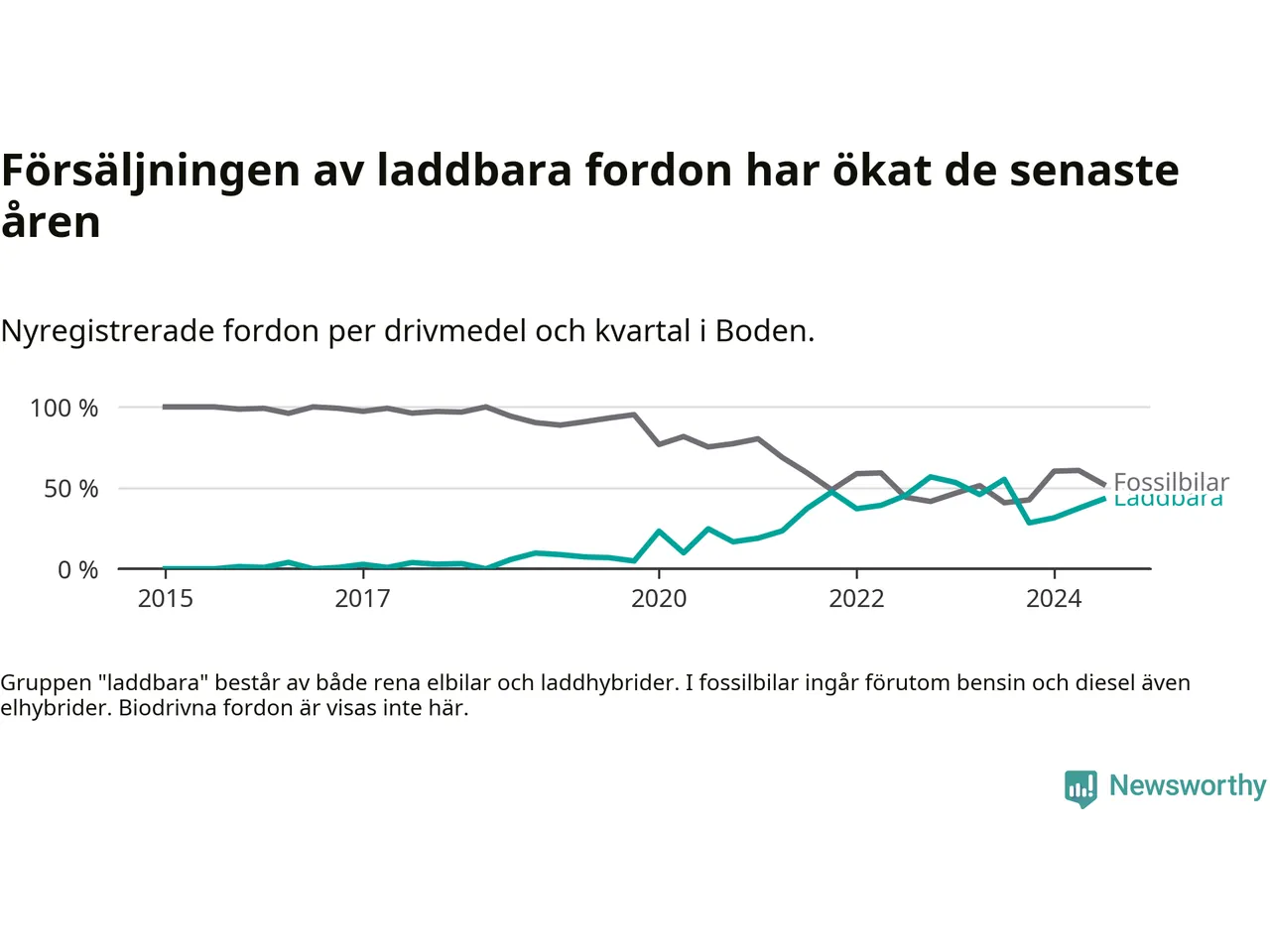 Under tredje kvartalet 2024 var 43 procent av alla nyregistrerade personbilar i Boden laddbara (sammanlagt registrerades 65 nya bilar). Merparten av de laddbara bilarna var rena elbilar (35 procent av alla).