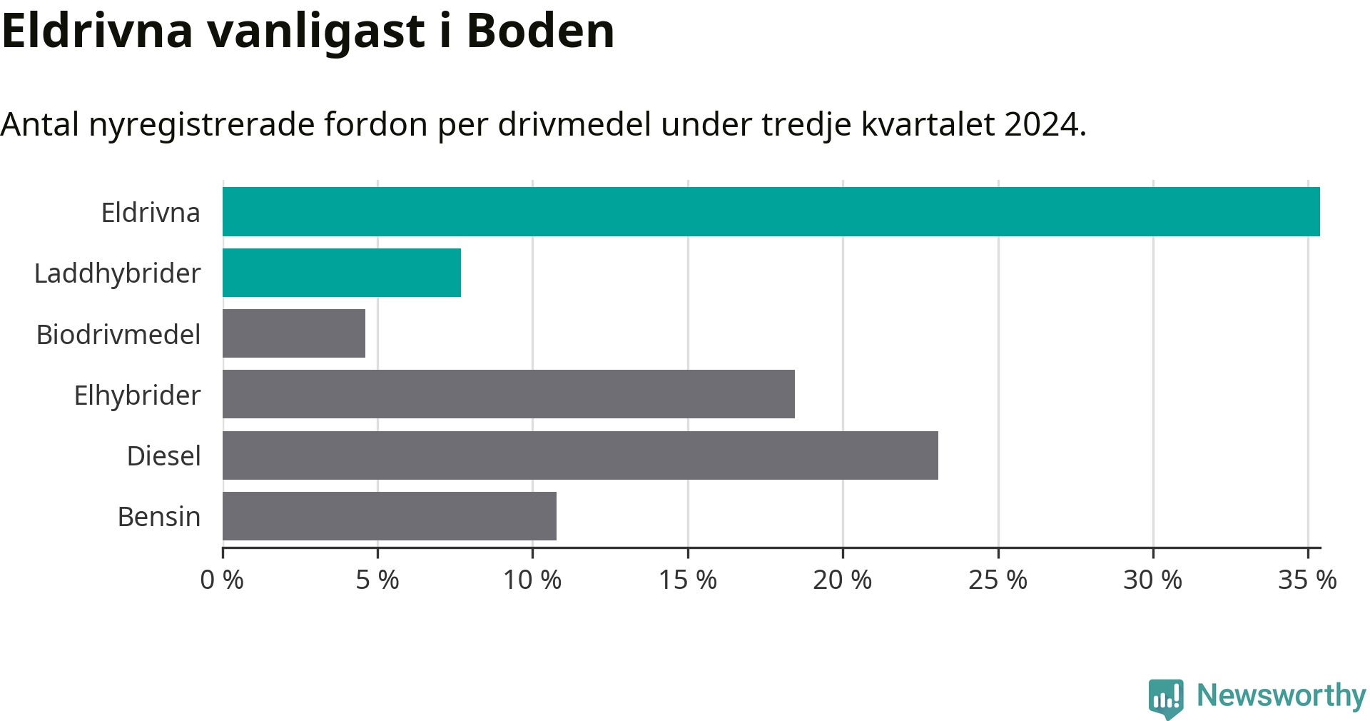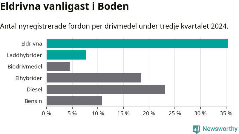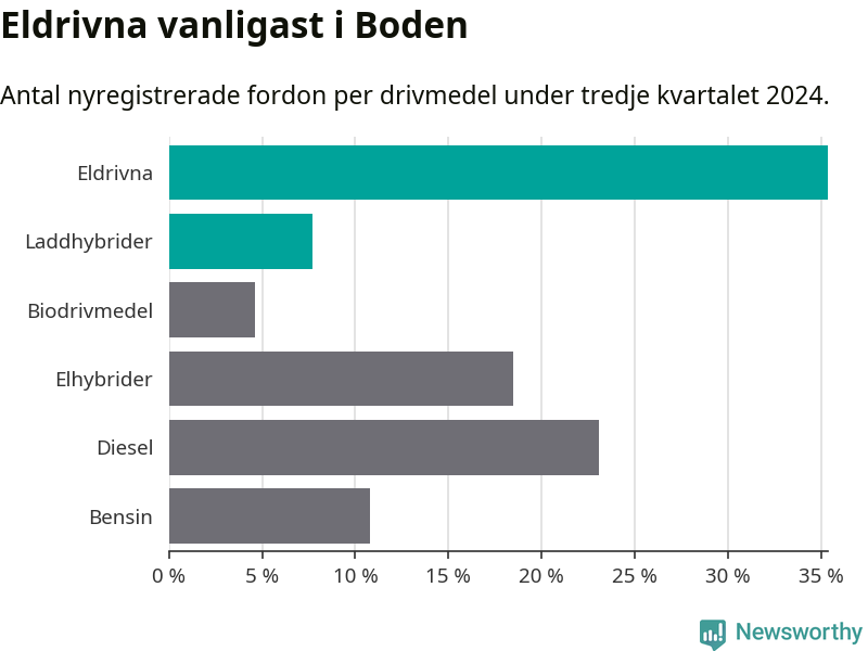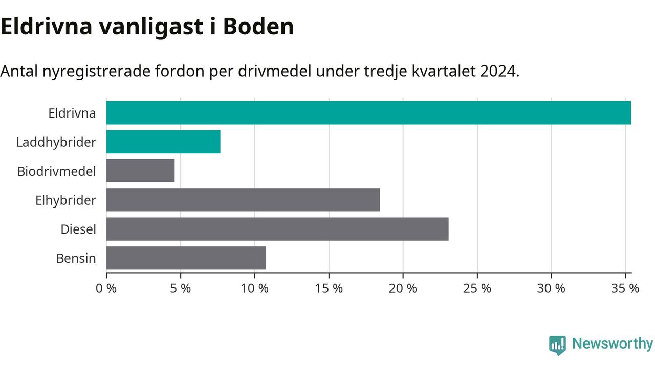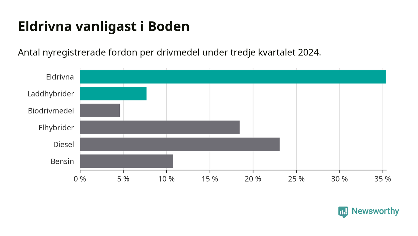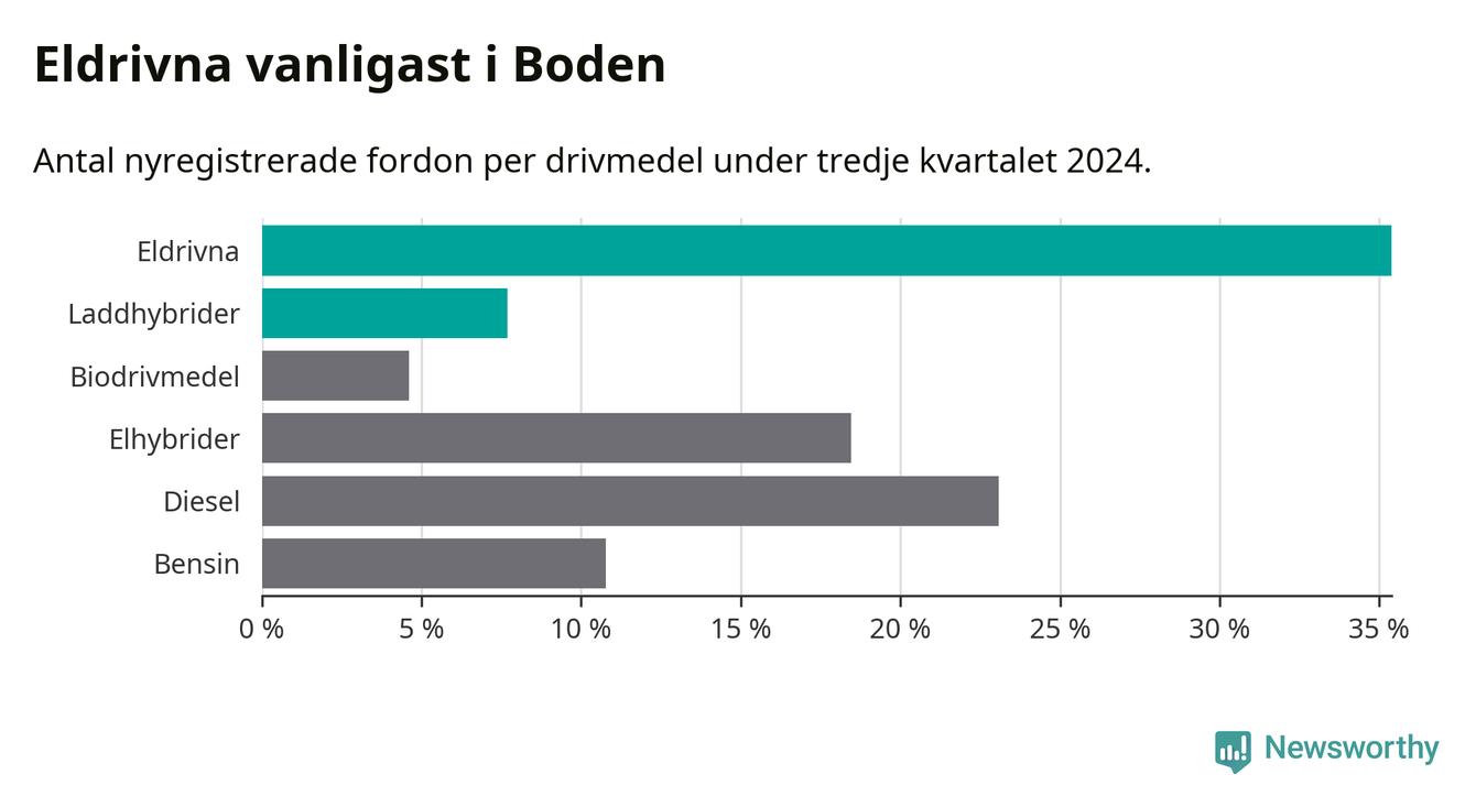 Under tredje kvartalet 2024 var 43 procent av alla nyregistrerade personbilar i Boden laddbara (sammanlagt registrerades 65 nya bilar). Merparten av de laddbara bilarna var rena elbilar (35 procent av alla).