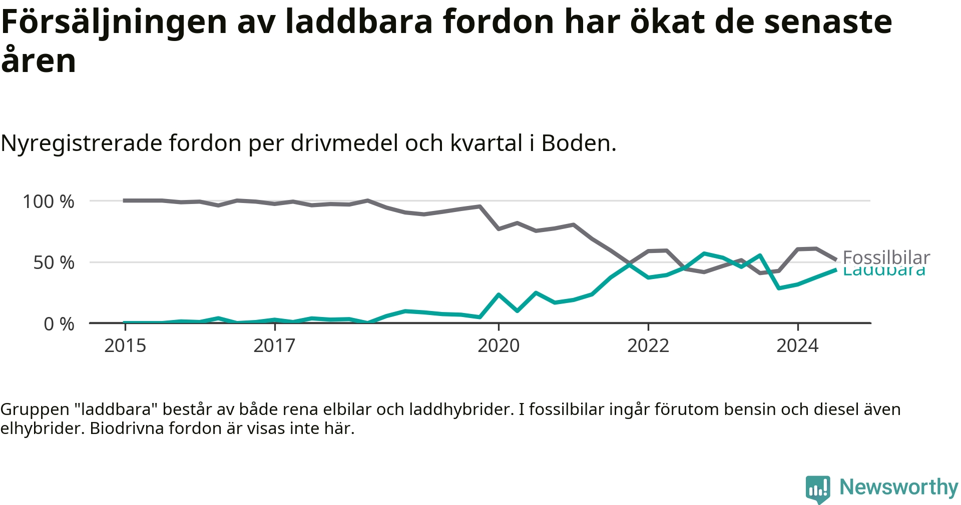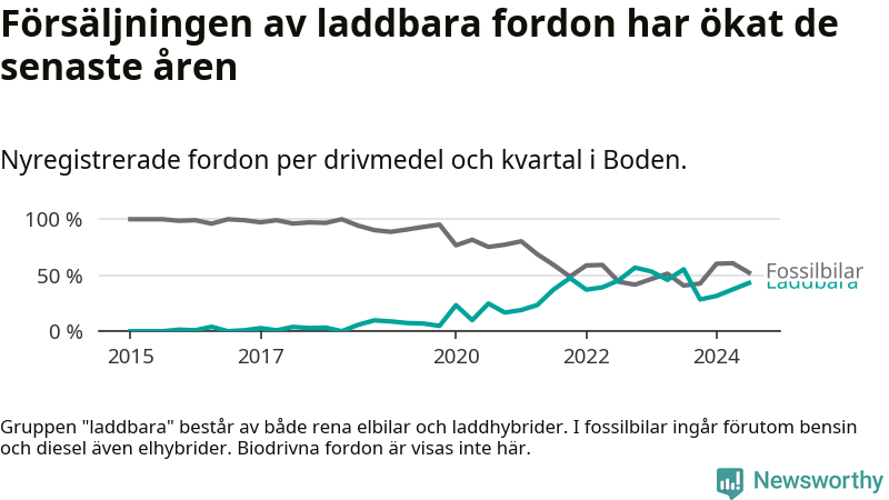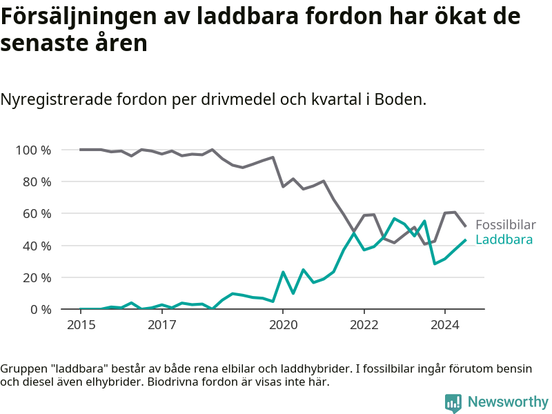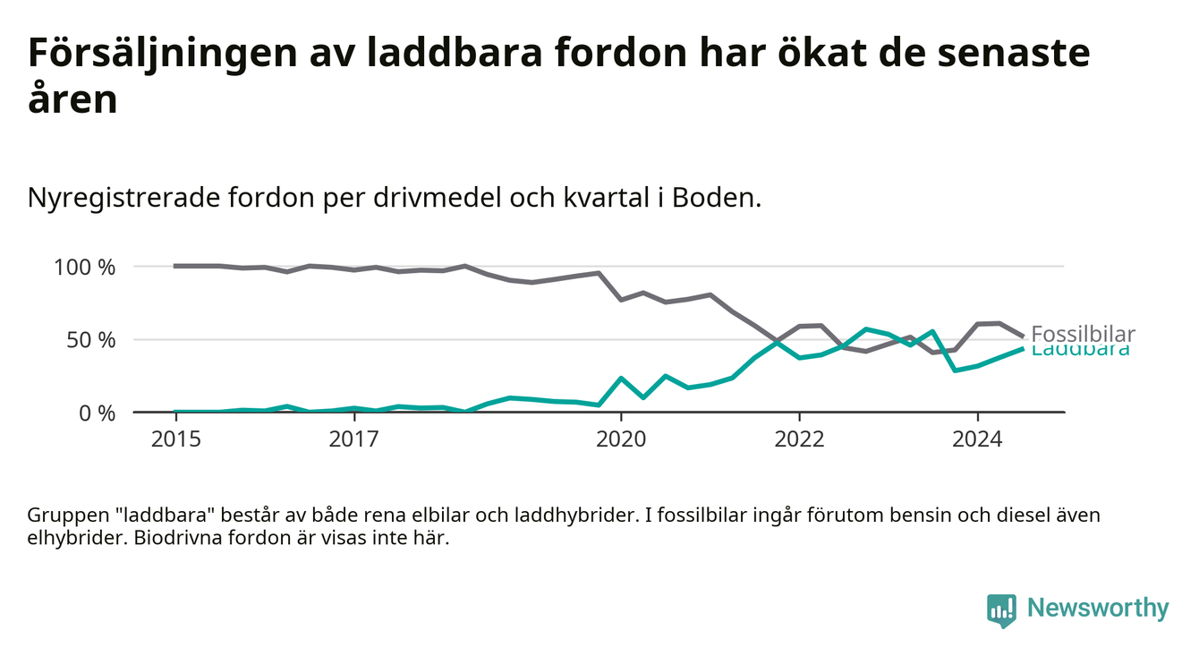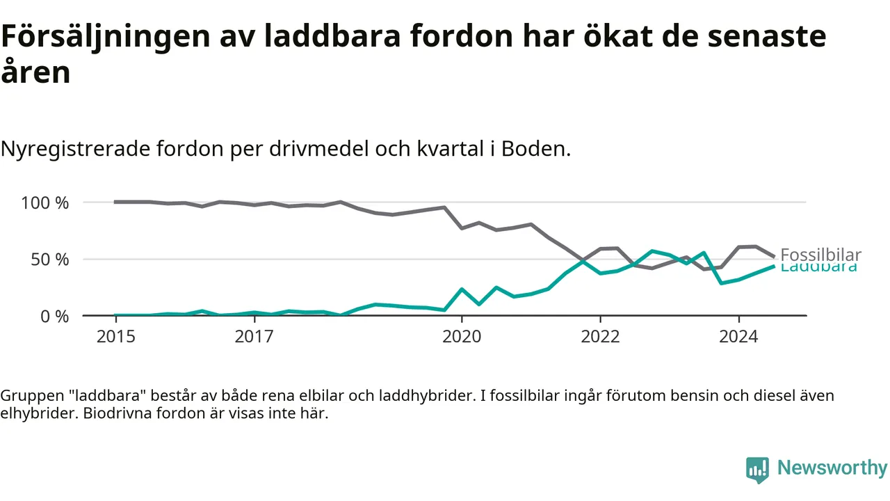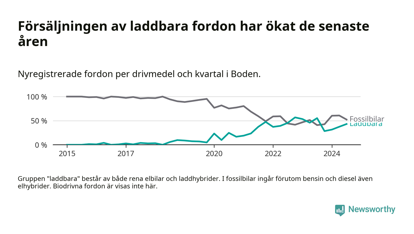 De senaste åren har vi sett en kraftig ökning i försäljning av laddbilar i Sverige. Under slutet av 2023 och början av 2024 har utvecklingen stannat av. I Boden peakade andelen laddbara under fjärde kvartalet 2022 (57 procent).