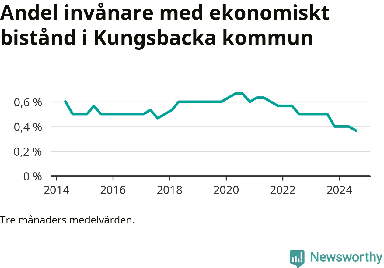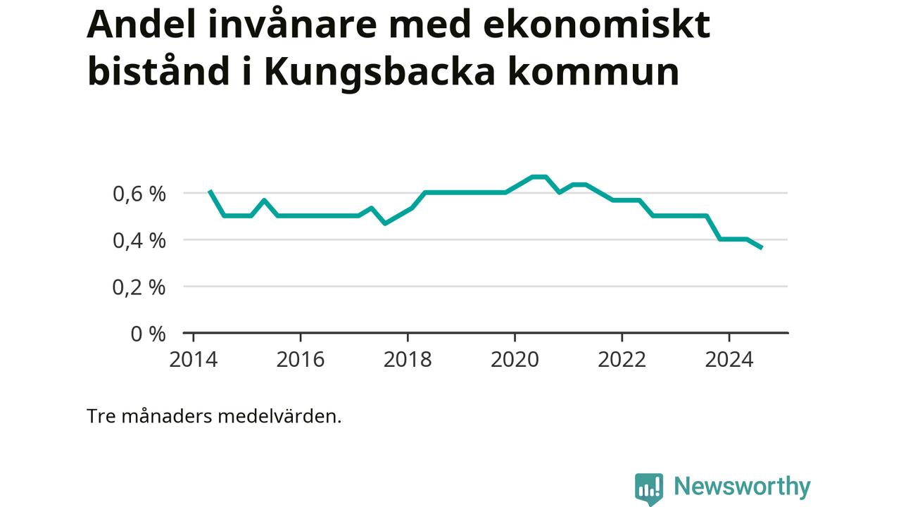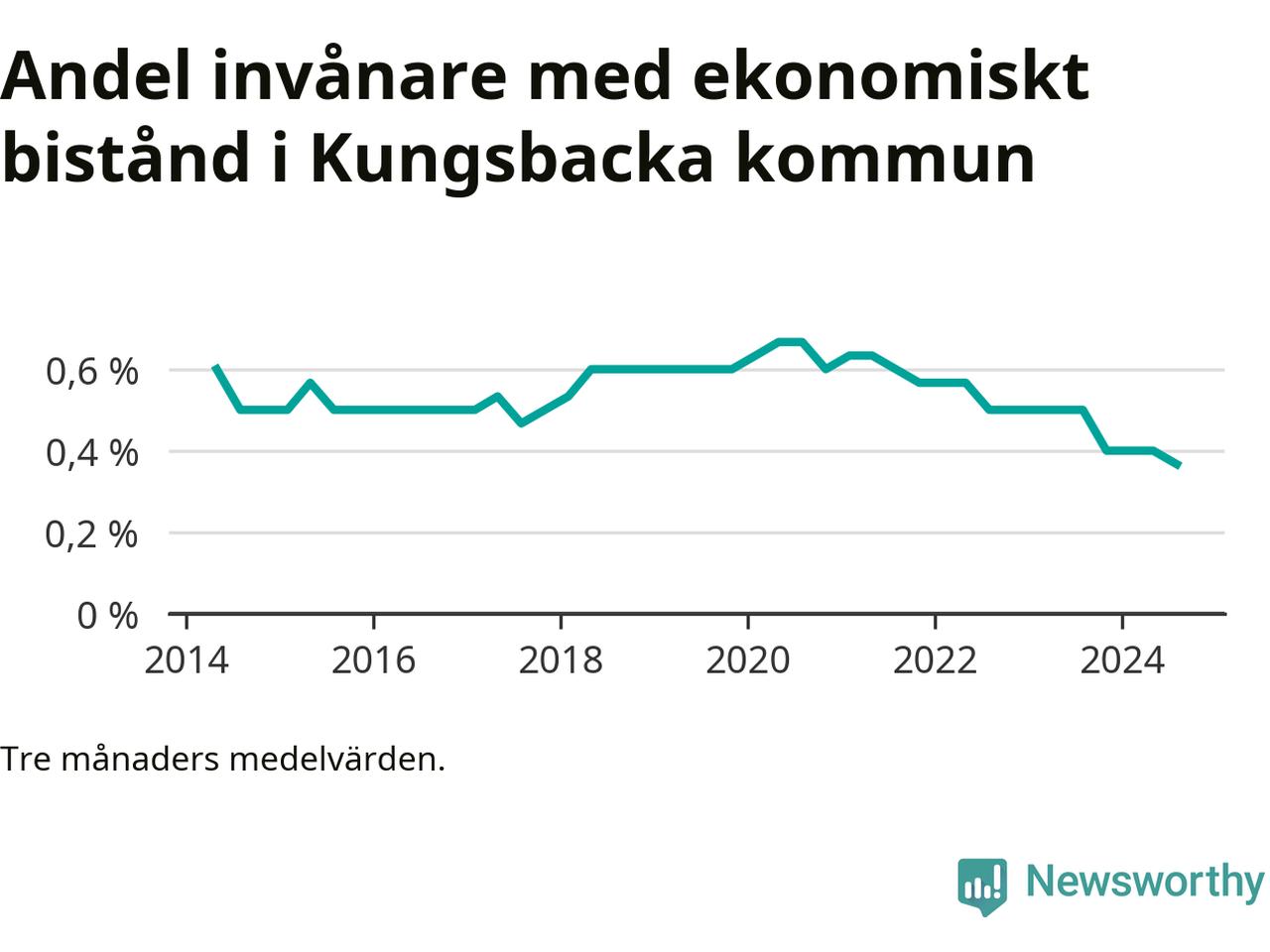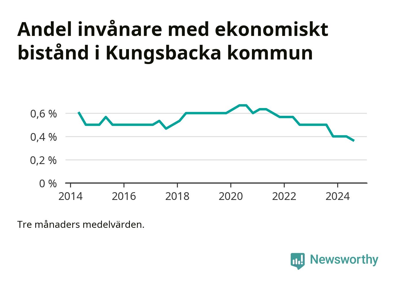Andelen invånare med ekonomiskt bistånd i Kungsbacka kommun var under sommaren den lägsta sedan åtminstone 2014. Det visar den senaste, preliminära statistiken från Socialstyrelsen.