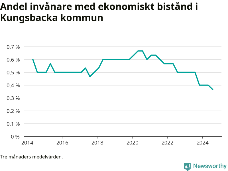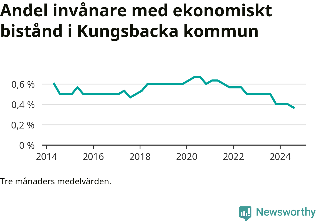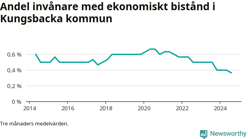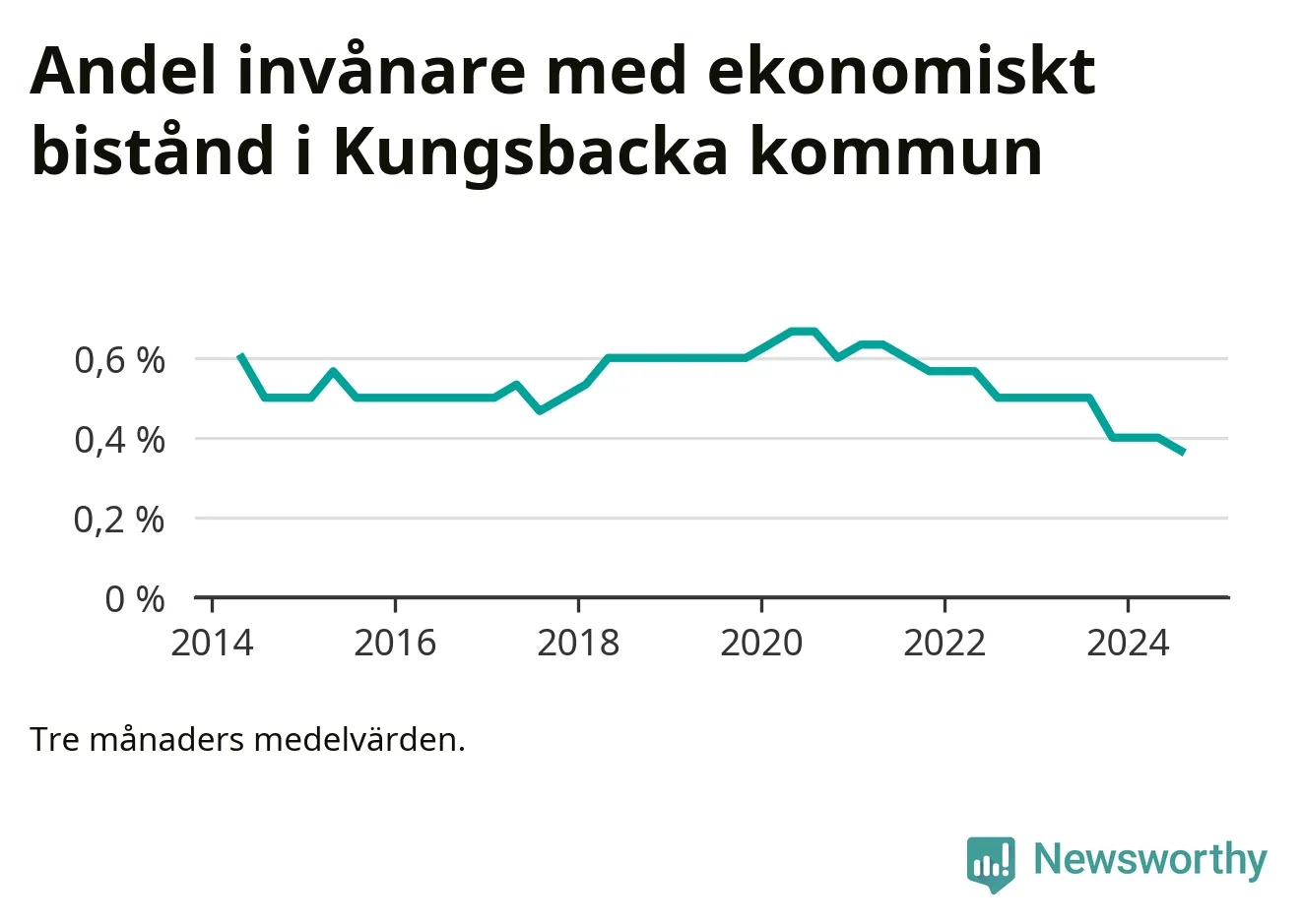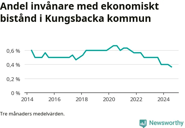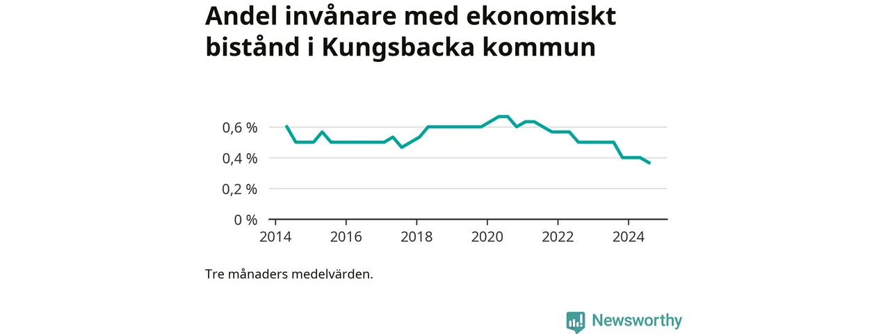 Andelen invånare med ekonomiskt bistånd i Kungsbacka kommun var under sommaren den lägsta sedan åtminstone 2014. Det visar den senaste, preliminära statistiken från Socialstyrelsen.