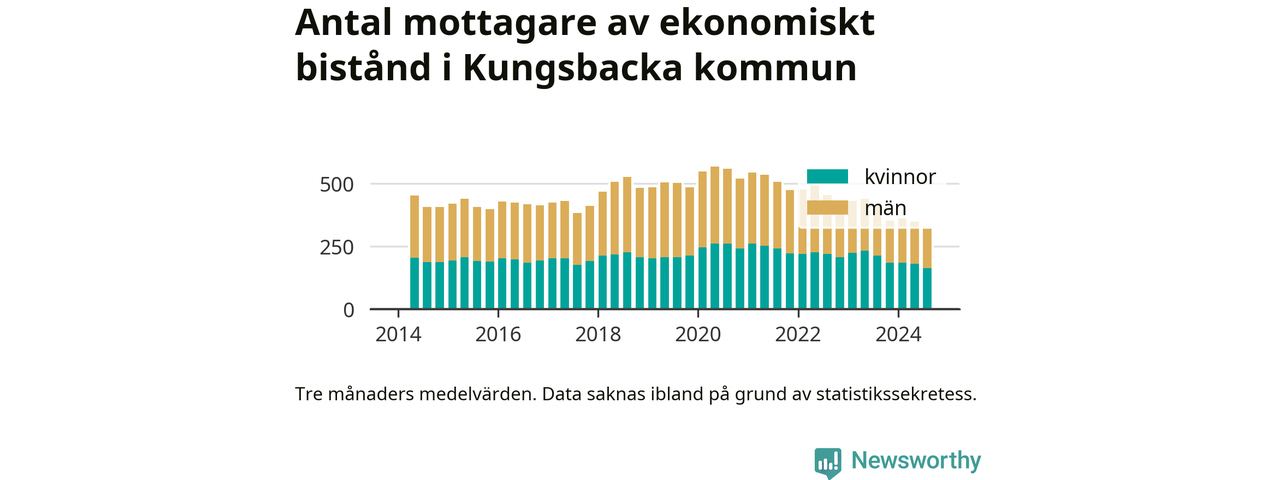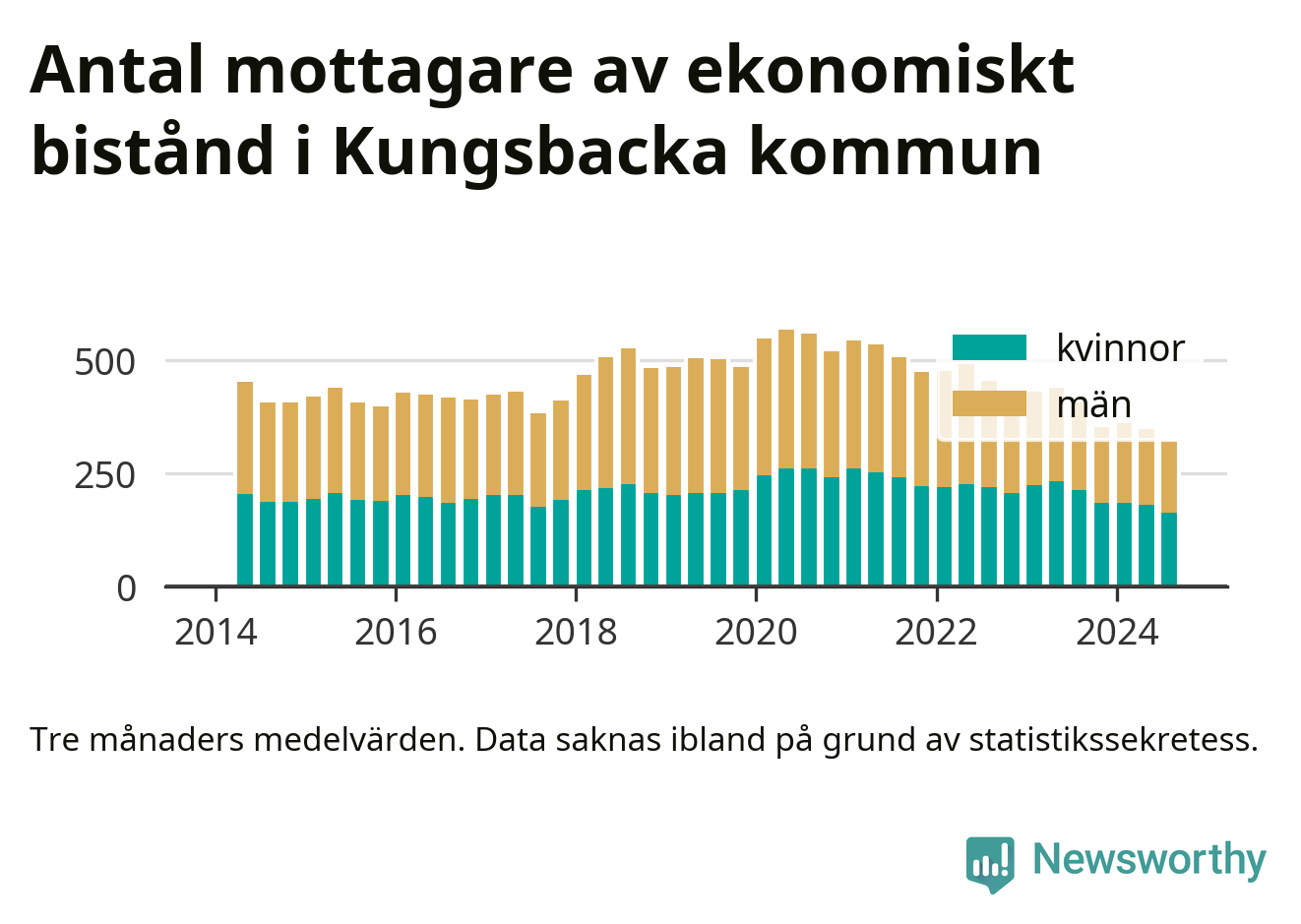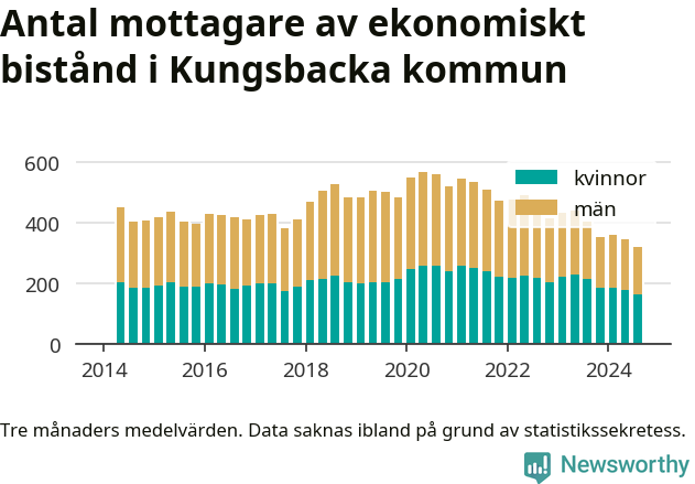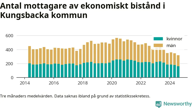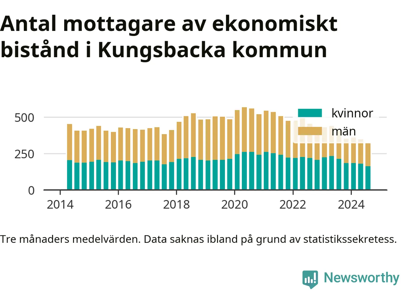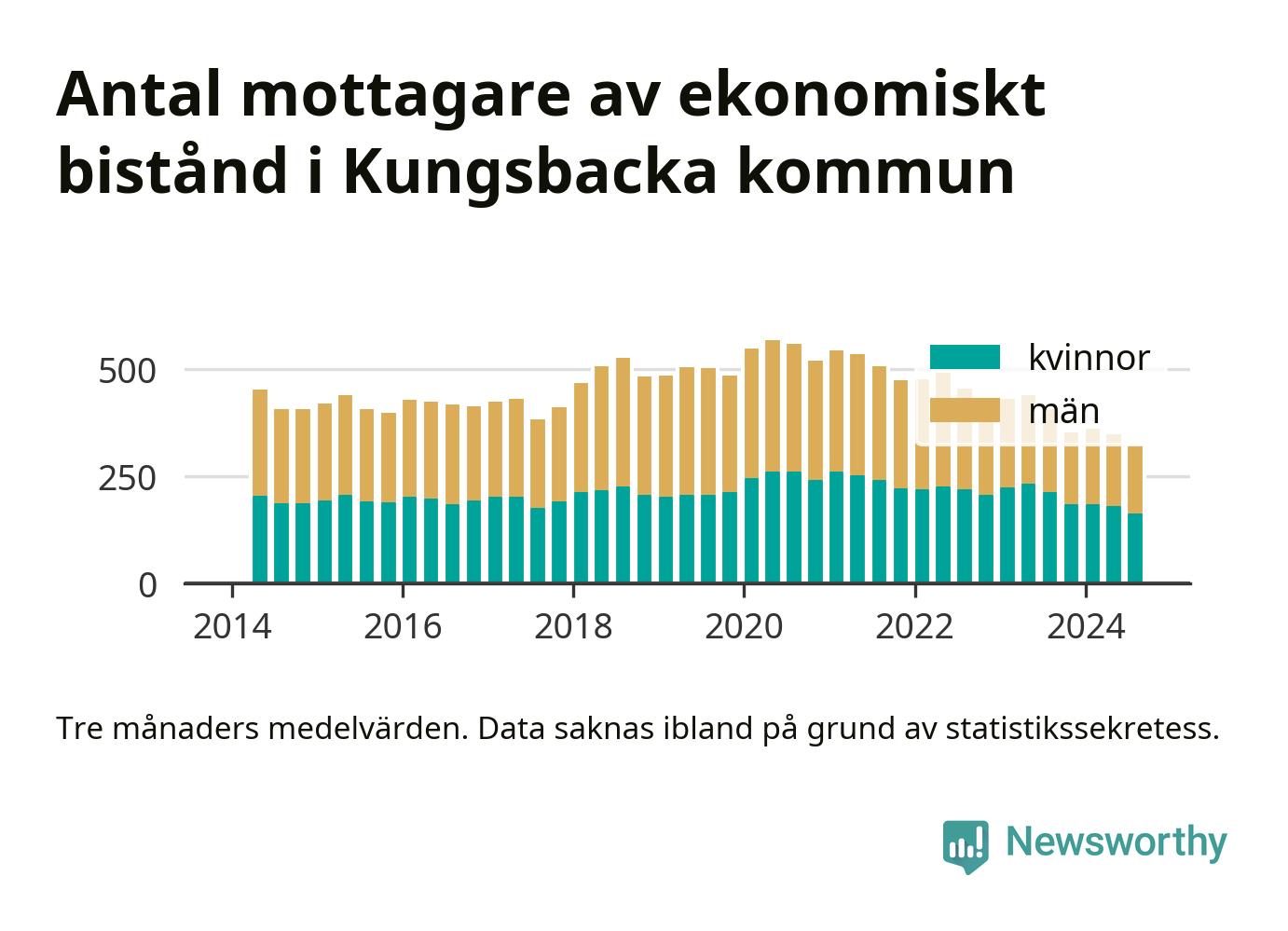 I genomsnitt 321 personer per månad fick ekonomiskt bistånd i Kungsbacka kommun under sommarmånaderna (juni till augusti), vilket motsvarar 0,4 procent av den vuxna befolkningen. Det är marginellt mindre än i våras, och något mindre andel än under sommaren för ett år sedan.