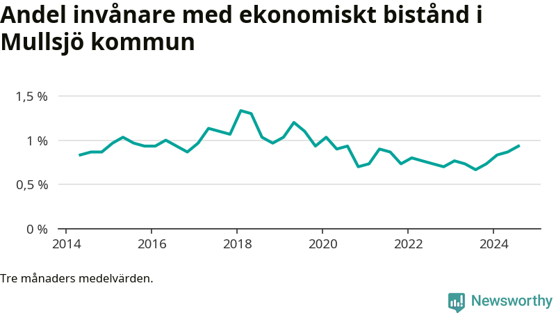 Den högsta andelen biståndstagare under det senaste decenniet hade kommunen under vintern 2018 (1,3 procent), och den lägsta andelen under sommaren 2023 (0,7 procent).
