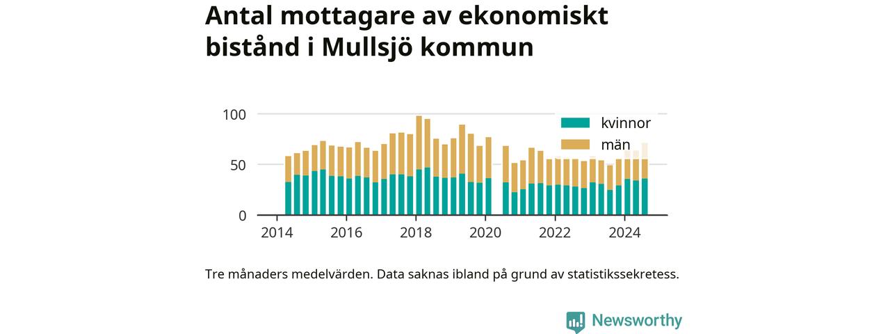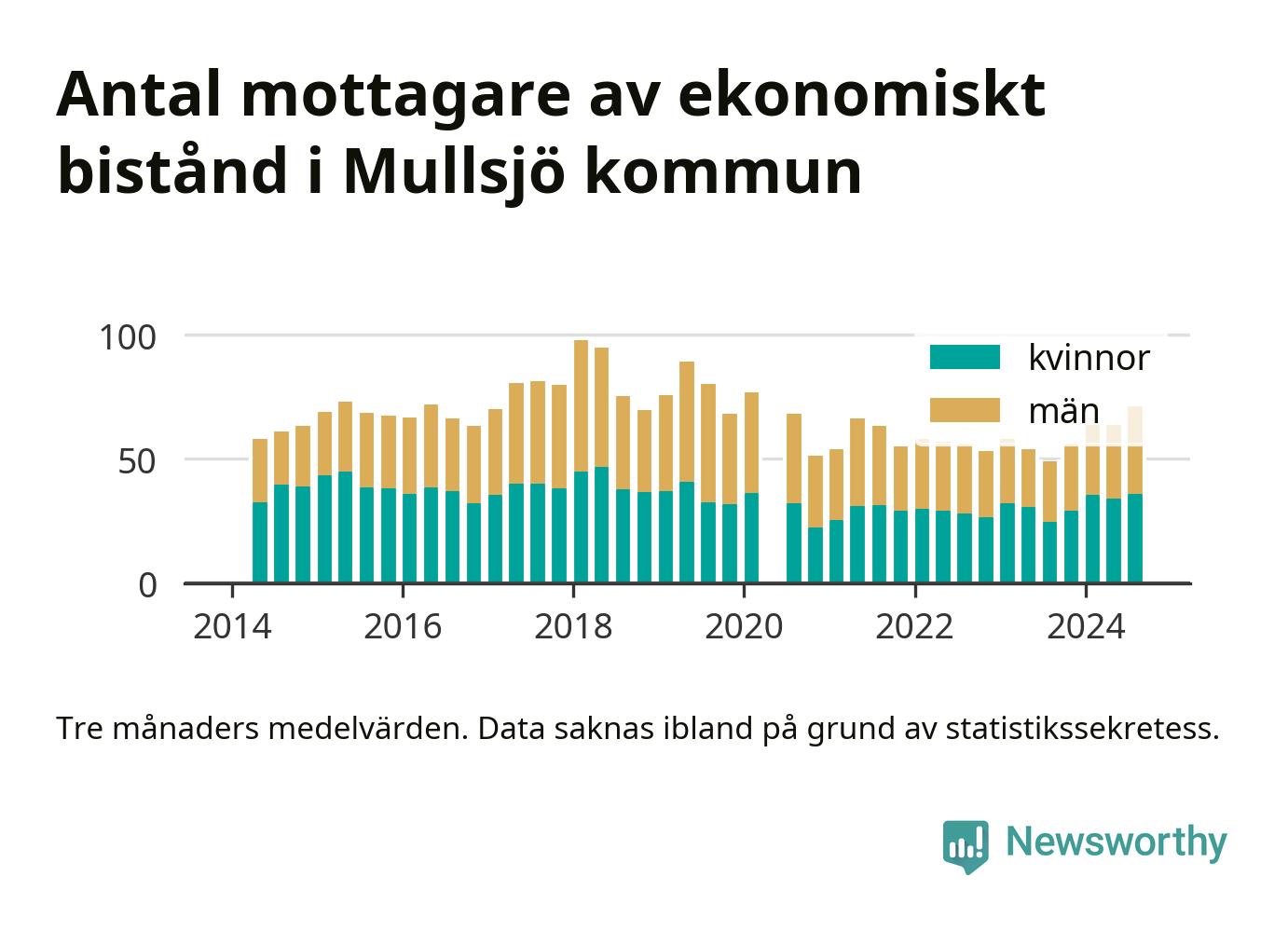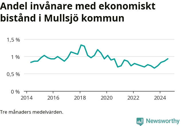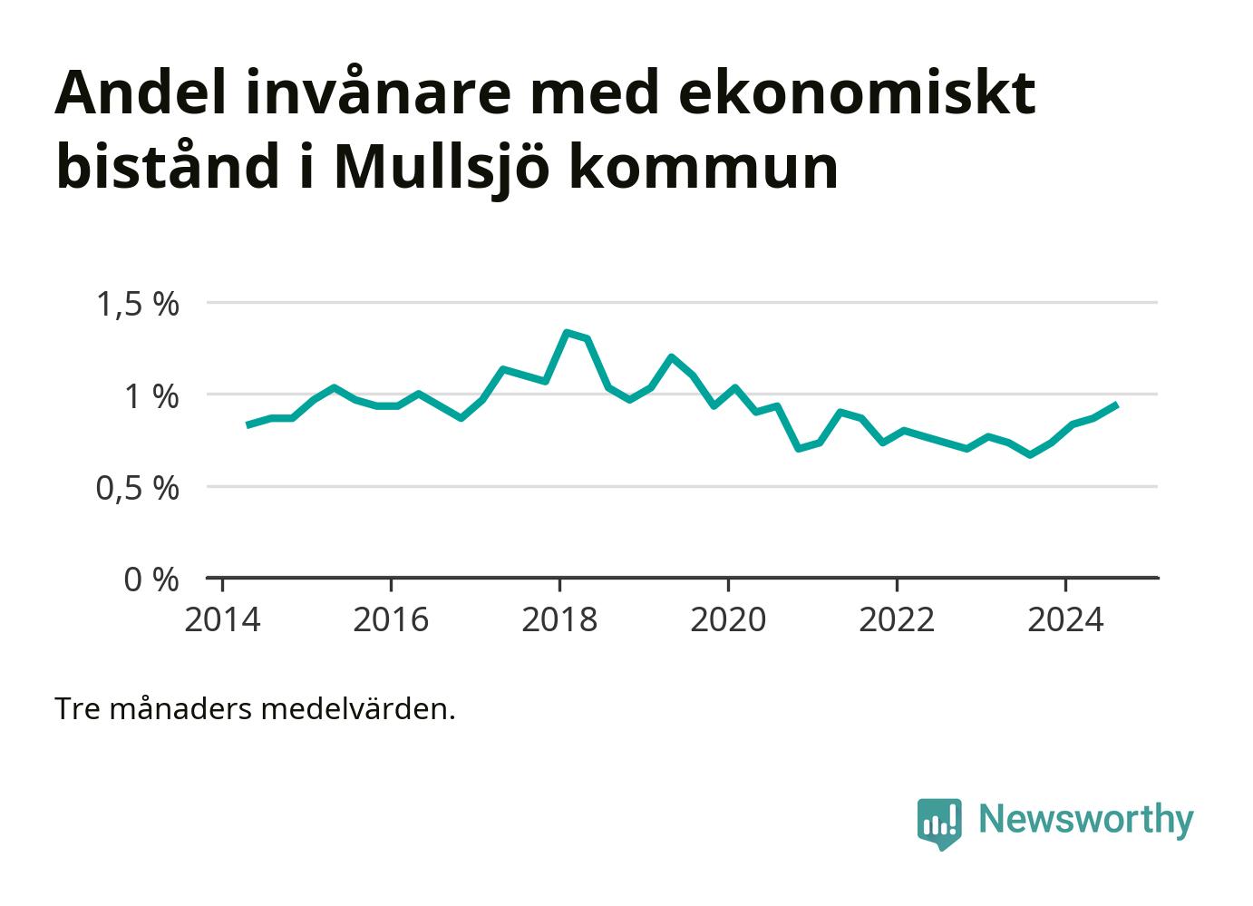 I genomsnitt 71 personer per månad fick ekonomiskt bistånd i Mullsjö kommun under sommarmånaderna (juni till augusti), vilket motsvarar 0,9 procent av den vuxna befolkningen. Det är marginellt mer än i våras, och något större andel än under sommaren för ett år sedan.