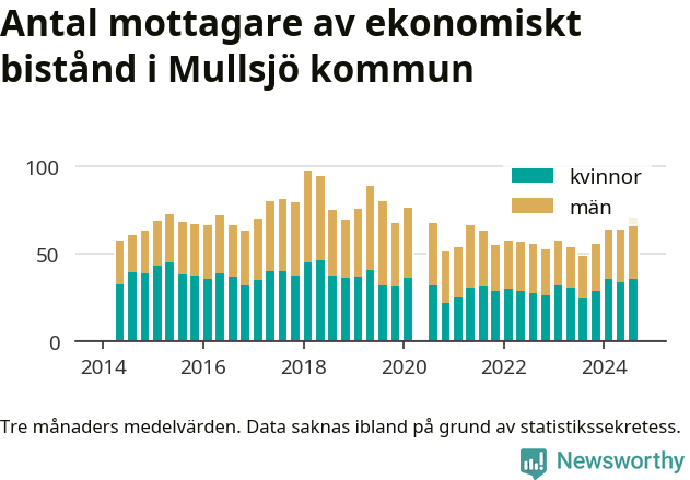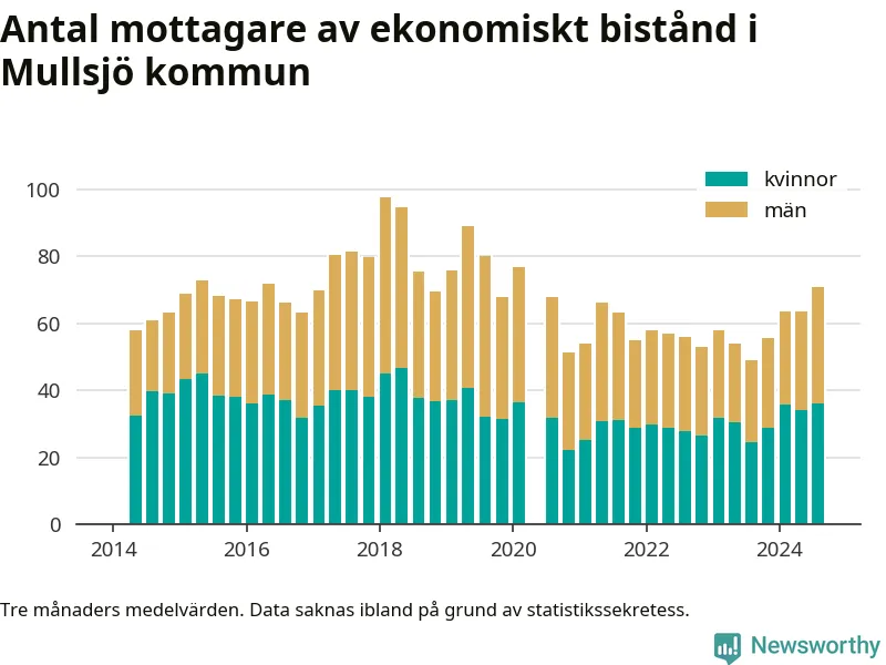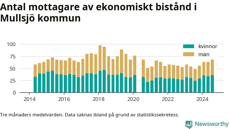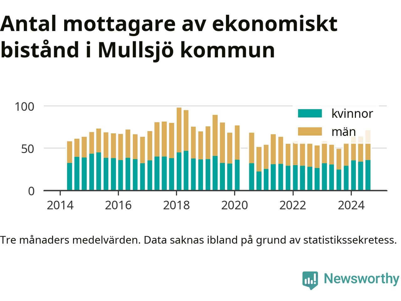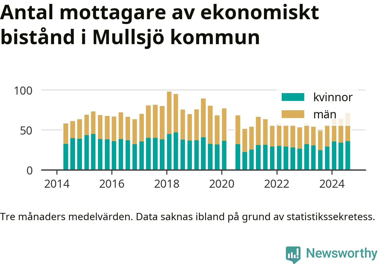 I genomsnitt 71 personer per månad fick ekonomiskt bistånd i Mullsjö kommun under sommarmånaderna (juni till augusti), vilket motsvarar 0,9 procent av den vuxna befolkningen. Det är marginellt mer än i våras, och något större andel än under sommaren för ett år sedan.