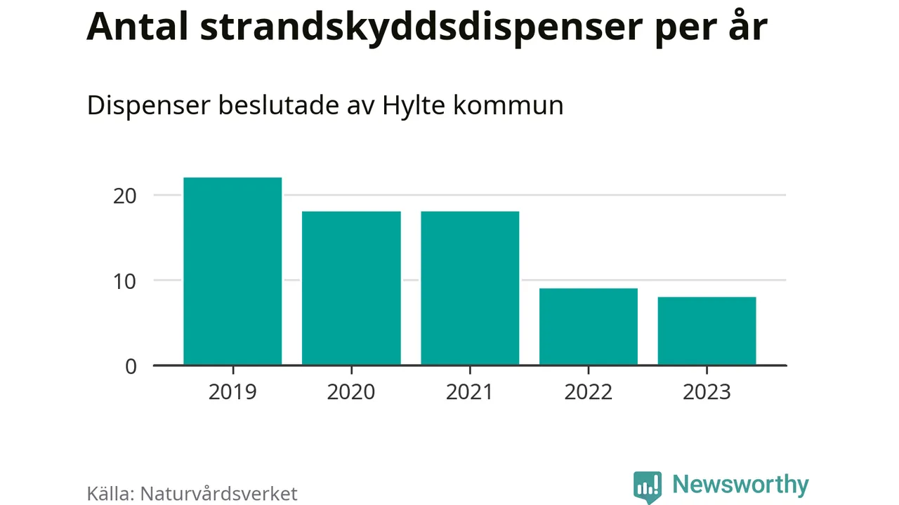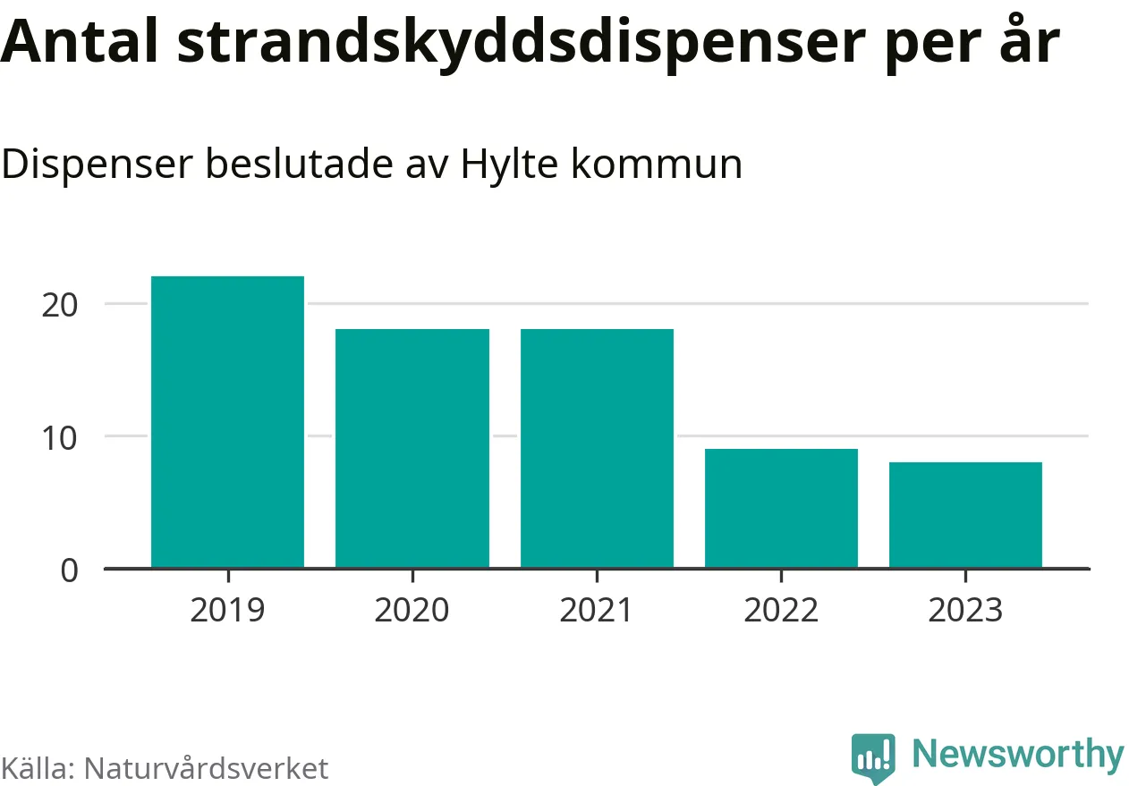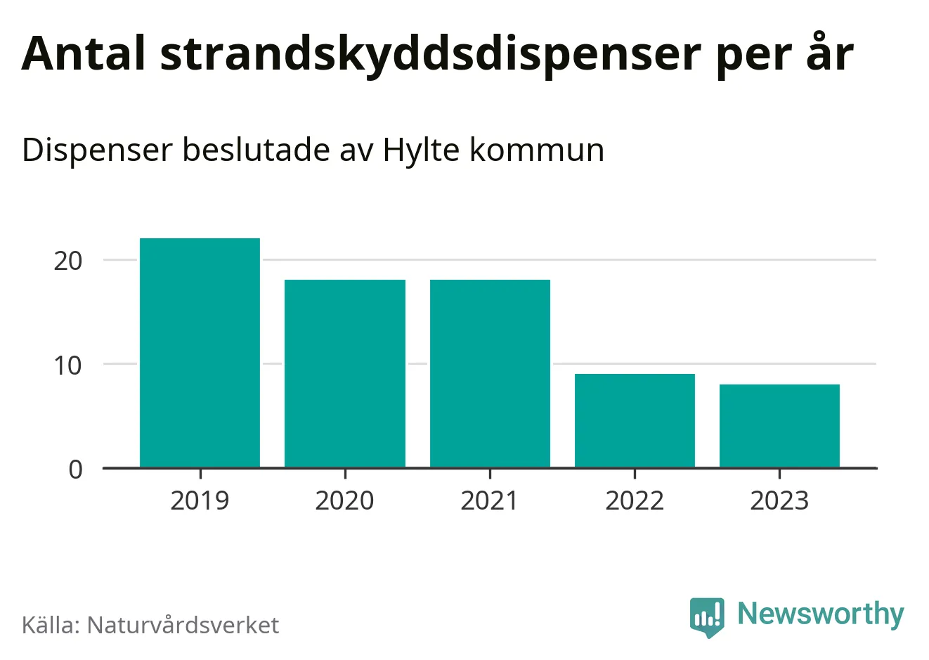 Den som vill bygga nära vatten behöver dispens från strandskyddet, lagstiftningen som ska säkra allmänhetens tillgång till stränderna och bevara livsvillkor för djur och växter. I de flesta fall är det kommunerna som godkänner dispenserna, och under de senaste fem åren har Hylte kommun fattat 75 beslut för totalt 82 åtgärder inom strandskyddat område, enligt den sammanställning Naturvårdsverket varje år gör. Det är inte en siffra som sticker ut särskilt jämfört med andra kommuner. Flest dispenser i Hallands län har godkänts i Kungsbacka – 211 stycken.