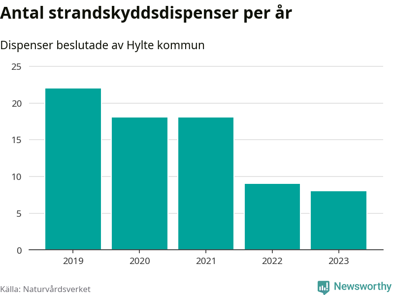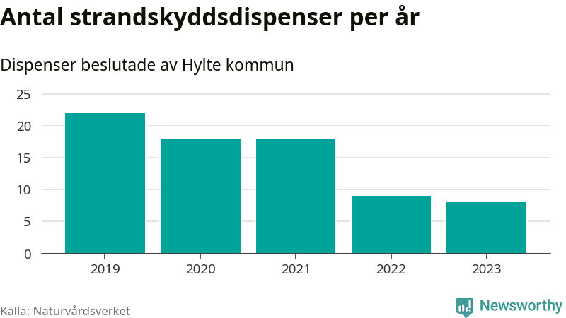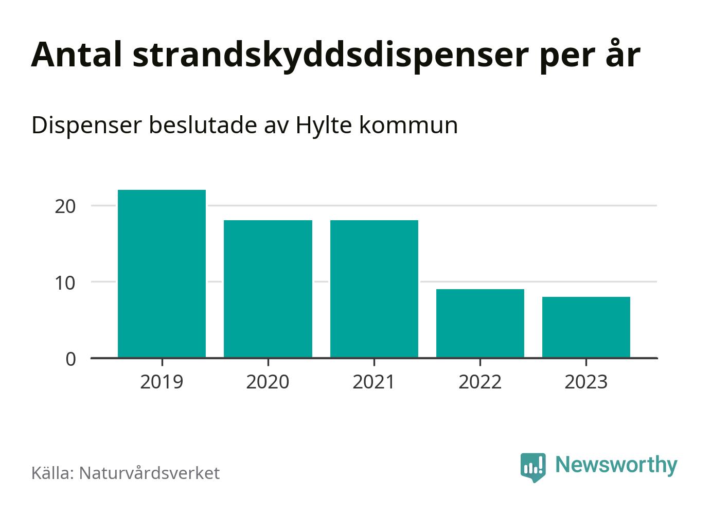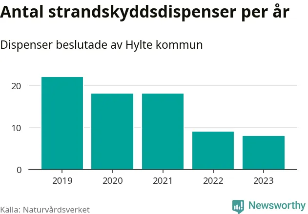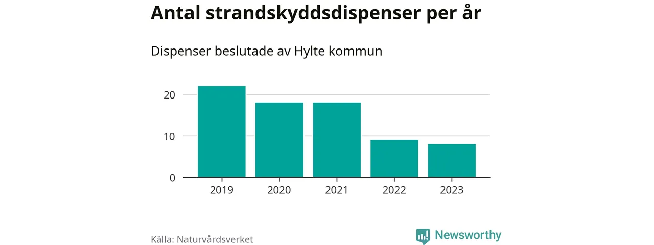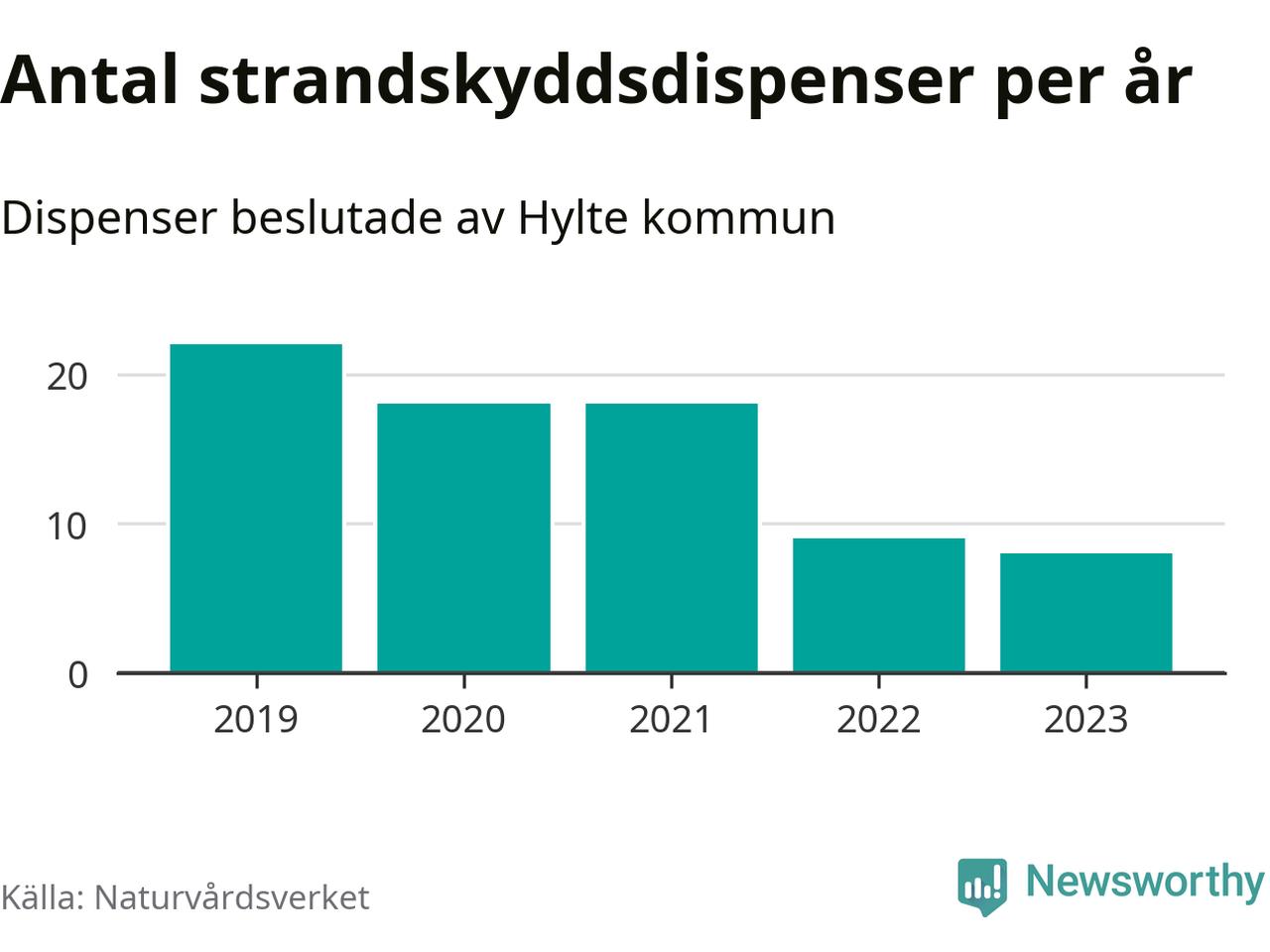 Den som vill bygga nära vatten behöver dispens från strandskyddet, lagstiftningen som ska säkra allmänhetens tillgång till stränderna och bevara livsvillkor för djur och växter. I de flesta fall är det kommunerna som godkänner dispenserna, och under de senaste fem åren har Hylte kommun fattat 75 beslut för totalt 82 åtgärder inom strandskyddat område, enligt den sammanställning Naturvårdsverket varje år gör. Det är inte en siffra som sticker ut särskilt jämfört med andra kommuner. Flest dispenser i Hallands län har godkänts i Kungsbacka – 211 stycken.