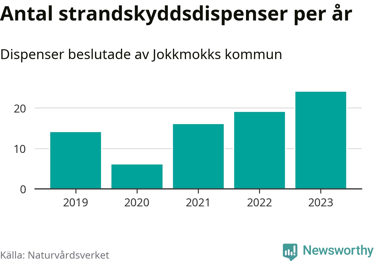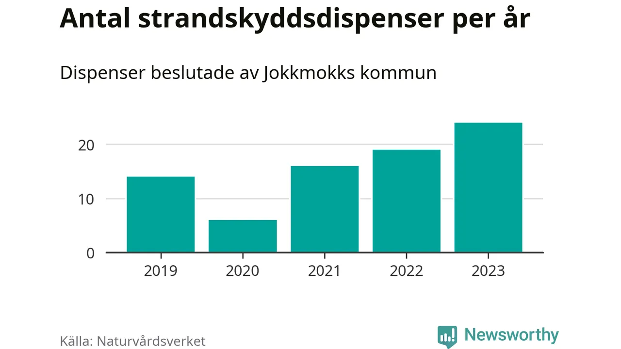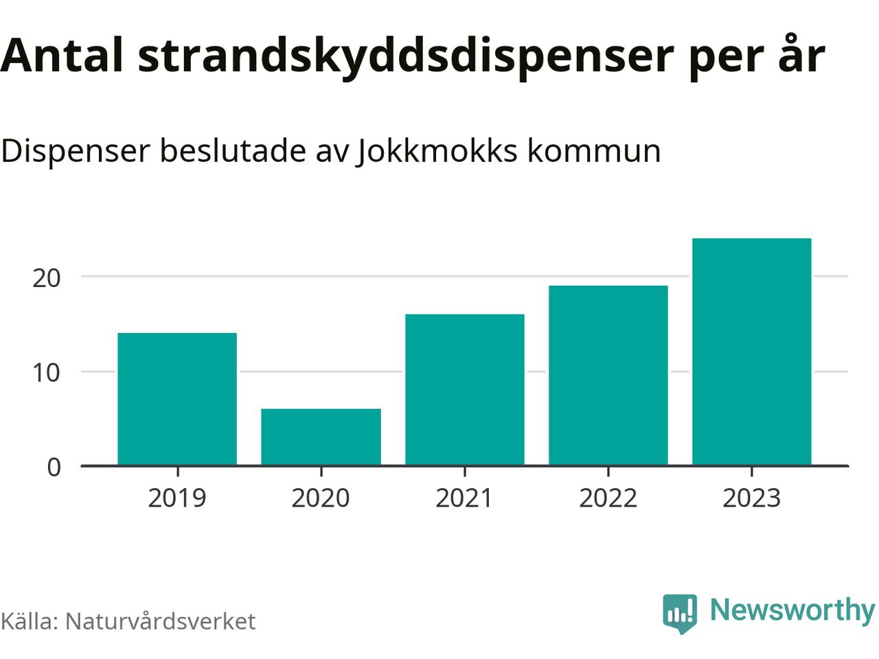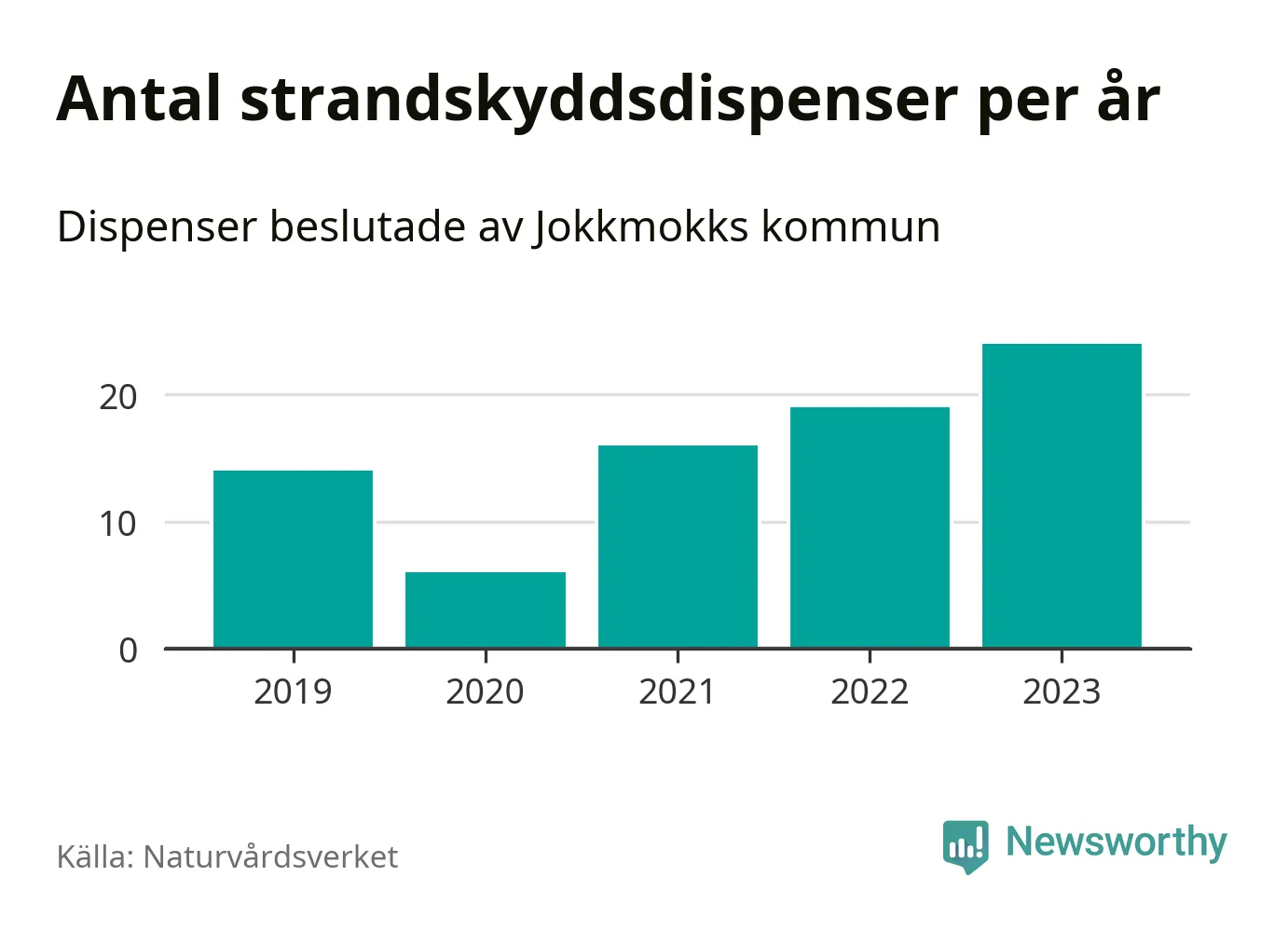 Den som vill bygga nära vatten behöver dispens från strandskyddet, lagstiftningen som ska säkra allmänhetens tillgång till stränderna och bevara livsvillkor för djur och växter. I de flesta fall är det kommunerna som godkänner dispenserna, och under de senaste fem åren har Jokkmokks kommun fattat 79 beslut för totalt 100 åtgärder inom strandskyddat område, enligt den sammanställning Naturvårdsverket varje år gör. Det är inte en siffra som sticker ut särskilt jämfört med andra kommuner. Flest dispenser i Norrbottens län har godkänts i Luleå – 199 stycken.