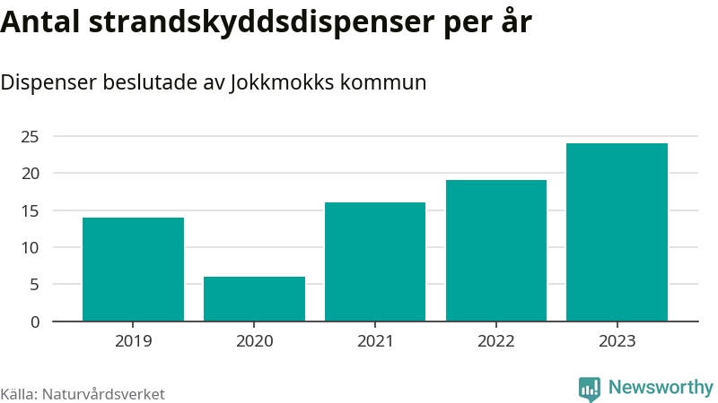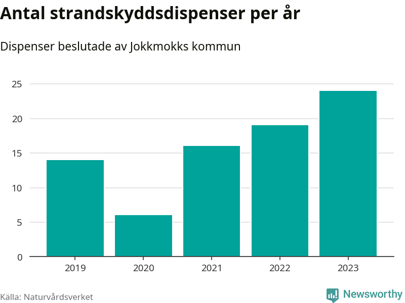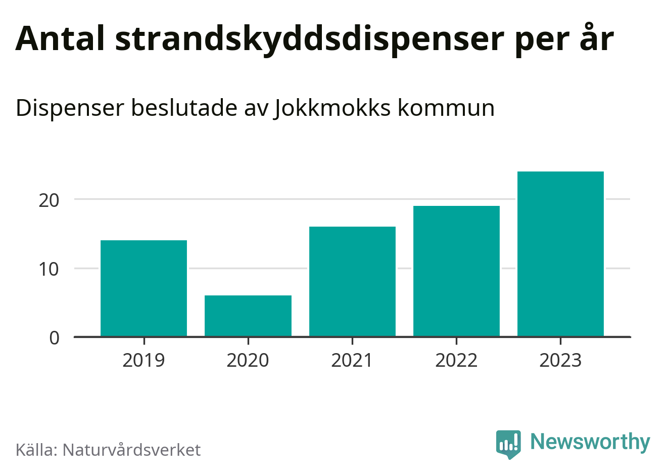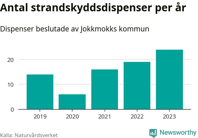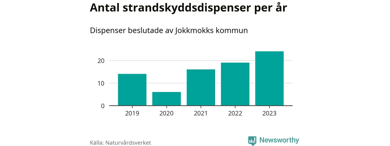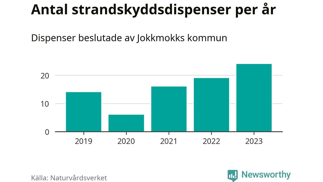 Den som vill bygga nära vatten behöver dispens från strandskyddet, lagstiftningen som ska säkra allmänhetens tillgång till stränderna och bevara livsvillkor för djur och växter. I de flesta fall är det kommunerna som godkänner dispenserna, och under de senaste fem åren har Jokkmokks kommun fattat 79 beslut för totalt 100 åtgärder inom strandskyddat område, enligt den sammanställning Naturvårdsverket varje år gör. Det är inte en siffra som sticker ut särskilt jämfört med andra kommuner. Flest dispenser i Norrbottens län har godkänts i Luleå – 199 stycken.