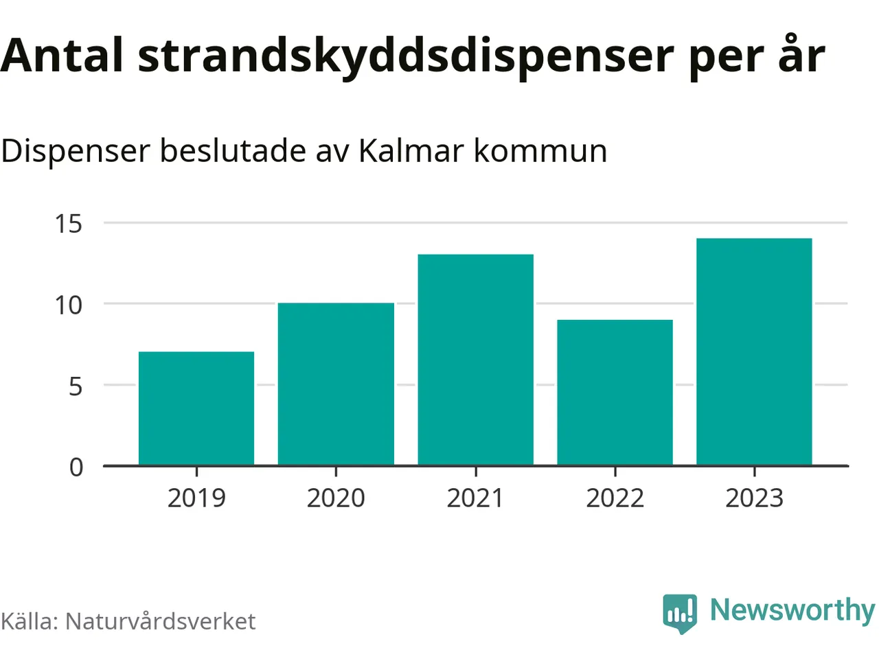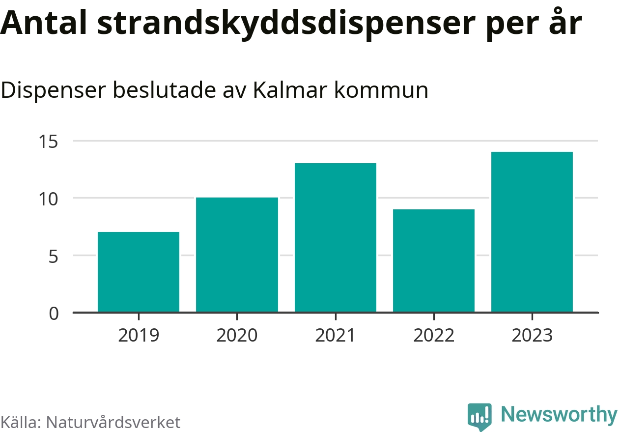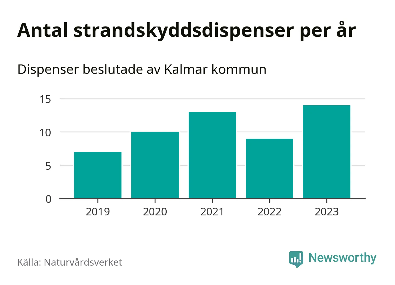 Den som vill bygga nära vatten behöver dispens från strandskyddet, lagstiftningen som ska säkra allmänhetens tillgång till stränderna och bevara livsvillkor för djur och växter. I de flesta fall är det kommunerna som godkänner dispenserna, och under de senaste fem åren har Kalmar kommun fattat 53 beslut för totalt 83 åtgärder inom strandskyddat område, enligt den sammanställning Naturvårdsverket varje år gör. Det är inte en siffra som sticker ut särskilt jämfört med andra kommuner. Flest dispenser i Kalmar län har godkänts i Västervik – 178 stycken.