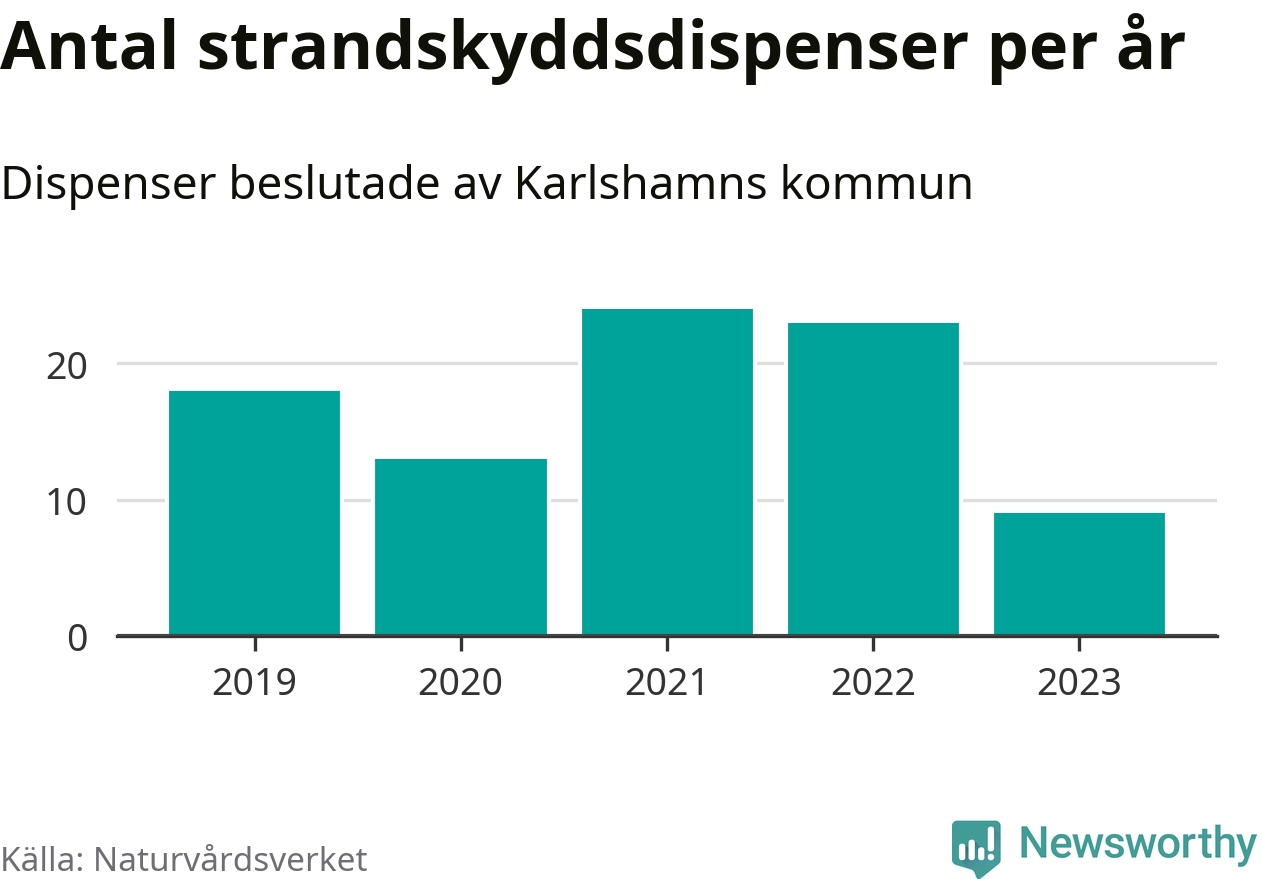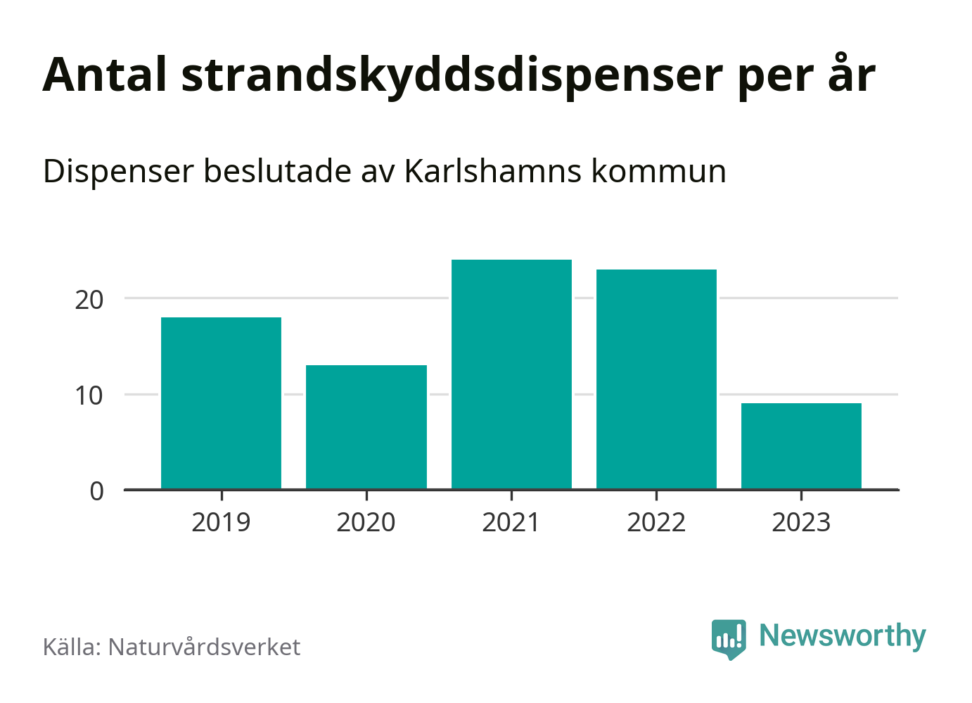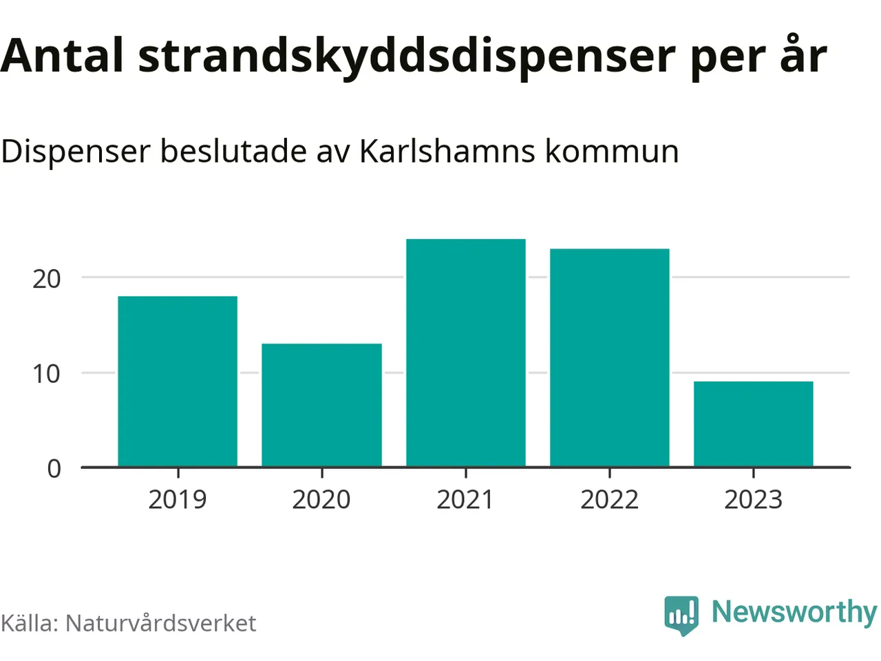 Den som vill bygga nära vatten behöver dispens från strandskyddet, lagstiftningen som ska säkra allmänhetens tillgång till stränderna och bevara livsvillkor för djur och växter. I de flesta fall är det kommunerna som godkänner dispenserna, och under de senaste fem åren har Karlshamns kommun fattat 87 beslut för totalt 114 åtgärder inom strandskyddat område, enligt den sammanställning Naturvårdsverket varje år gör. Det är inte en siffra som sticker ut särskilt jämfört med andra kommuner. Flest dispenser i länet har godkänts i Karlskrona – 132 stycken.