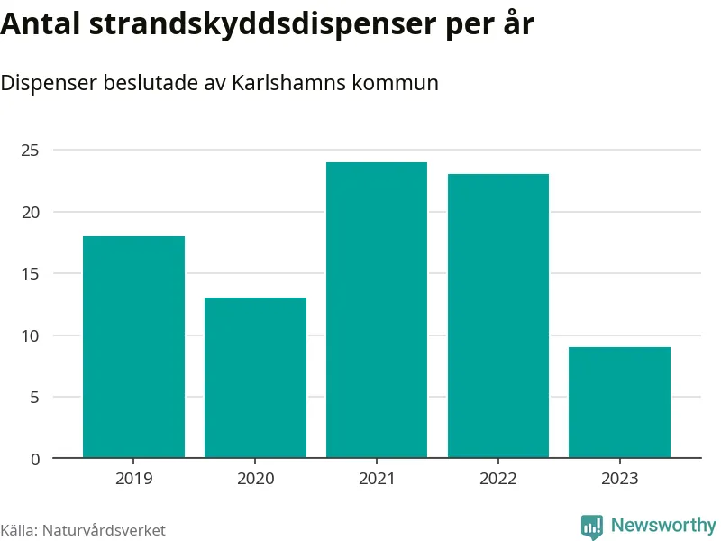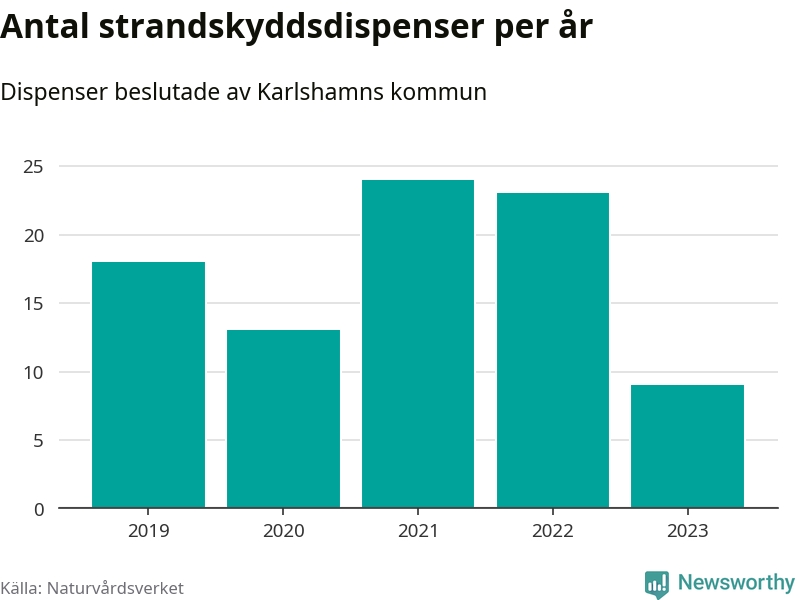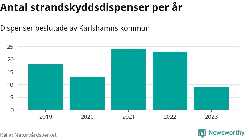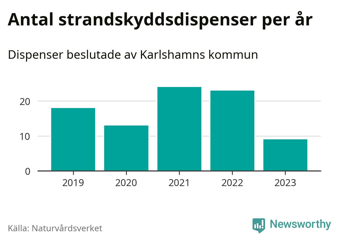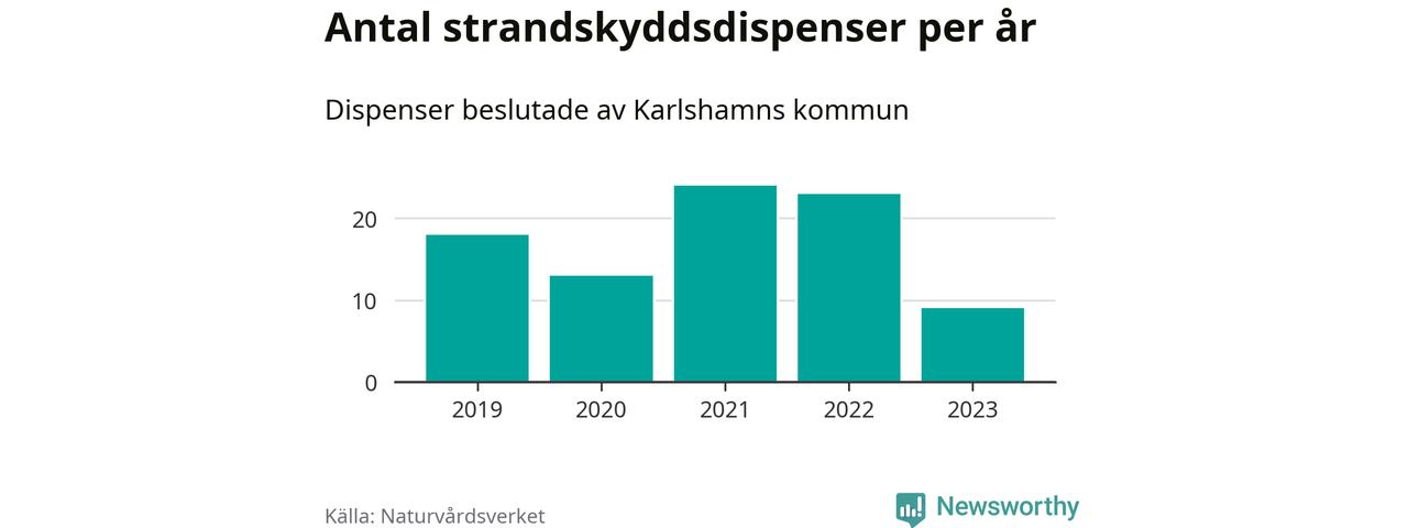 Den som vill bygga nära vatten behöver dispens från strandskyddet, lagstiftningen som ska säkra allmänhetens tillgång till stränderna och bevara livsvillkor för djur och växter. I de flesta fall är det kommunerna som godkänner dispenserna, och under de senaste fem åren har Karlshamns kommun fattat 87 beslut för totalt 114 åtgärder inom strandskyddat område, enligt den sammanställning Naturvårdsverket varje år gör. Det är inte en siffra som sticker ut särskilt jämfört med andra kommuner. Flest dispenser i länet har godkänts i Karlskrona – 132 stycken.