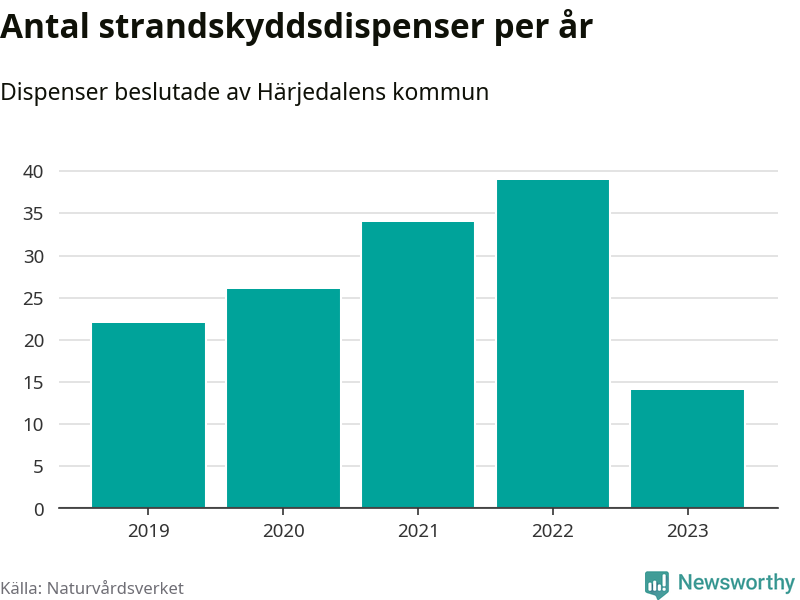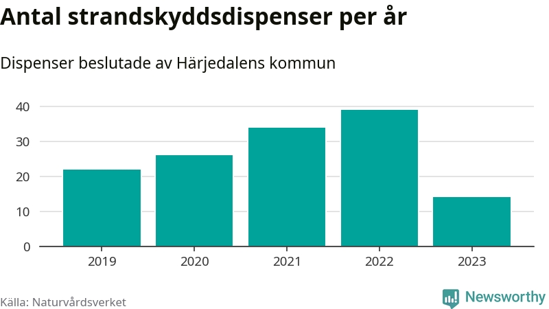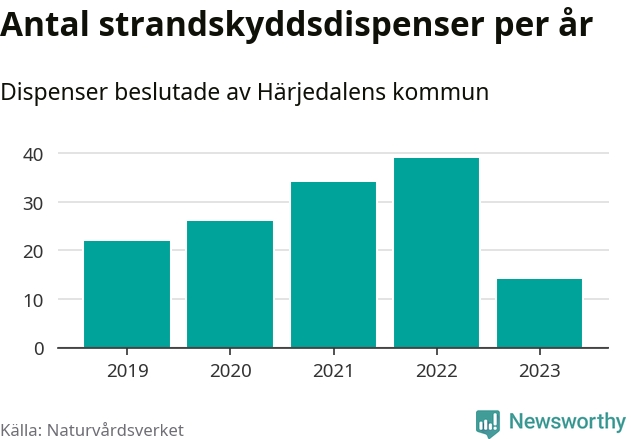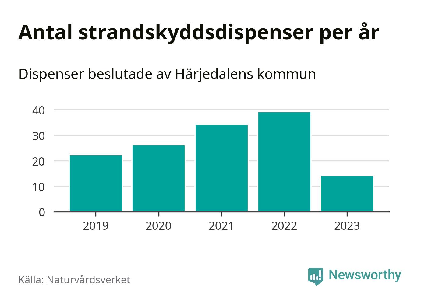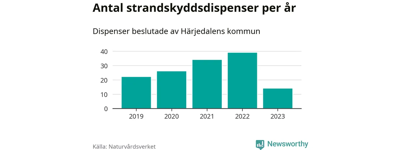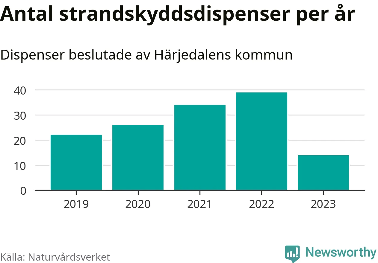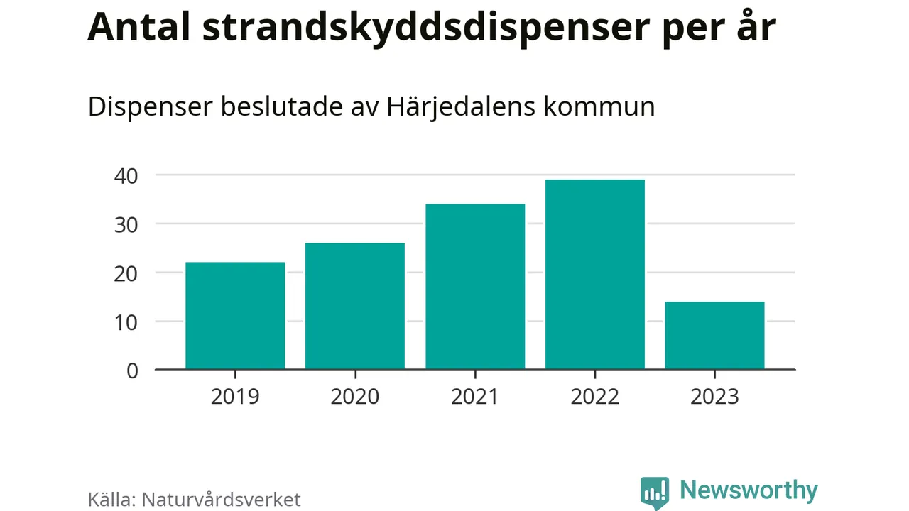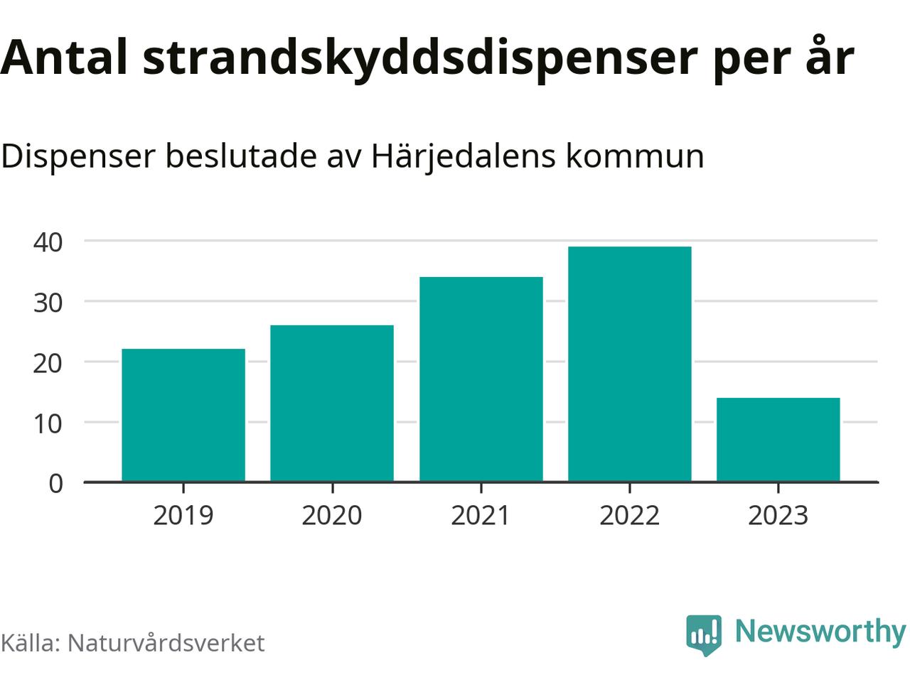 Den som vill bygga nära vatten behöver dispens från strandskyddet, lagstiftningen som ska säkra allmänhetens tillgång till stränderna och bevara livsvillkor för djur och växter. I de flesta fall är det kommunerna som godkänner dispenserna, och under de senaste fem åren har Härjedalens kommun fattat 135 beslut för totalt 184 åtgärder inom strandskyddat område, enligt den sammanställning Naturvårdsverket varje år gör. Det är fler än i de flesta kommuner i landet. Flest dispenser i Jämtlands län har godkänts i Åre – 150 stycken.