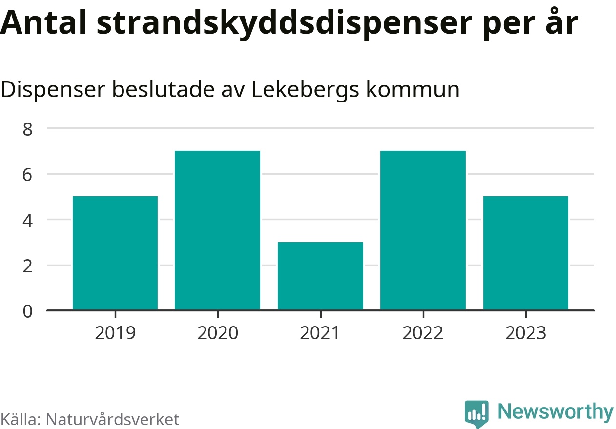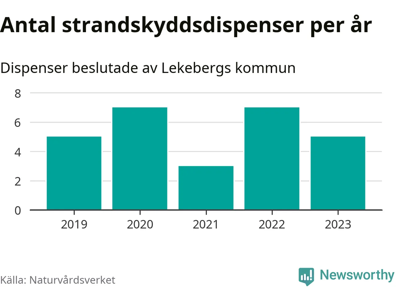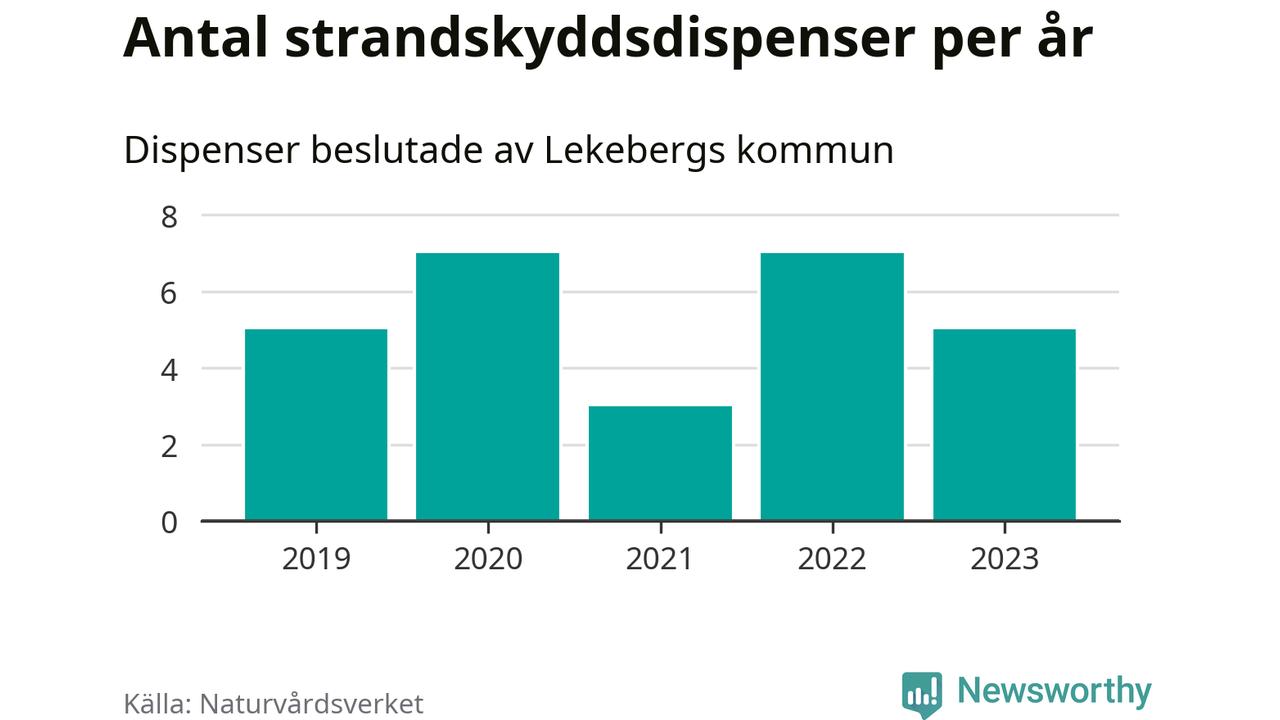 Den som vill bygga nära vatten behöver dispens från strandskyddet, lagstiftningen som ska säkra allmänhetens tillgång till stränderna och bevara livsvillkor för djur och växter. I de flesta fall är det kommunerna som godkänner dispenserna, och under de senaste fem åren har Lekebergs kommun fattat 27 beslut för totalt 31 åtgärder inom strandskyddat område, enligt den sammanställning Naturvårdsverket varje år gör. Det är färre än i de flesta kommuner i landet. Flest dispenser i Örebro län har godkänts i Askersund – 91 stycken.