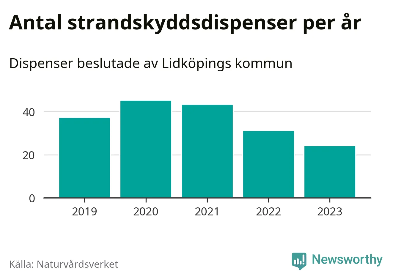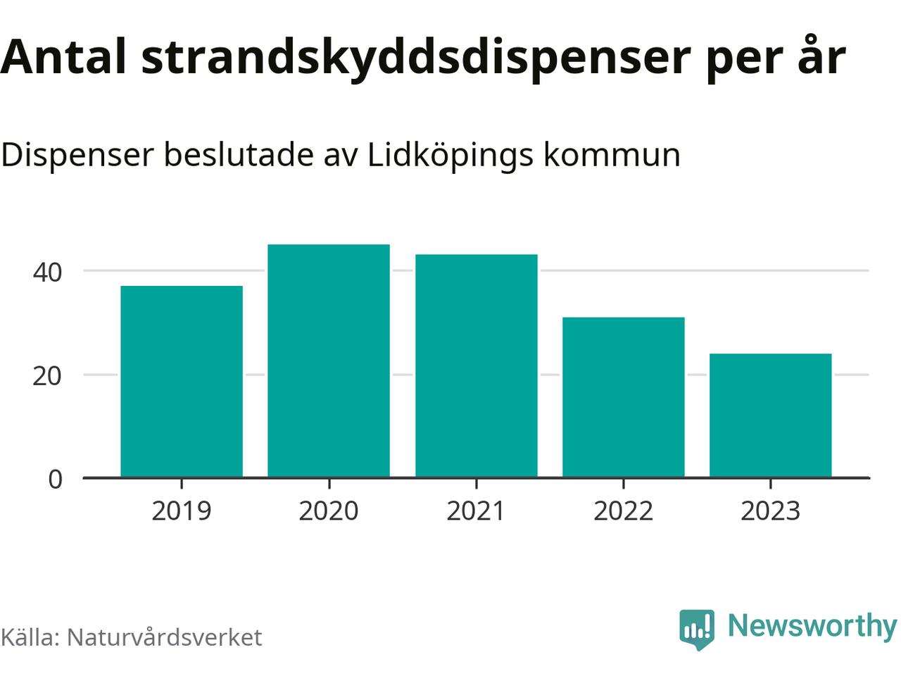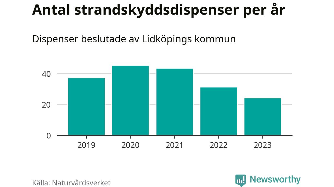 Den som vill bygga nära vatten behöver dispens från strandskyddet, lagstiftningen som ska säkra allmänhetens tillgång till stränderna och bevara livsvillkor för djur och växter. I de flesta fall är det kommunerna som godkänner dispenserna, och under de senaste fem åren har Lidköpings kommun fattat 180 beslut för totalt 309 åtgärder inom strandskyddat område, enligt den sammanställning Naturvårdsverket varje år gör. Det är fler än i de flesta kommuner i landet. Flest dispenser i Västra Götalands län har godkänts i Borås – 220 stycken.