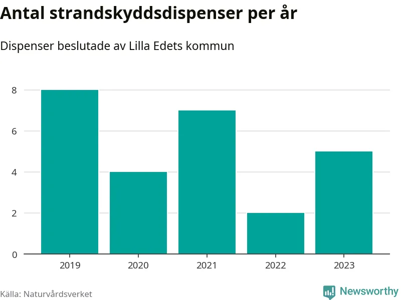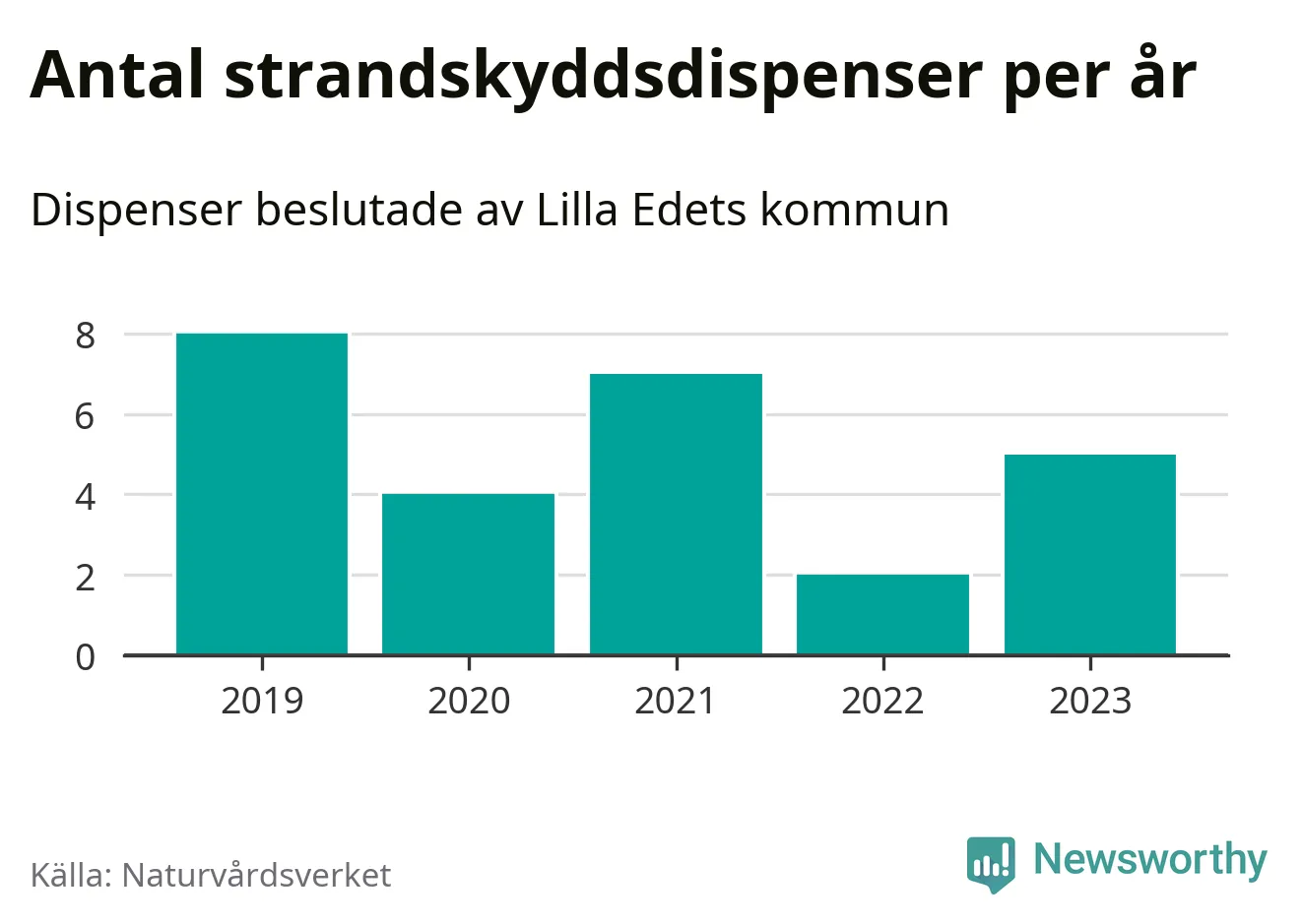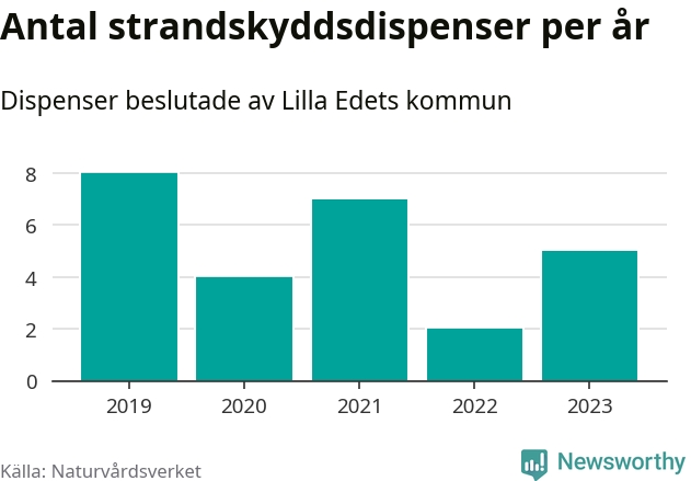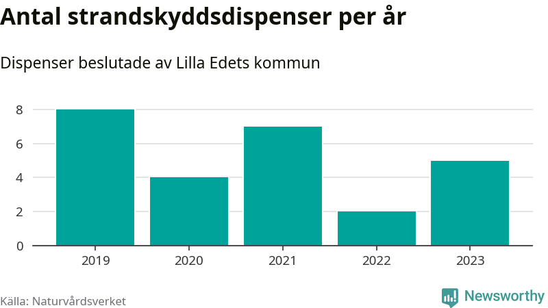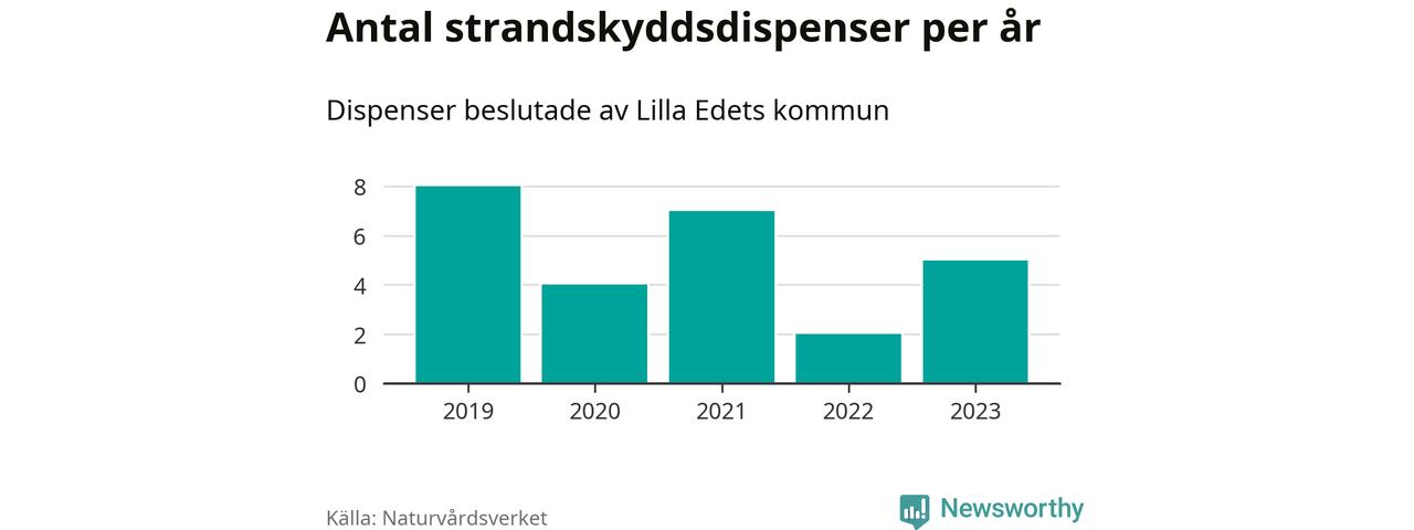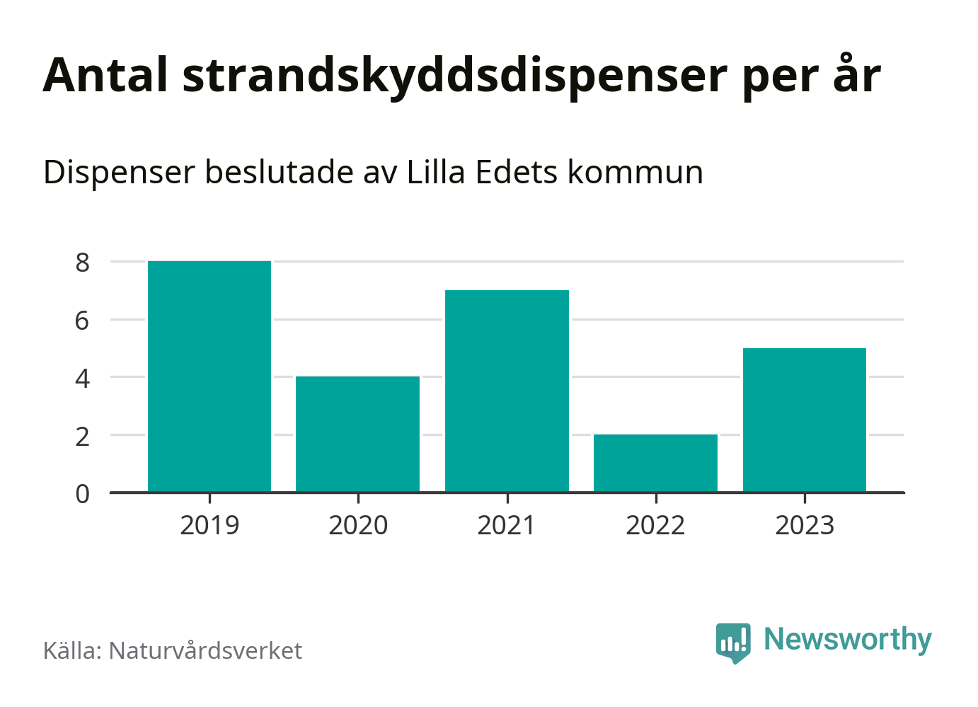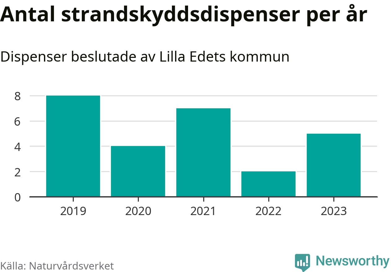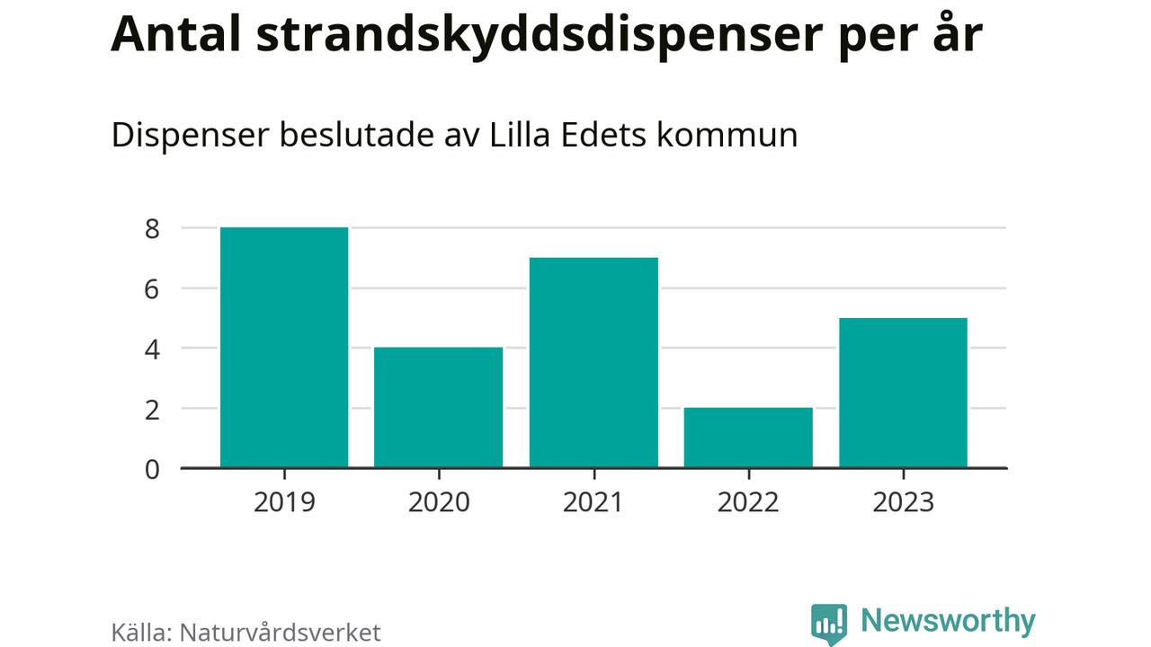 Den som vill bygga nära vatten behöver dispens från strandskyddet, lagstiftningen som ska säkra allmänhetens tillgång till stränderna och bevara livsvillkor för djur och växter. I de flesta fall är det kommunerna som godkänner dispenserna, och under de senaste fem åren har Lilla Edets kommun fattat 26 beslut för totalt 44 åtgärder inom strandskyddat område, enligt den sammanställning Naturvårdsverket varje år gör. Det är färre än i de flesta kommuner i landet. Flest dispenser i Västra Götalands län har godkänts i Borås – 220 stycken.