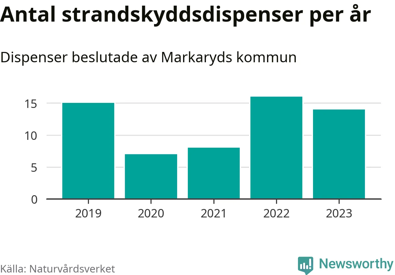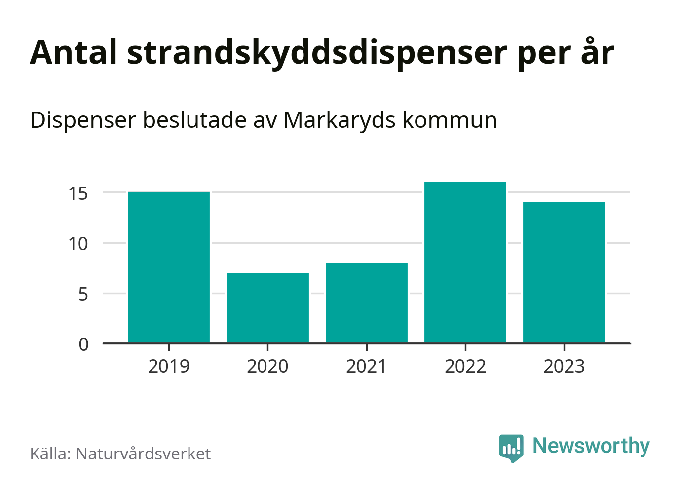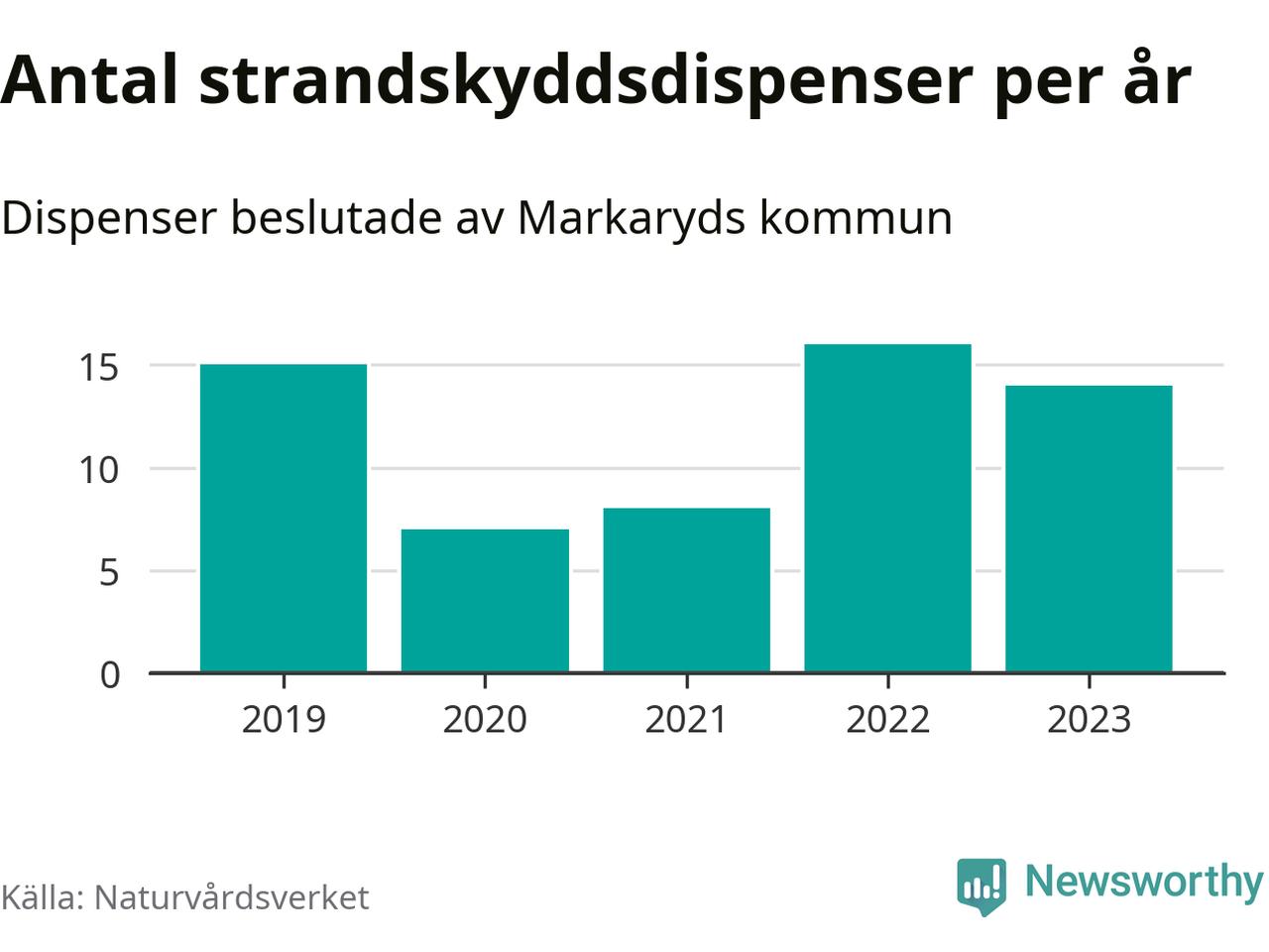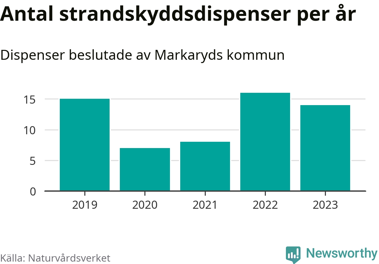 Den som vill bygga nära vatten behöver dispens från strandskyddet, lagstiftningen som ska säkra allmänhetens tillgång till stränderna och bevara livsvillkor för djur och växter. I de flesta fall är det kommunerna som godkänner dispenserna, och under de senaste fem åren har Markaryds kommun fattat 60 beslut för totalt 65 åtgärder inom strandskyddat område, enligt den sammanställning Naturvårdsverket varje år gör. Det är inte en siffra som sticker ut särskilt jämfört med andra kommuner. Flest dispenser i Kronobergs län har godkänts i Växjö – 142 stycken.