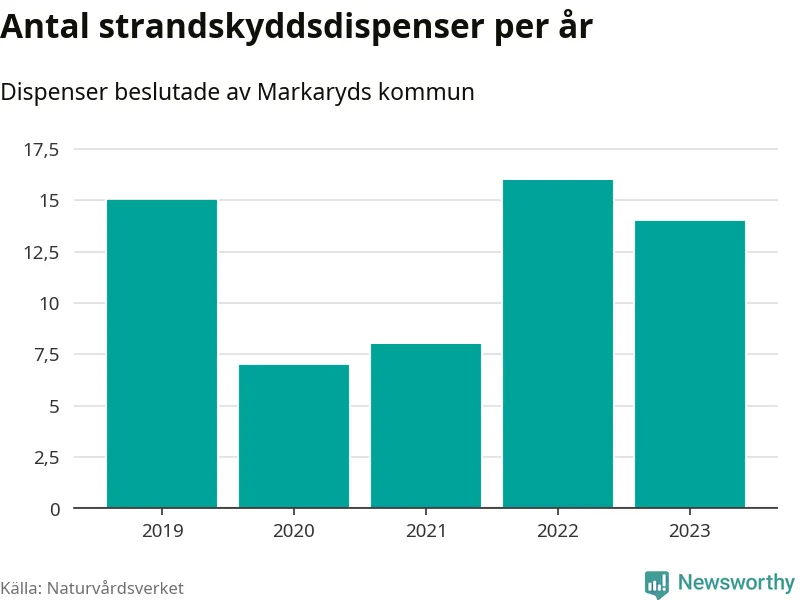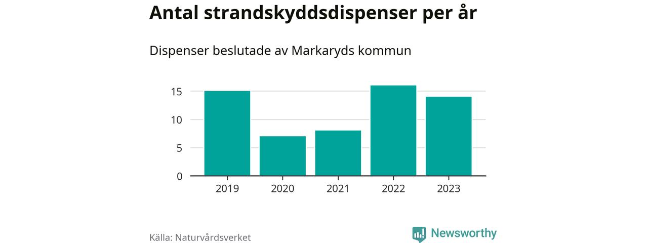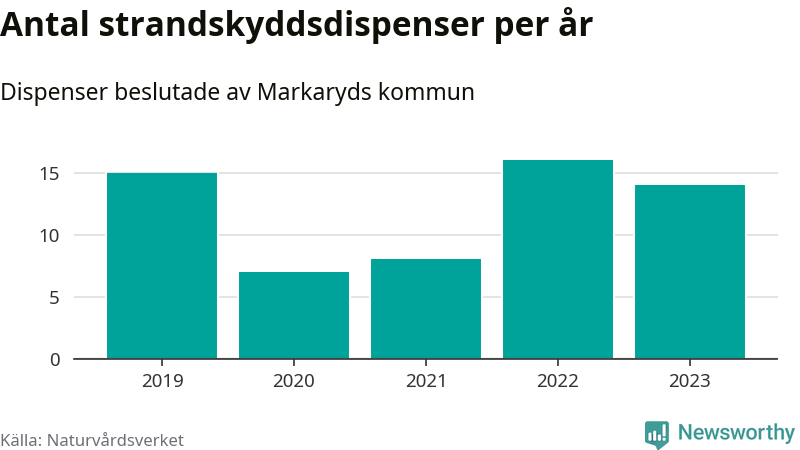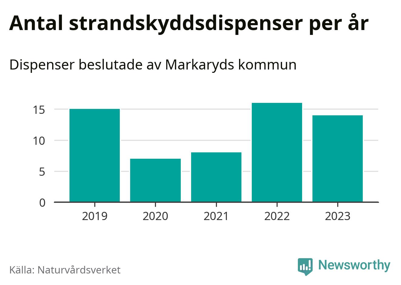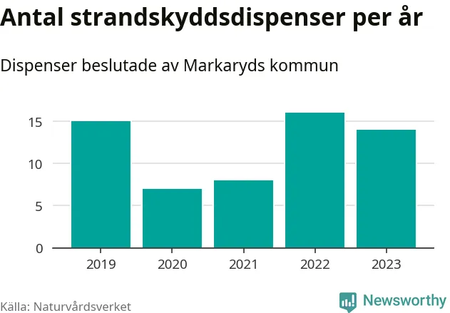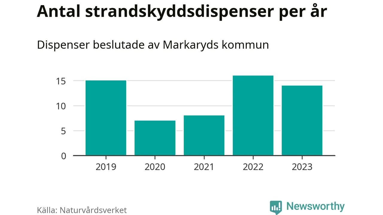 Den som vill bygga nära vatten behöver dispens från strandskyddet, lagstiftningen som ska säkra allmänhetens tillgång till stränderna och bevara livsvillkor för djur och växter. I de flesta fall är det kommunerna som godkänner dispenserna, och under de senaste fem åren har Markaryds kommun fattat 60 beslut för totalt 65 åtgärder inom strandskyddat område, enligt den sammanställning Naturvårdsverket varje år gör. Det är inte en siffra som sticker ut särskilt jämfört med andra kommuner. Flest dispenser i Kronobergs län har godkänts i Växjö – 142 stycken.