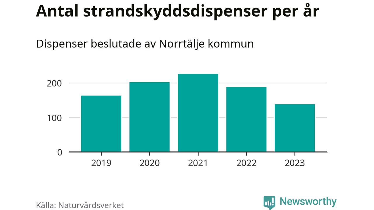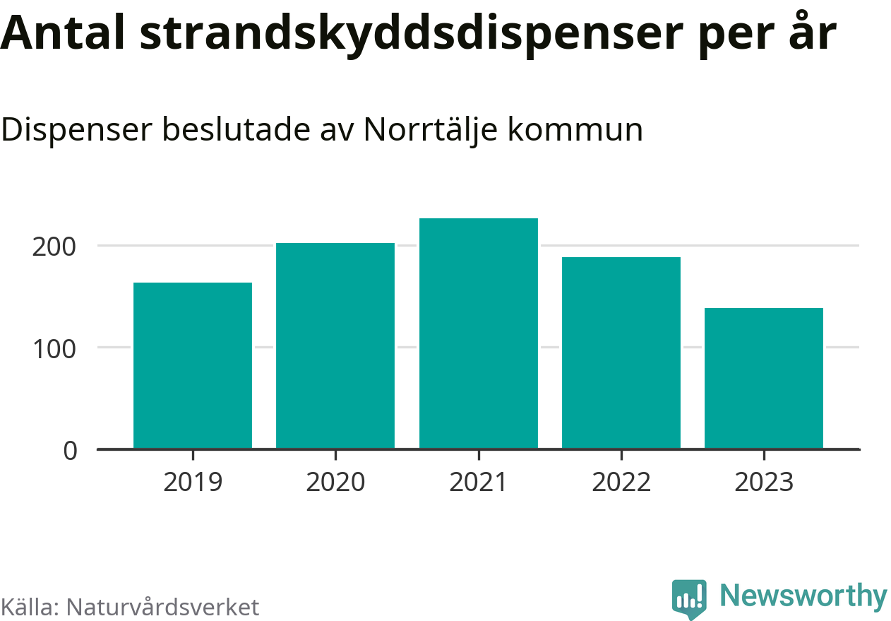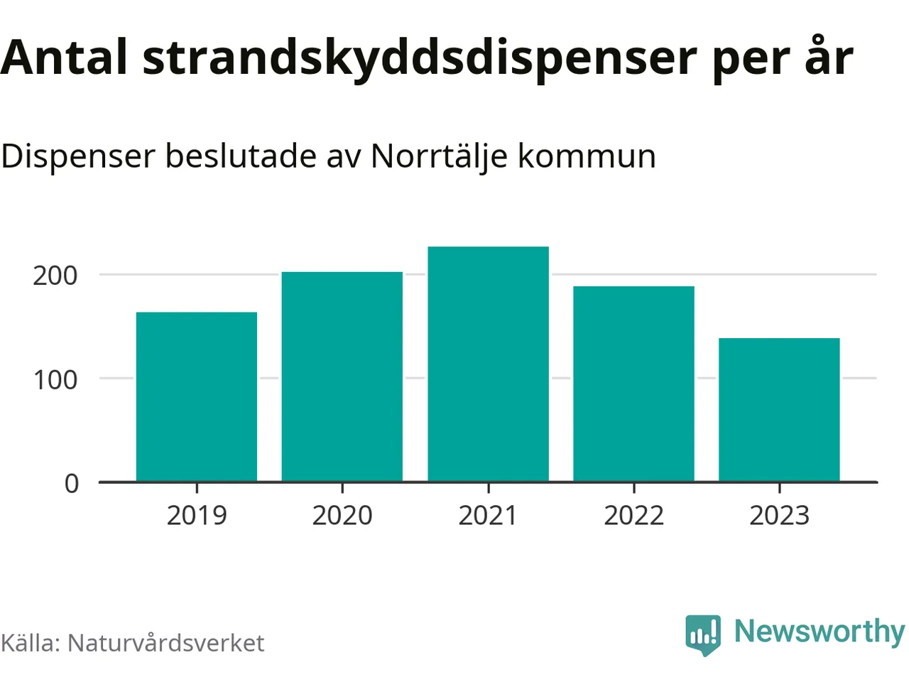 Den som vill bygga nära vatten behöver dispens från strandskyddet, lagstiftningen som ska säkra allmänhetens tillgång till stränderna och bevara livsvillkor för djur och växter. I de flesta fall är det kommunerna som godkänner dispenserna, och under de senaste fem åren har Norrtälje kommun fattat 917 beslut för totalt 1 095 åtgärder inom strandskyddat område, enligt den sammanställning Naturvårdsverket varje år gör. Det är näst flest av alla kommuner i landet. Flest dispenser i länet har godkänts i Värmdö – 1 571 stycken.