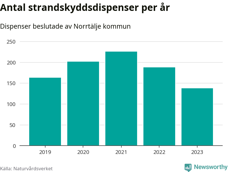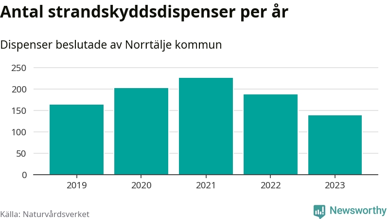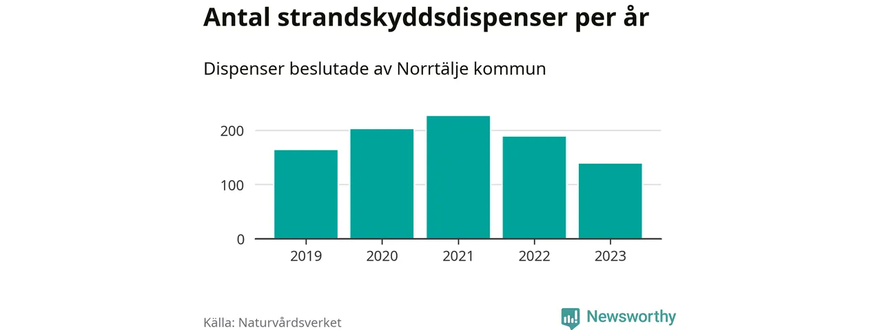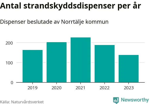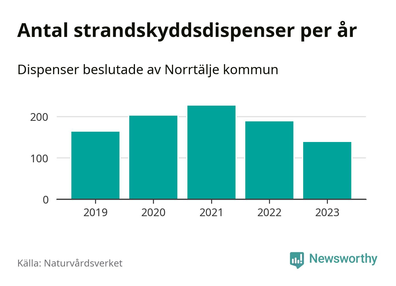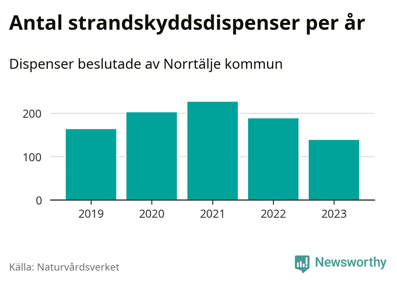 Den som vill bygga nära vatten behöver dispens från strandskyddet, lagstiftningen som ska säkra allmänhetens tillgång till stränderna och bevara livsvillkor för djur och växter. I de flesta fall är det kommunerna som godkänner dispenserna, och under de senaste fem åren har Norrtälje kommun fattat 917 beslut för totalt 1 095 åtgärder inom strandskyddat område, enligt den sammanställning Naturvårdsverket varje år gör. Det är näst flest av alla kommuner i landet. Flest dispenser i länet har godkänts i Värmdö – 1 571 stycken.