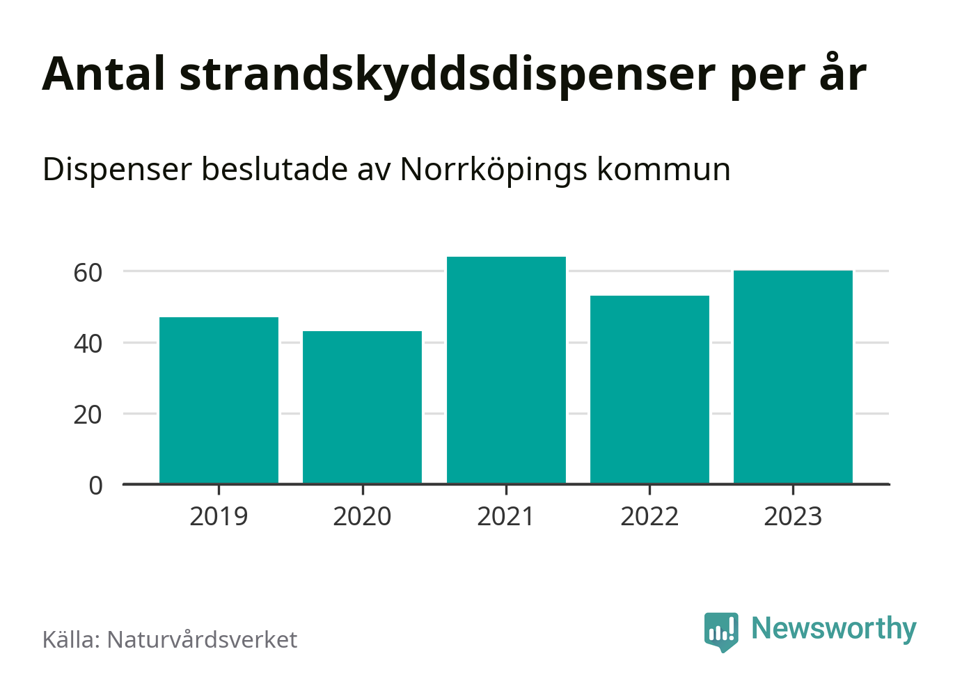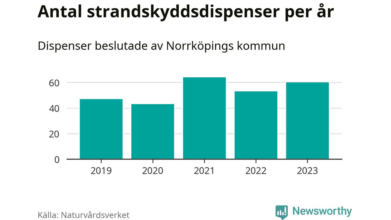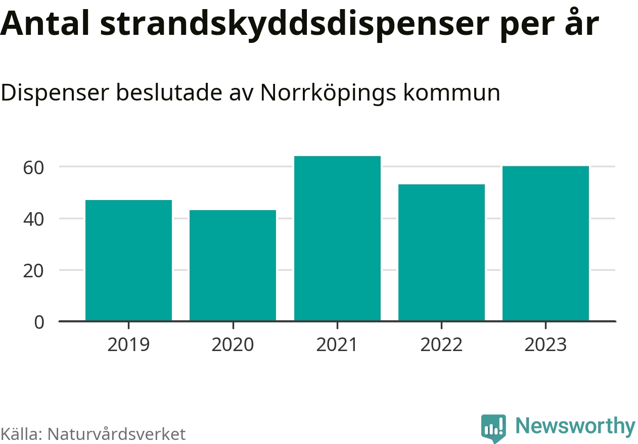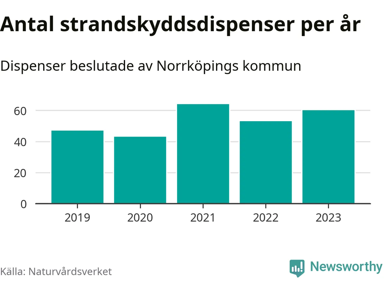 Den som vill bygga nära vatten behöver dispens från strandskyddet, lagstiftningen som ska säkra allmänhetens tillgång till stränderna och bevara livsvillkor för djur och växter. I de flesta fall är det kommunerna som godkänner dispenserna, och under de senaste fem åren har Norrköpings kommun fattat 267 beslut för totalt 389 åtgärder inom strandskyddat område, enligt den sammanställning Naturvårdsverket varje år gör. Det gör kommunen till en av de mest generösa i landet och mest generös av kommunerna i Östergötlands län.