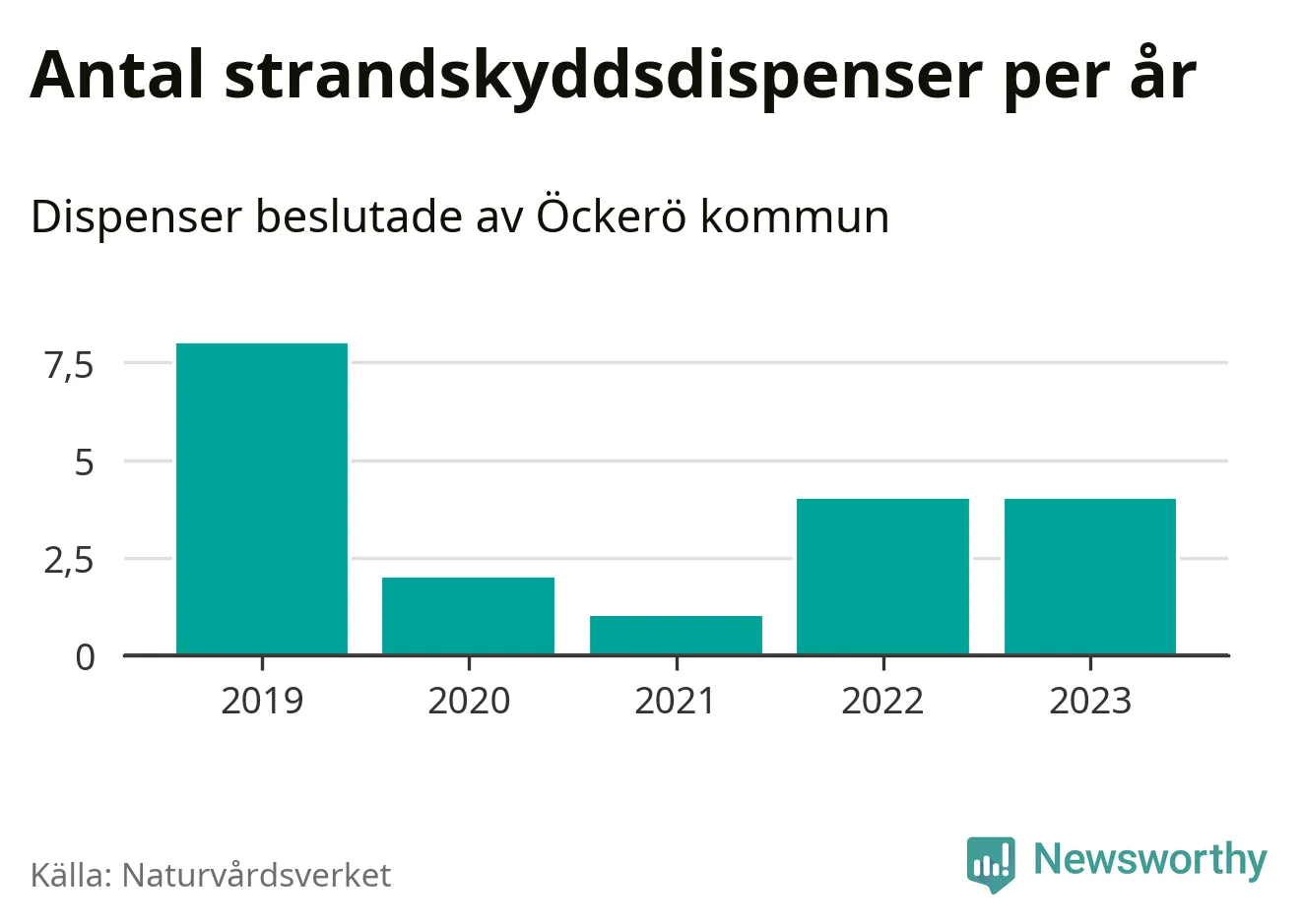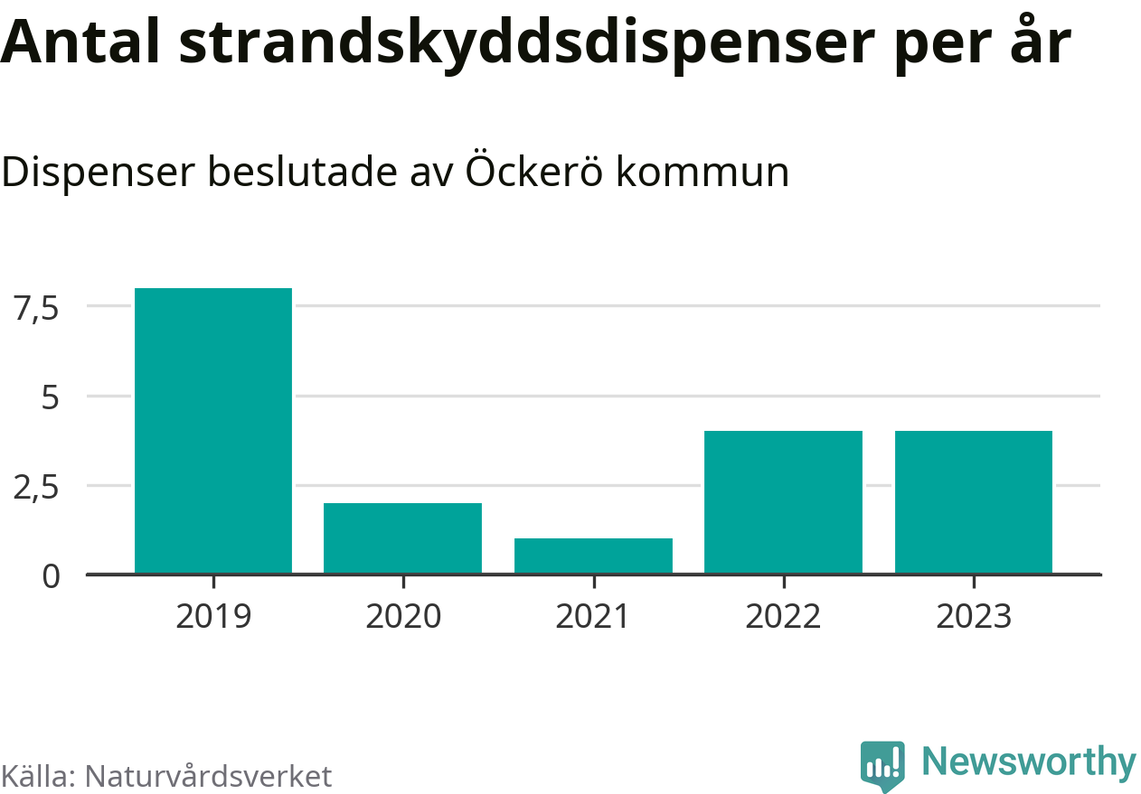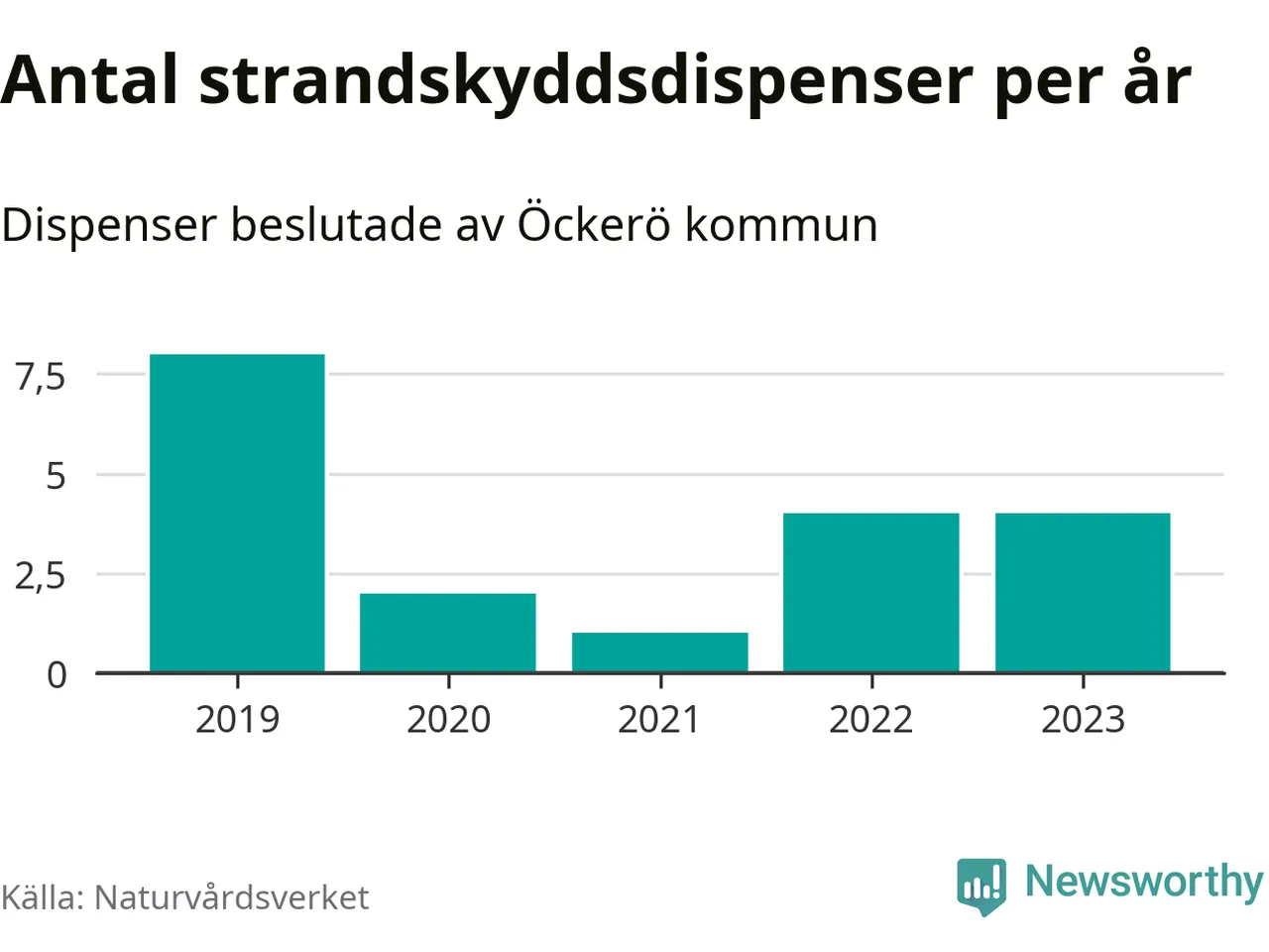 Den som vill bygga nära vatten behöver dispens från strandskyddet, lagstiftningen som ska säkra allmänhetens tillgång till stränderna och bevara livsvillkor för djur och växter. I de flesta fall är det kommunerna som godkänner dispenserna, och under de senaste fem åren har Öckerö kommun fattat 19 beslut för totalt 39 åtgärder inom strandskyddat område, enligt den sammanställning Naturvårdsverket varje år gör. Det är färre än i de flesta kommuner i landet. Flest dispenser i Västra Götalands län har godkänts i Borås – 220 stycken.