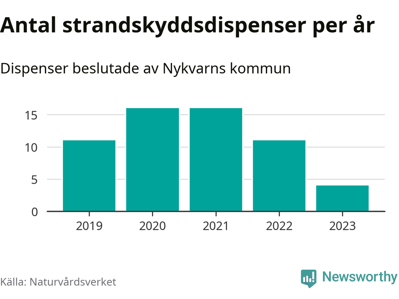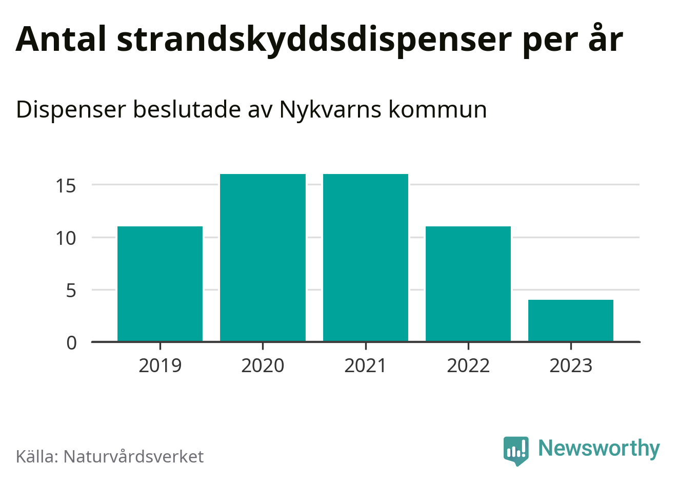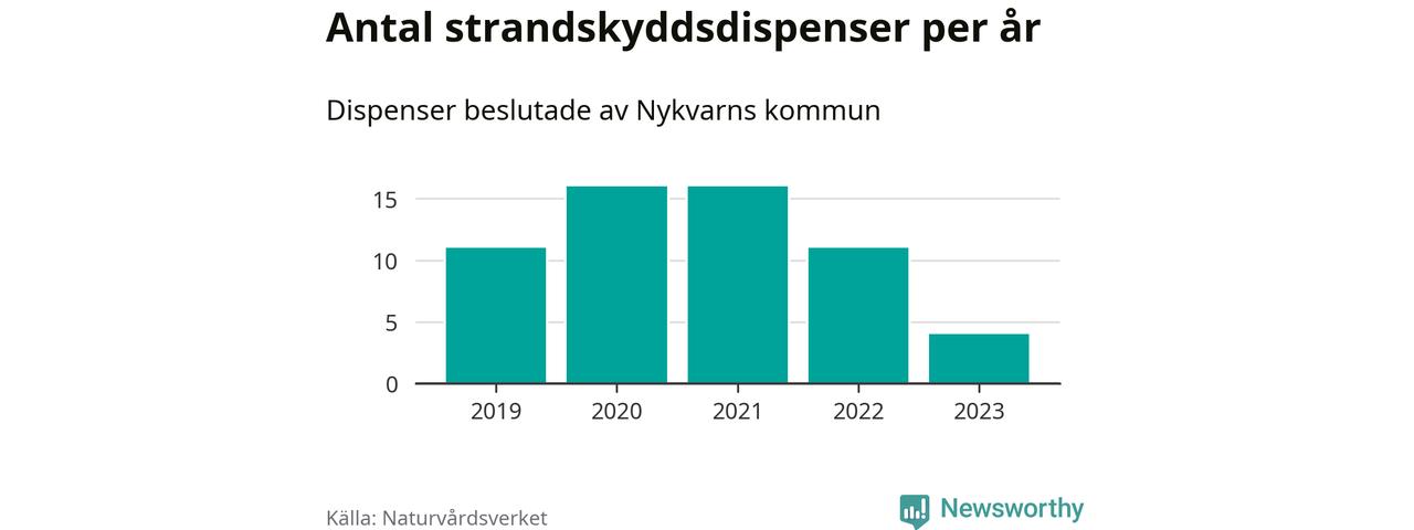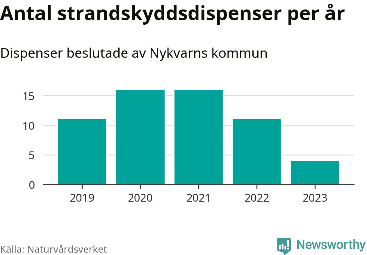 Den som vill bygga nära vatten behöver dispens från strandskyddet, lagstiftningen som ska säkra allmänhetens tillgång till stränderna och bevara livsvillkor för djur och växter. I de flesta fall är det kommunerna som godkänner dispenserna, och under de senaste fem åren har Nykvarns kommun fattat 58 beslut för totalt 81 åtgärder inom strandskyddat område, enligt den sammanställning Naturvårdsverket varje år gör. Det är inte en siffra som sticker ut särskilt jämfört med andra kommuner. Flest dispenser i Stockholms län har godkänts i Värmdö – 1 571 stycken.
