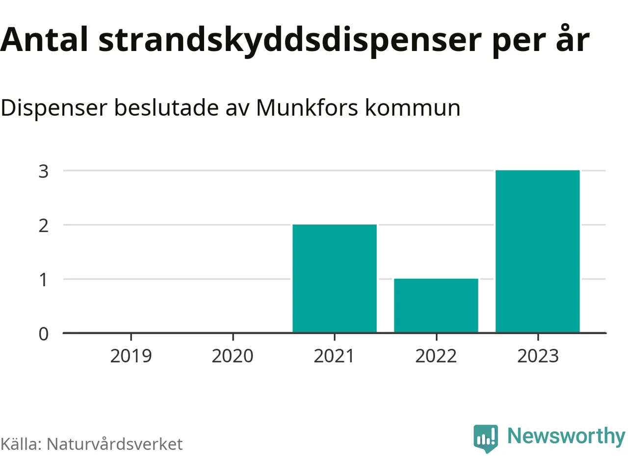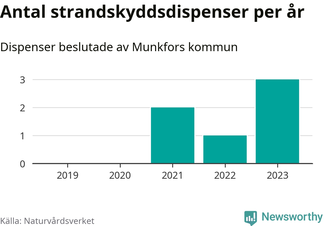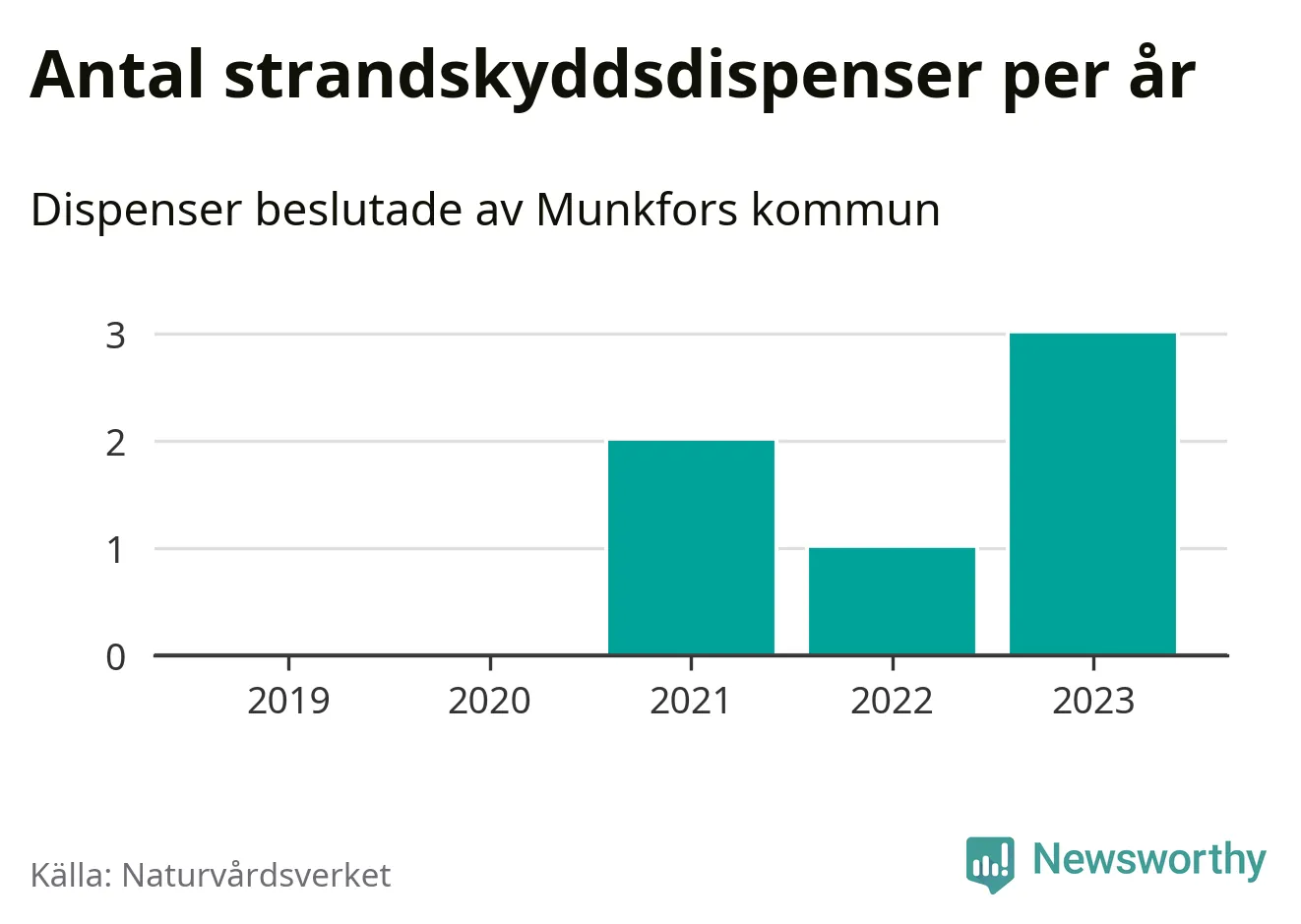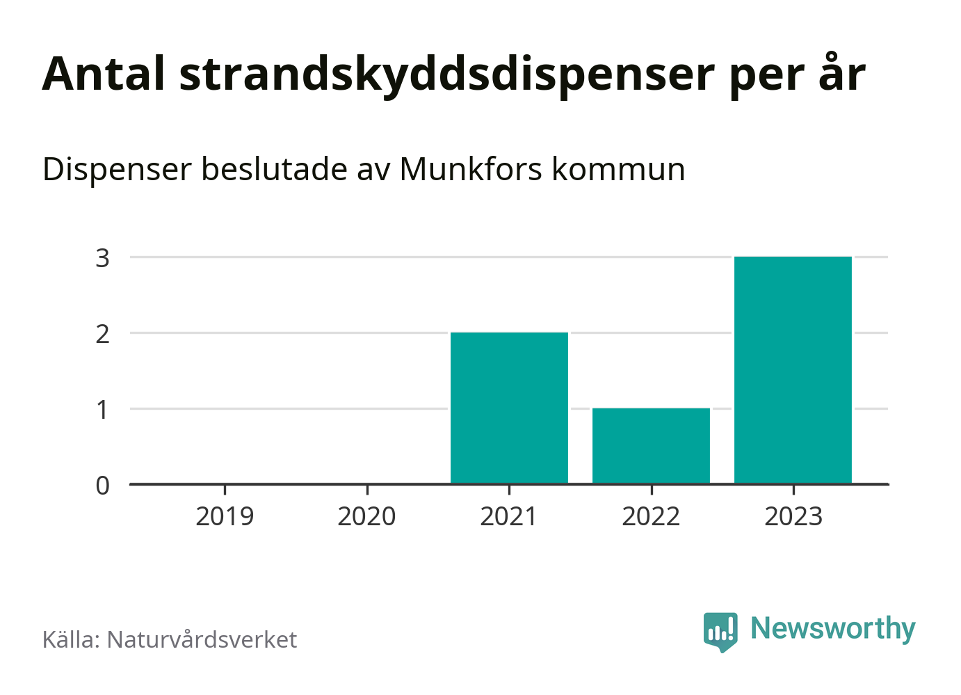 Den som vill bygga nära vatten behöver dispens från strandskyddet, lagstiftningen som ska säkra allmänhetens tillgång till stränderna och bevara livsvillkor för djur och växter. I de flesta fall är det kommunerna som godkänner dispenserna, och under de senaste fem åren har Munkfors kommun fattat sex beslut om dispens inom strandskyddat område, enligt den sammanställning Naturvårdsverket varje år gör. Det är färre än i de flesta kommuner i landet. Flest dispenser i Värmlands län har godkänts i Arvika – 137 stycken.