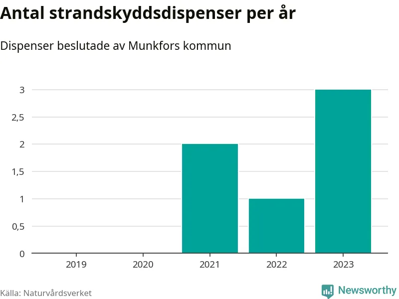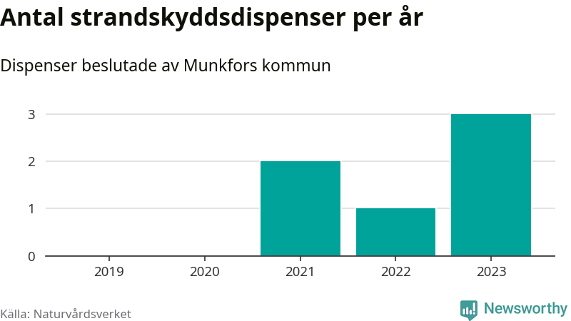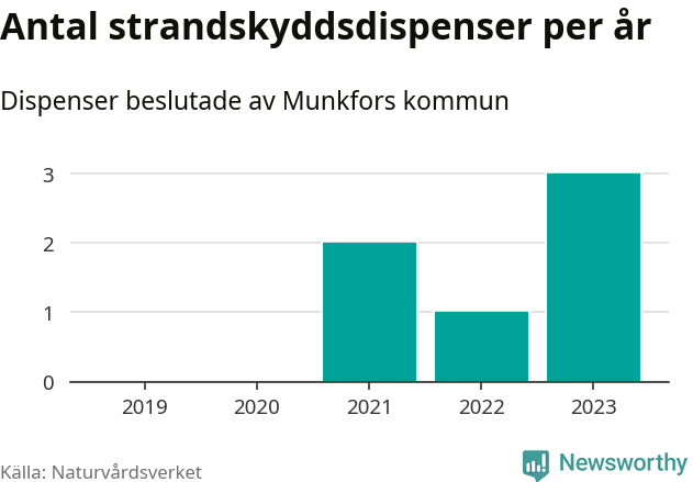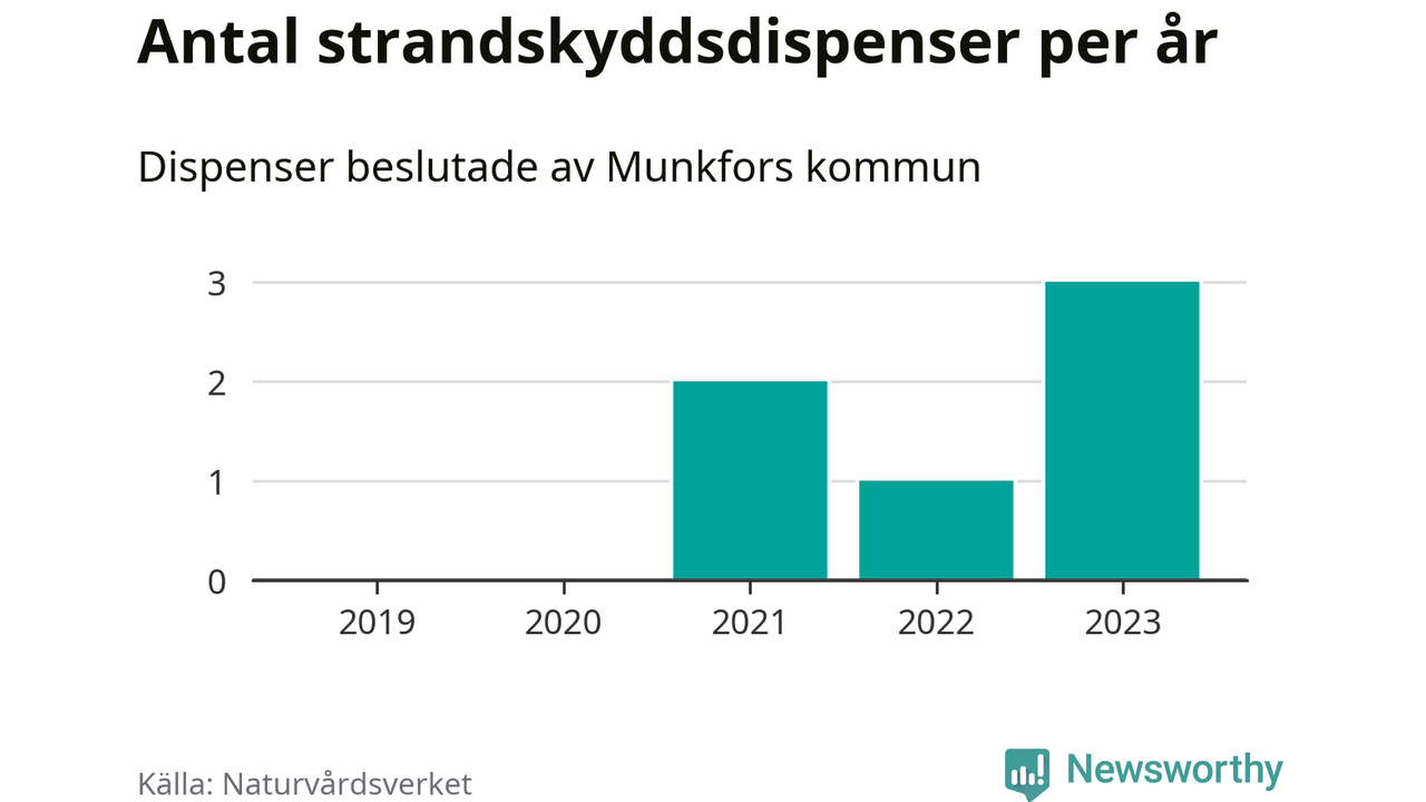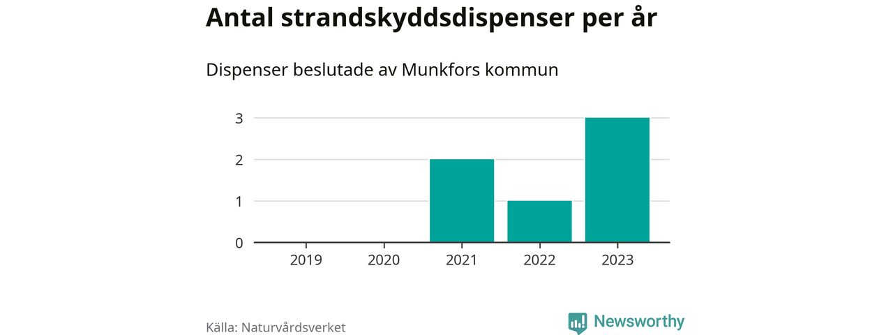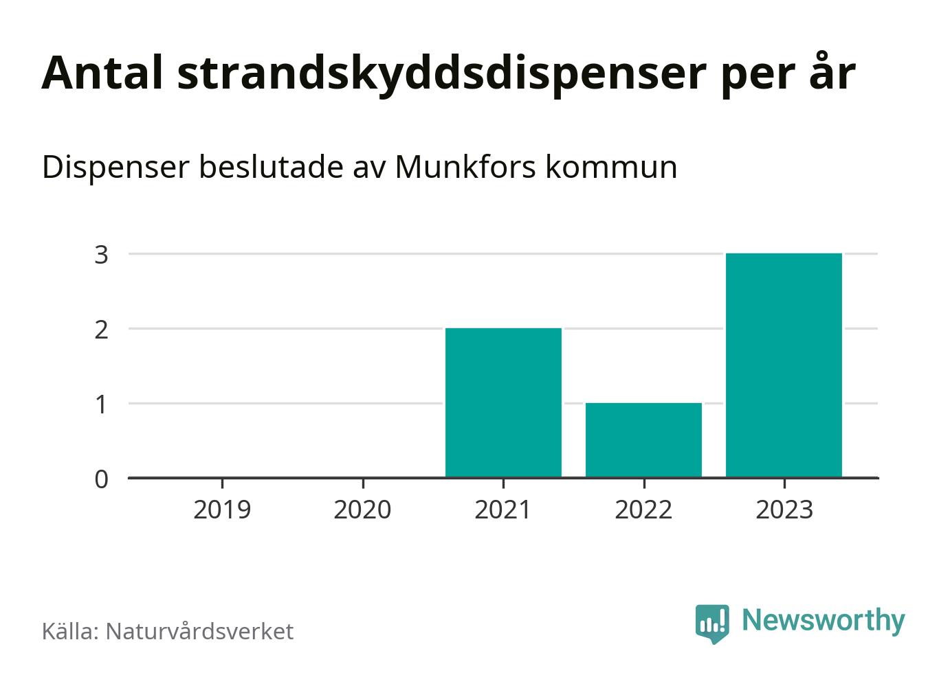 Den som vill bygga nära vatten behöver dispens från strandskyddet, lagstiftningen som ska säkra allmänhetens tillgång till stränderna och bevara livsvillkor för djur och växter. I de flesta fall är det kommunerna som godkänner dispenserna, och under de senaste fem åren har Munkfors kommun fattat sex beslut om dispens inom strandskyddat område, enligt den sammanställning Naturvårdsverket varje år gör. Det är färre än i de flesta kommuner i landet. Flest dispenser i Värmlands län har godkänts i Arvika – 137 stycken.