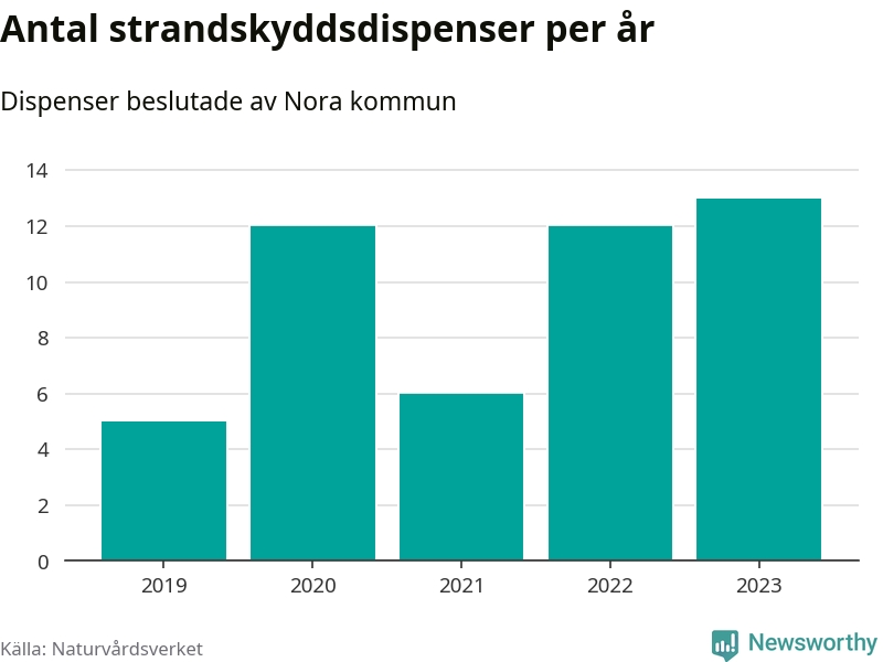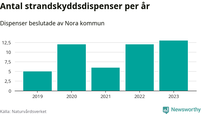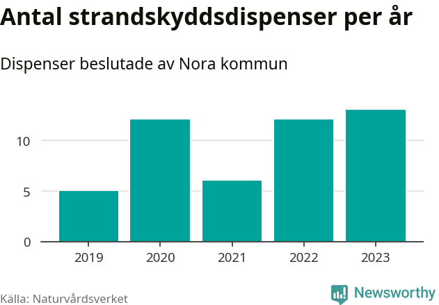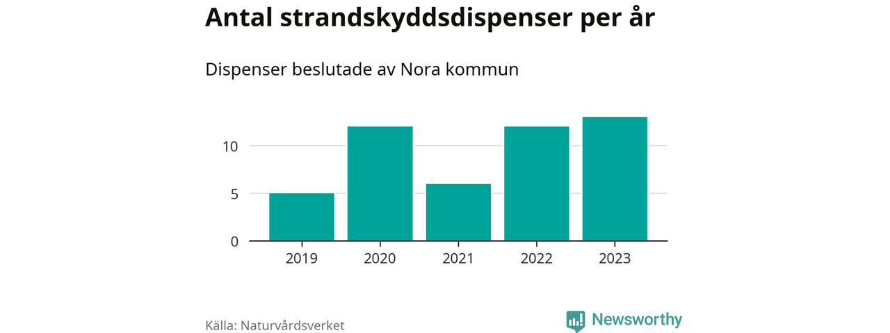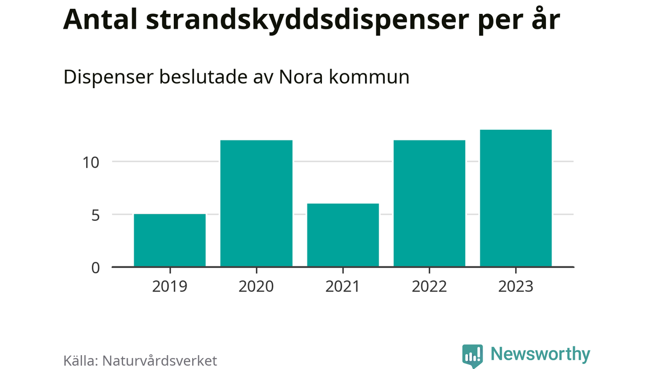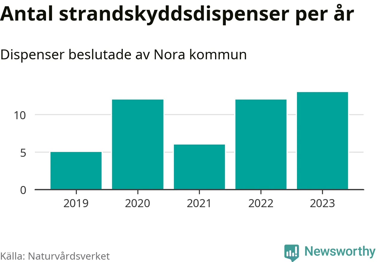 Den som vill bygga nära vatten behöver dispens från strandskyddet, lagstiftningen som ska säkra allmänhetens tillgång till stränderna och bevara livsvillkor för djur och växter. I de flesta fall är det kommunerna som godkänner dispenserna, och under de senaste fem åren har Nora kommun fattat 48 beslut för totalt 69 åtgärder inom strandskyddat område, enligt den sammanställning Naturvårdsverket varje år gör. Det är inte en siffra som sticker ut särskilt jämfört med andra kommuner. Flest dispenser i Örebro län har godkänts i Askersund – 91 stycken.