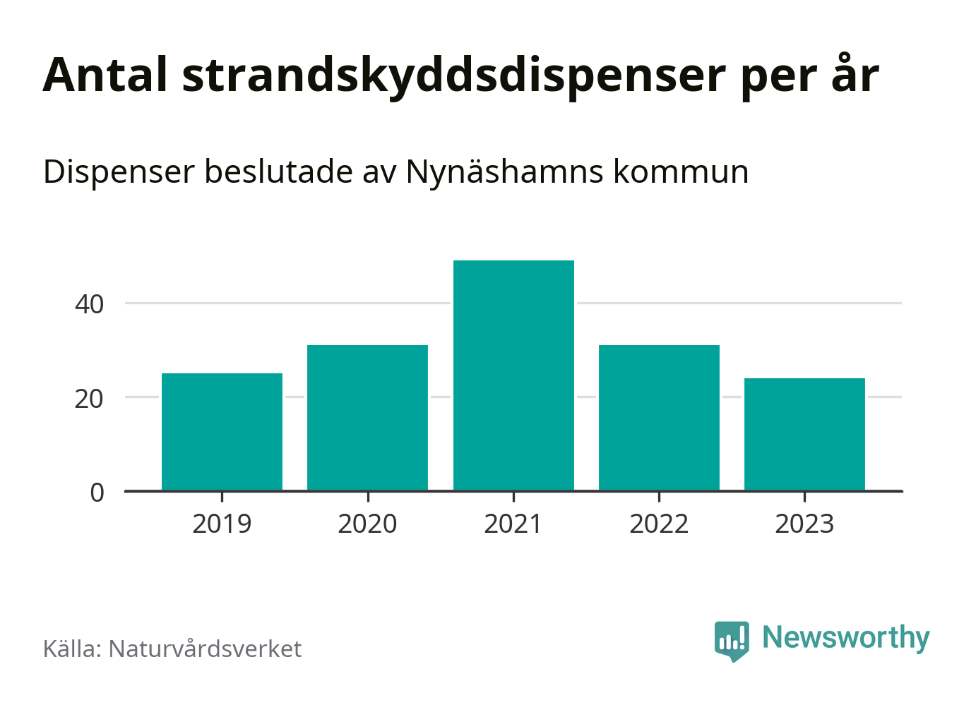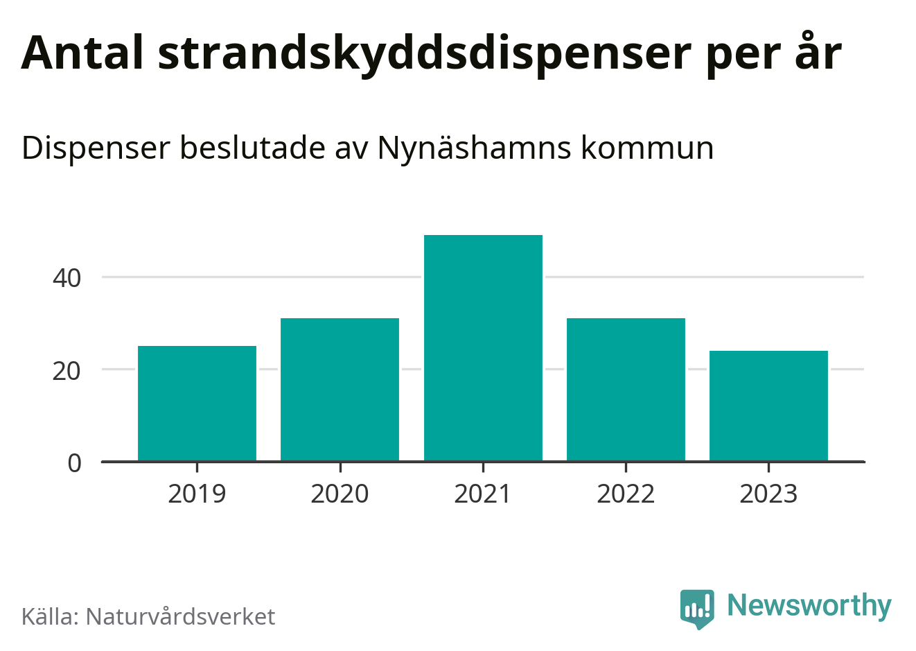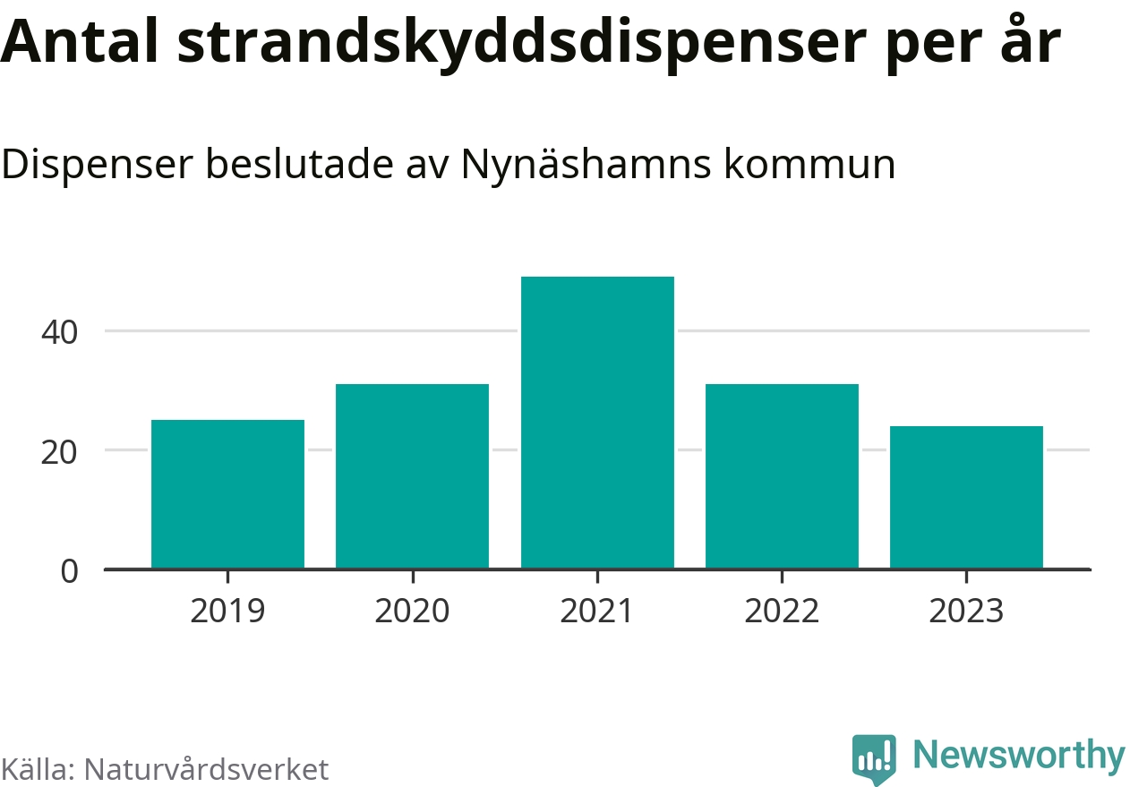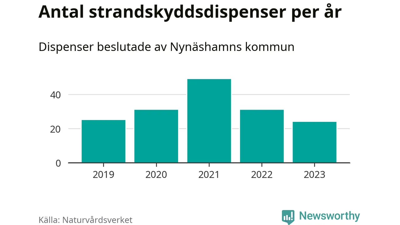 Den som vill bygga nära vatten behöver dispens från strandskyddet, lagstiftningen som ska säkra allmänhetens tillgång till stränderna och bevara livsvillkor för djur och växter. I de flesta fall är det kommunerna som godkänner dispenserna, och under de senaste fem åren har Nynäshamns kommun fattat 160 beslut för totalt 208 åtgärder inom strandskyddat område, enligt den sammanställning Naturvårdsverket varje år gör. Det är fler än i de flesta kommuner i landet. Flest dispenser i Stockholms län har godkänts i Värmdö – 1 571 stycken.