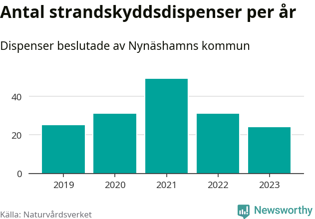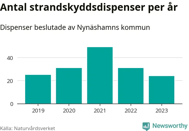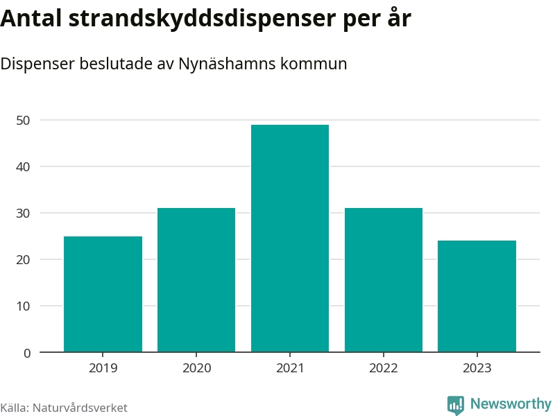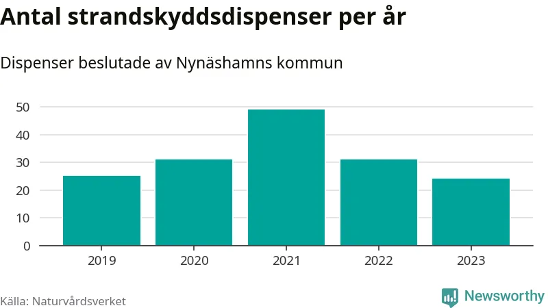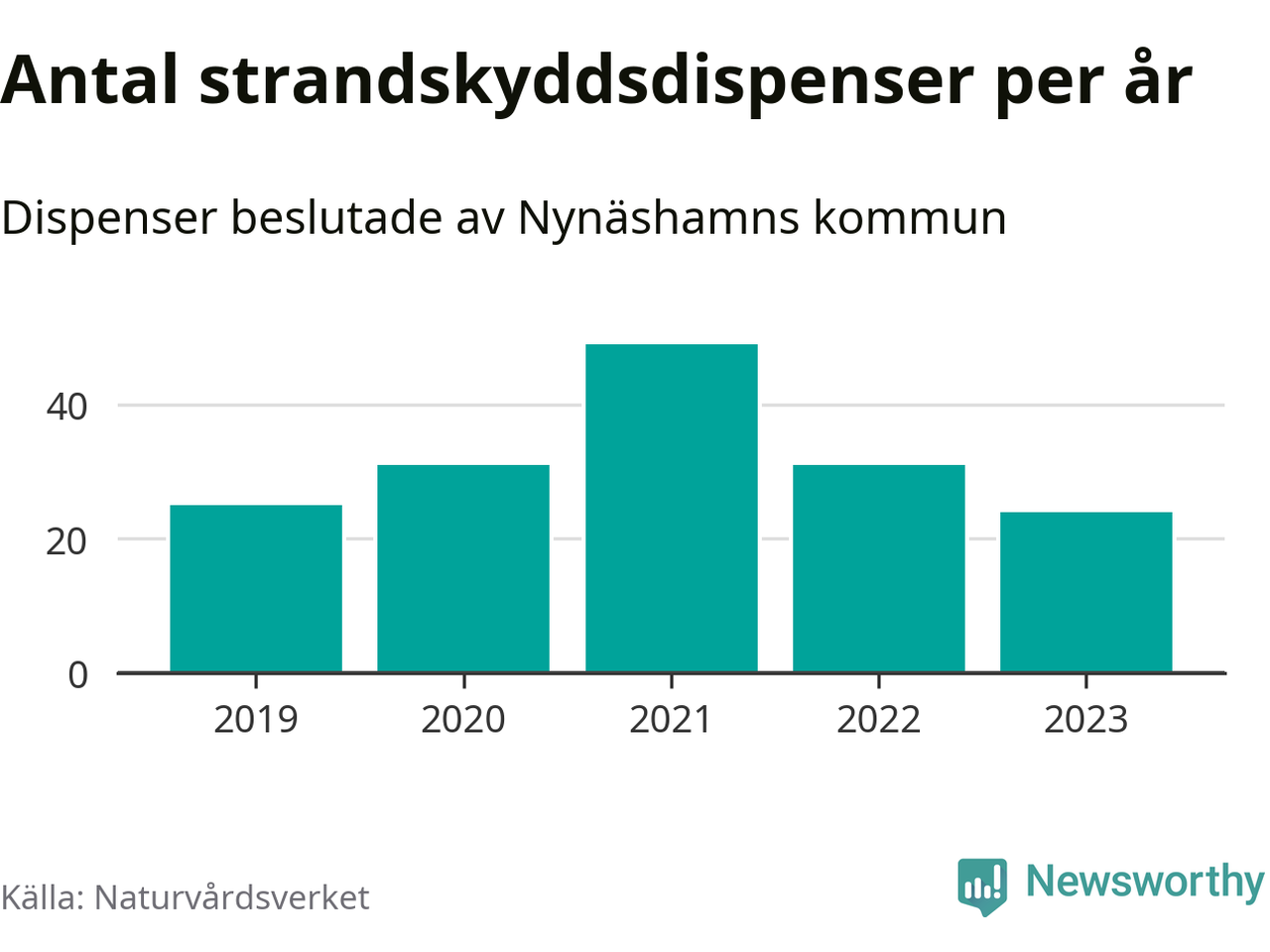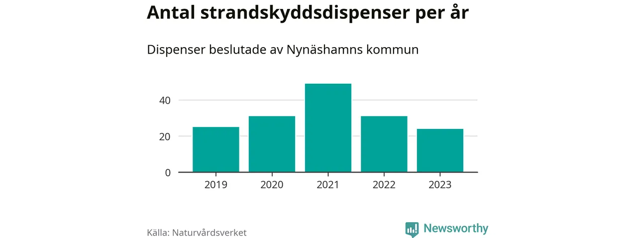 Den som vill bygga nära vatten behöver dispens från strandskyddet, lagstiftningen som ska säkra allmänhetens tillgång till stränderna och bevara livsvillkor för djur och växter. I de flesta fall är det kommunerna som godkänner dispenserna, och under de senaste fem åren har Nynäshamns kommun fattat 160 beslut för totalt 208 åtgärder inom strandskyddat område, enligt den sammanställning Naturvårdsverket varje år gör. Det är fler än i de flesta kommuner i landet. Flest dispenser i Stockholms län har godkänts i Värmdö – 1 571 stycken.