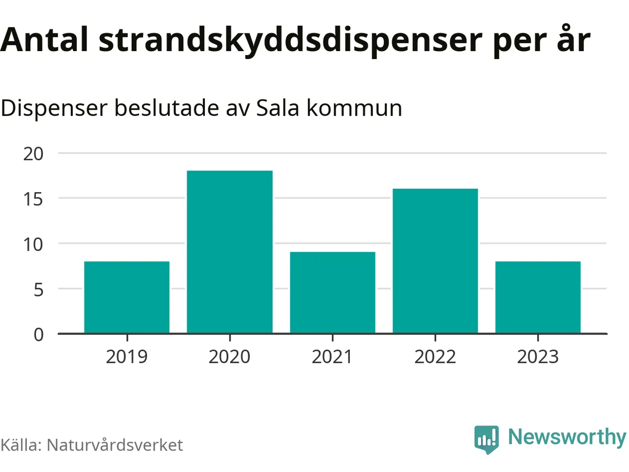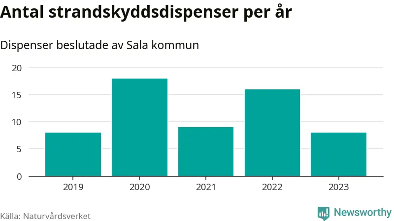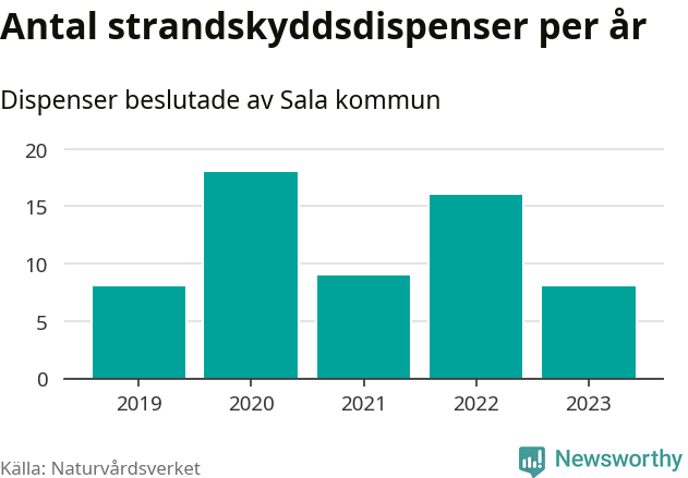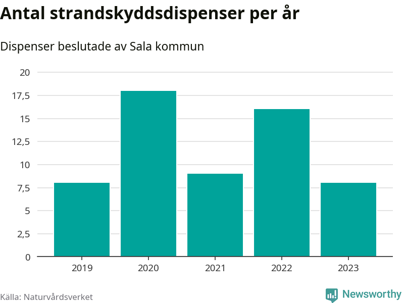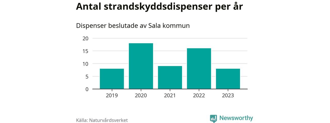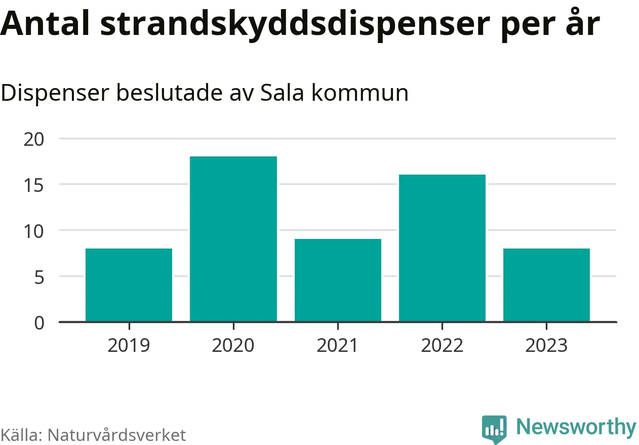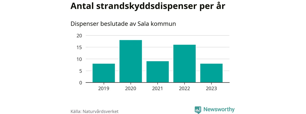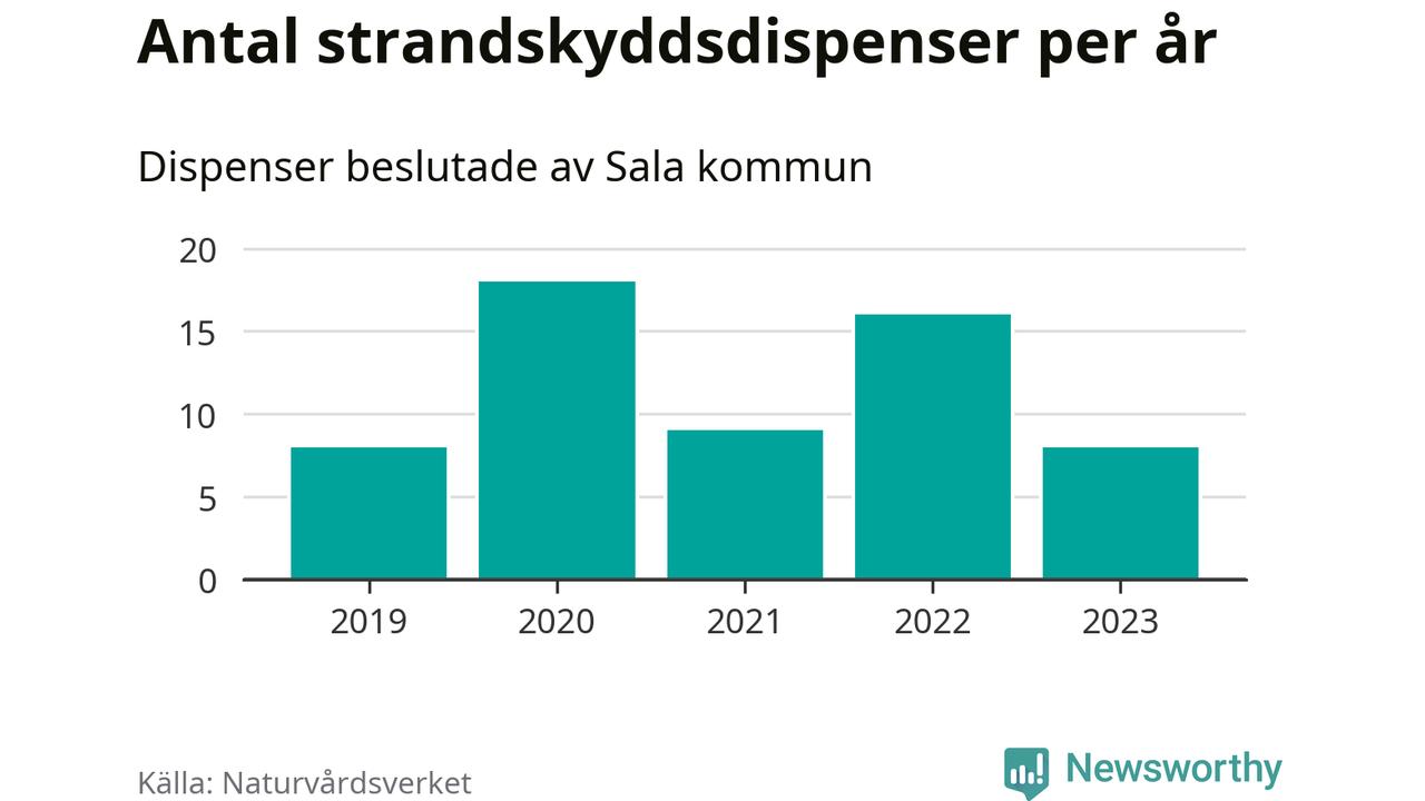 Den som vill bygga nära vatten behöver dispens från strandskyddet, lagstiftningen som ska säkra allmänhetens tillgång till stränderna och bevara livsvillkor för djur och växter. I de flesta fall är det kommunerna som godkänner dispenserna, och under de senaste fem åren har Sala kommun fattat 59 beslut för totalt 73 åtgärder inom strandskyddat område, enligt den sammanställning Naturvårdsverket varje år gör. Det är flest av kommunerna i Västmanlands län.