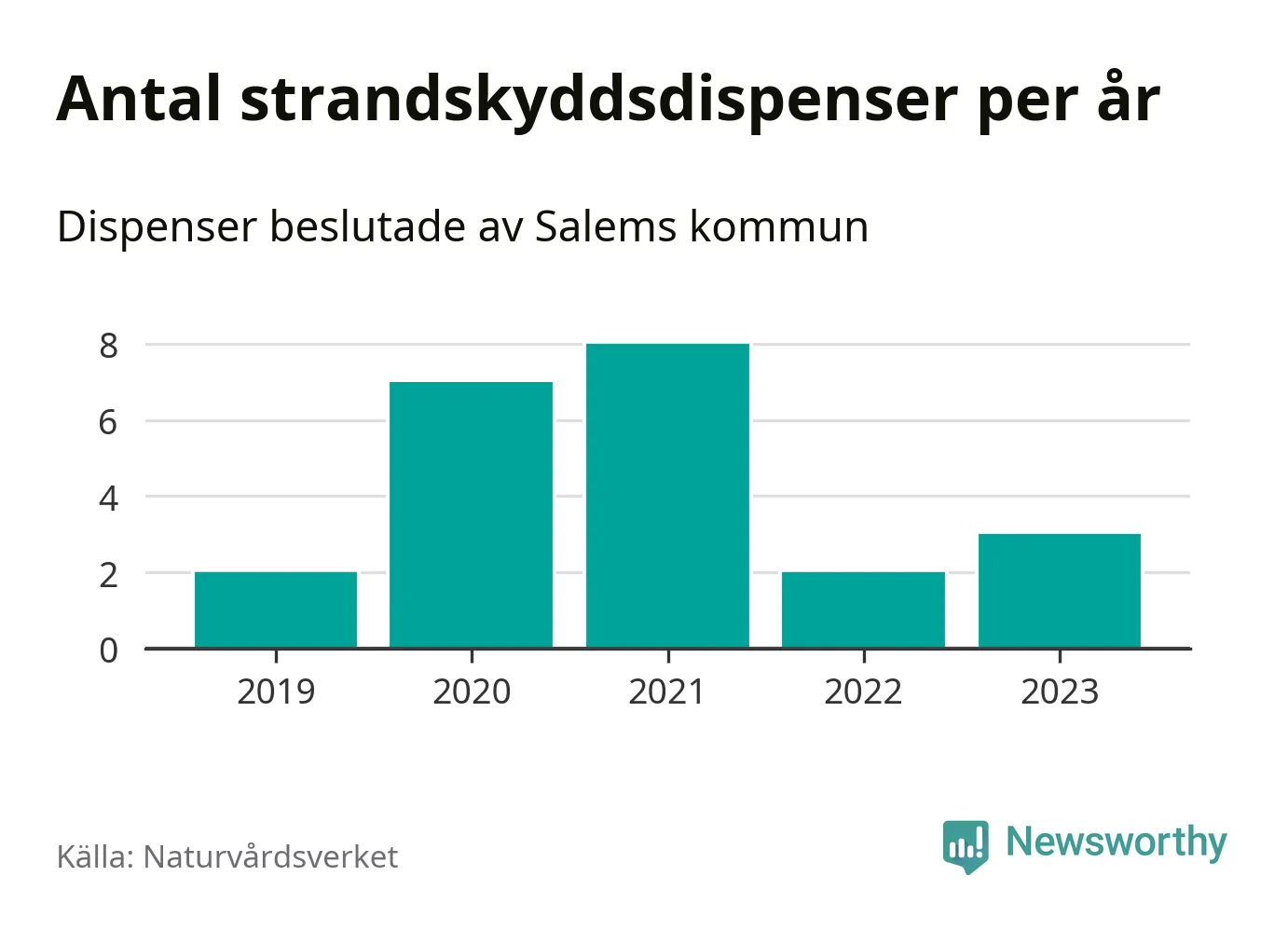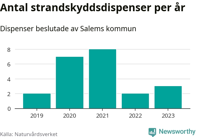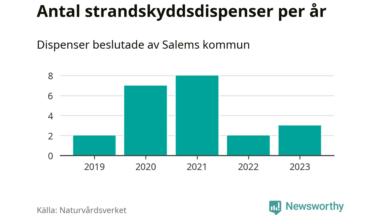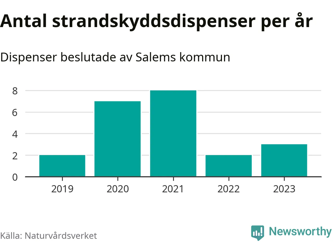Den som vill bygga nära vatten behöver dispens från strandskyddet, lagstiftningen som ska säkra allmänhetens tillgång till stränderna och bevara livsvillkor för djur och växter. I de flesta fall är det kommunerna som godkänner dispenserna, och under de senaste fem åren har Salems kommun fattat 22 beslut för totalt 26 åtgärder inom strandskyddat område, enligt den sammanställning Naturvårdsverket varje år gör. Det är färre än i de flesta kommuner i landet. Flest dispenser i Stockholms län har godkänts i Värmdö – 1 571 stycken.