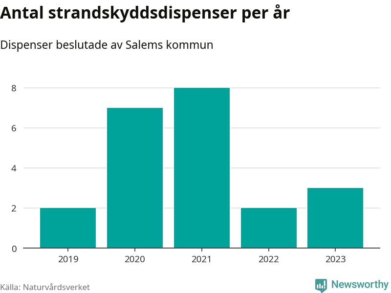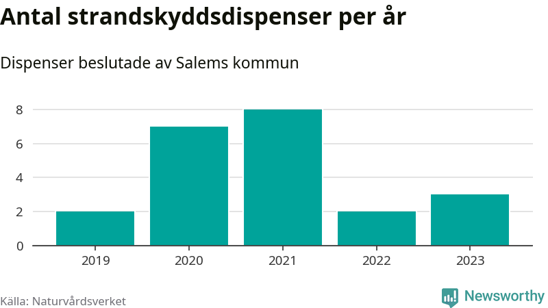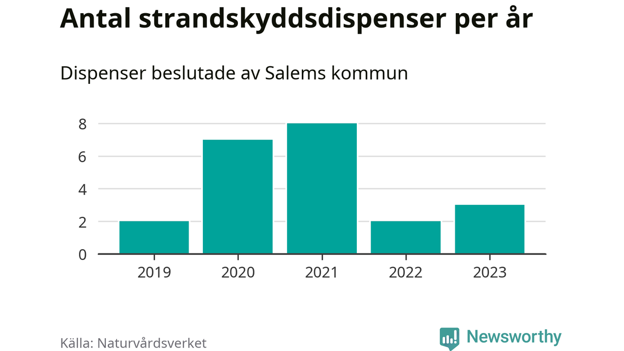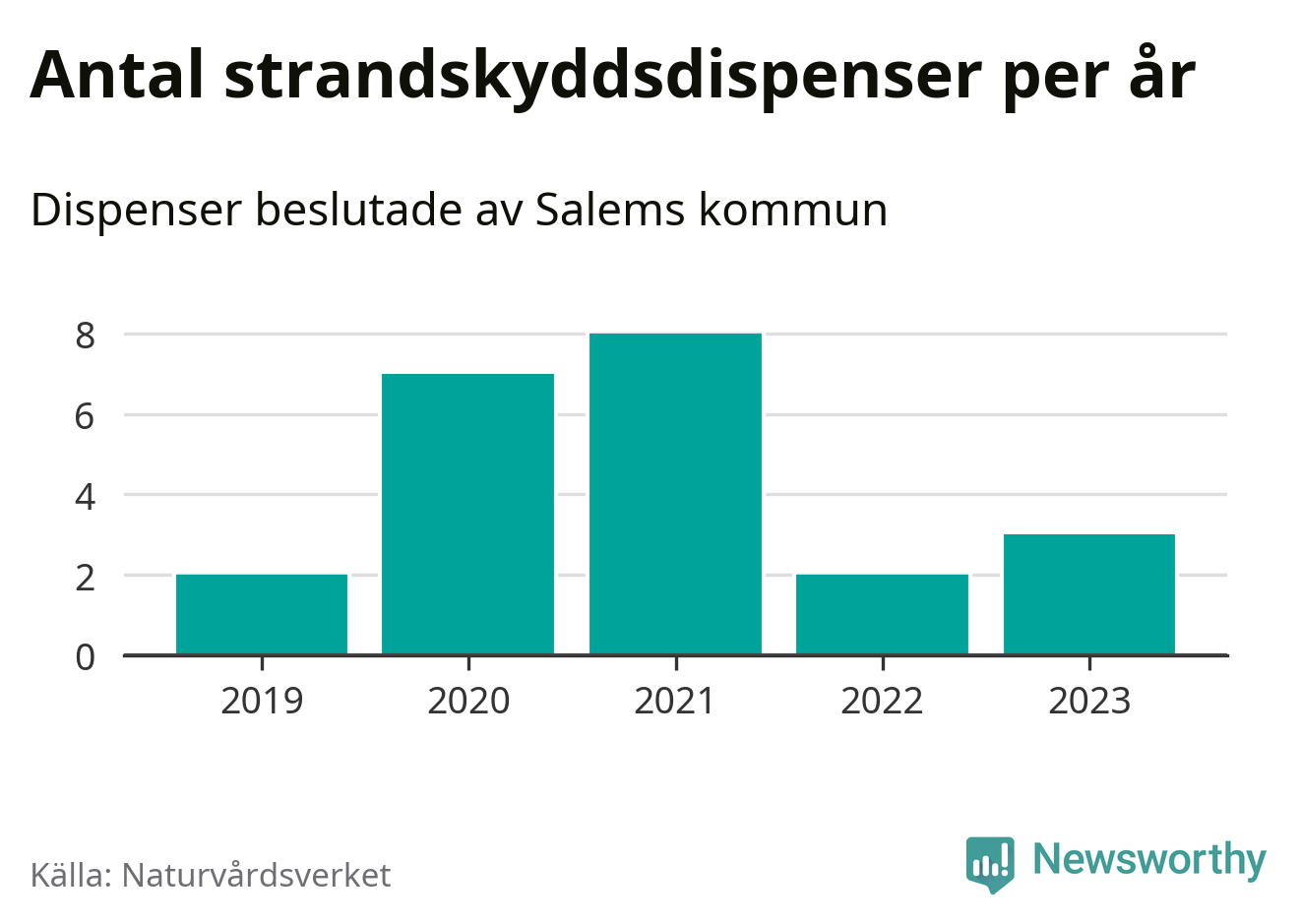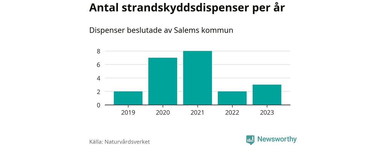 Den som vill bygga nära vatten behöver dispens från strandskyddet, lagstiftningen som ska säkra allmänhetens tillgång till stränderna och bevara livsvillkor för djur och växter. I de flesta fall är det kommunerna som godkänner dispenserna, och under de senaste fem åren har Salems kommun fattat 22 beslut för totalt 26 åtgärder inom strandskyddat område, enligt den sammanställning Naturvårdsverket varje år gör. Det är färre än i de flesta kommuner i landet. Flest dispenser i Stockholms län har godkänts i Värmdö – 1 571 stycken.