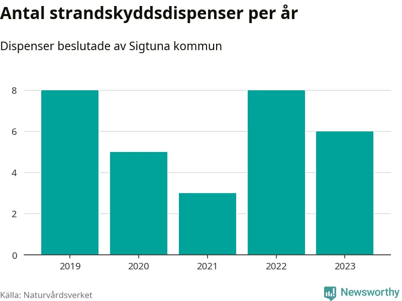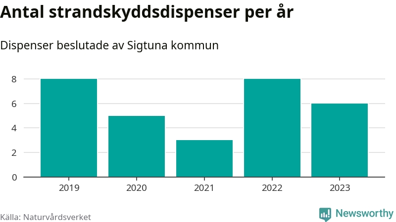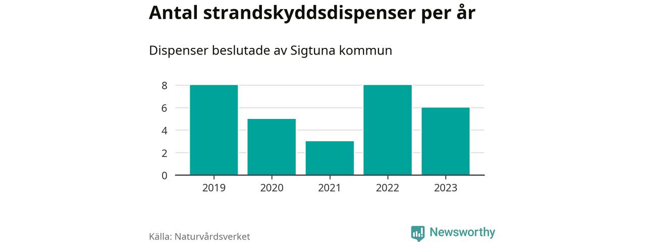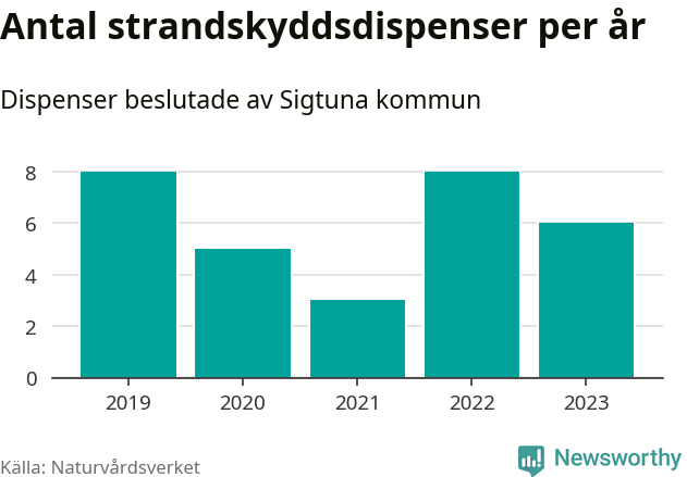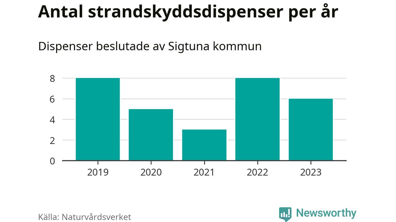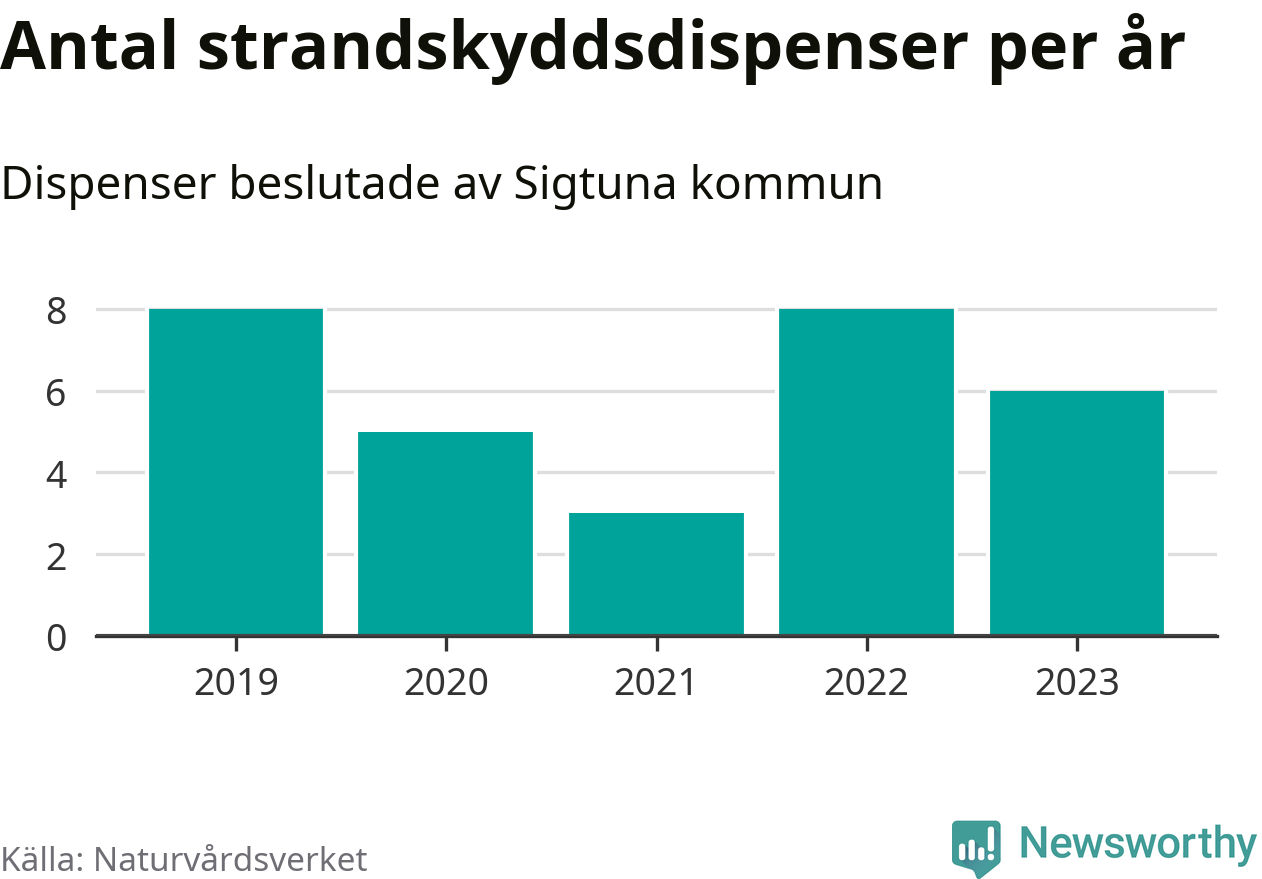 Den som vill bygga nära vatten behöver dispens från strandskyddet, lagstiftningen som ska säkra allmänhetens tillgång till stränderna och bevara livsvillkor för djur och växter. I de flesta fall är det kommunerna som godkänner dispenserna, och under de senaste fem åren har Sigtuna kommun fattat 30 beslut för totalt 34 åtgärder inom strandskyddat område, enligt den sammanställning Naturvårdsverket varje år gör. Det är färre än i de flesta kommuner i landet. Flest dispenser i Stockholms län har godkänts i Värmdö – 1 571 stycken.