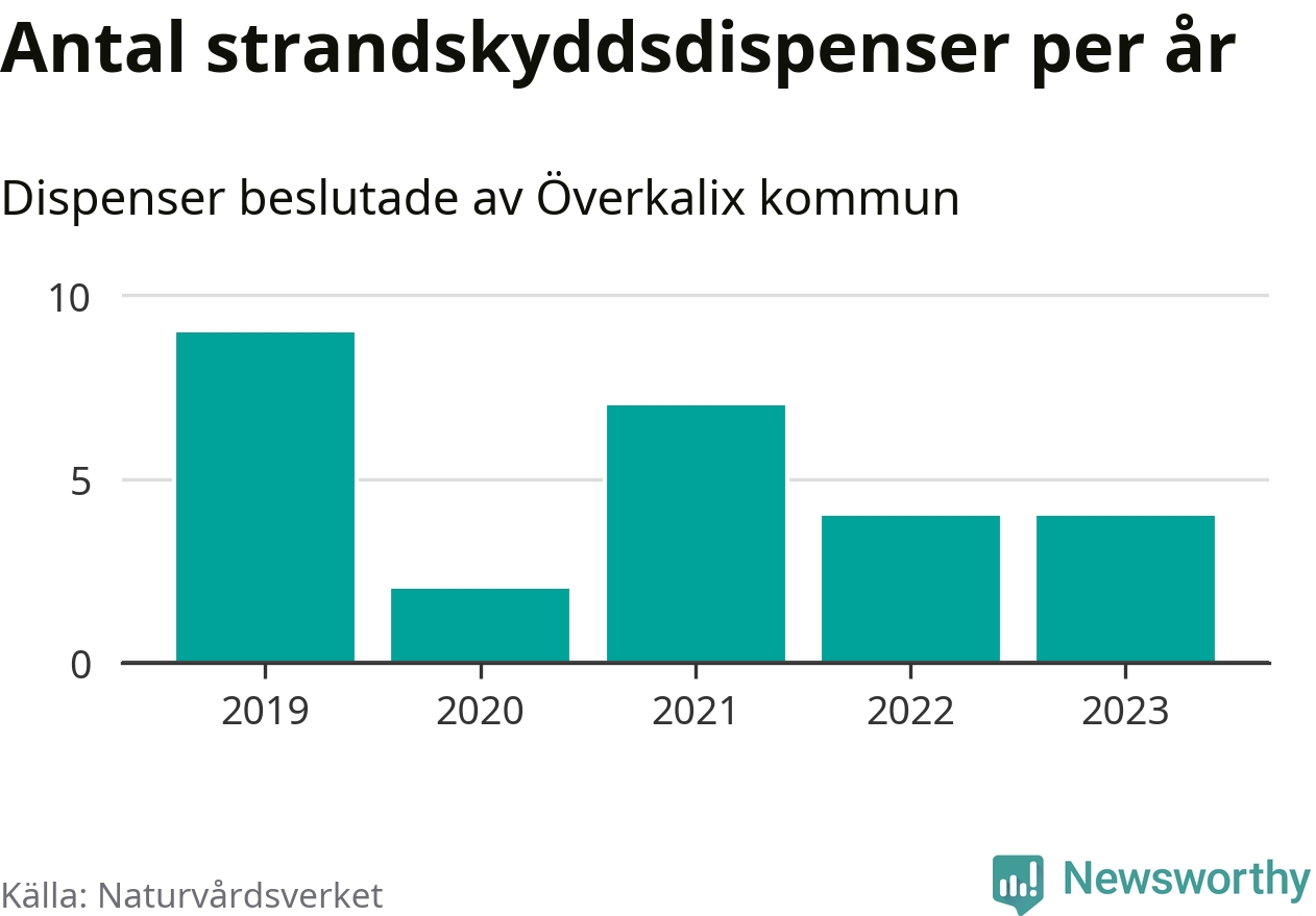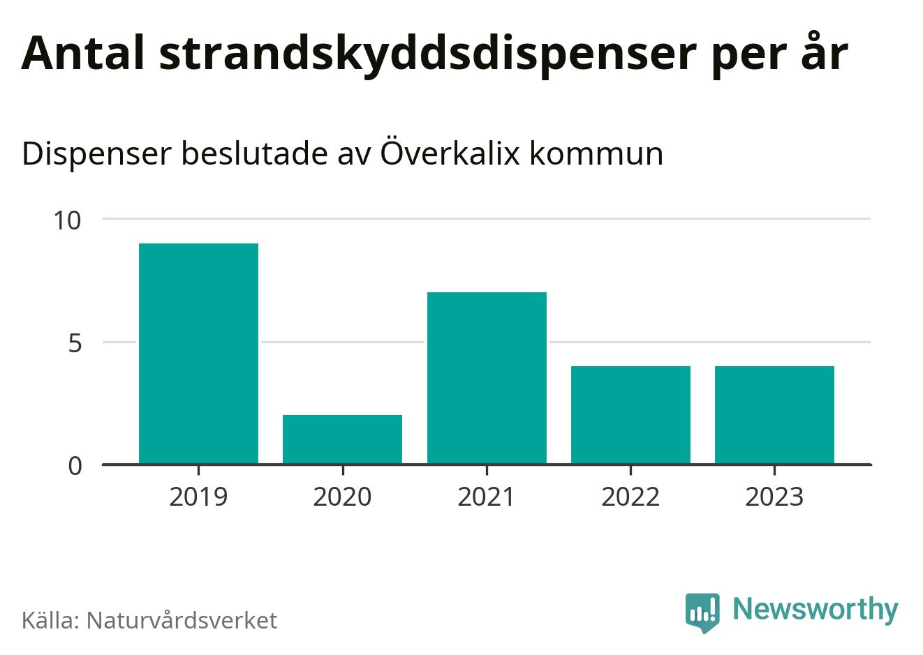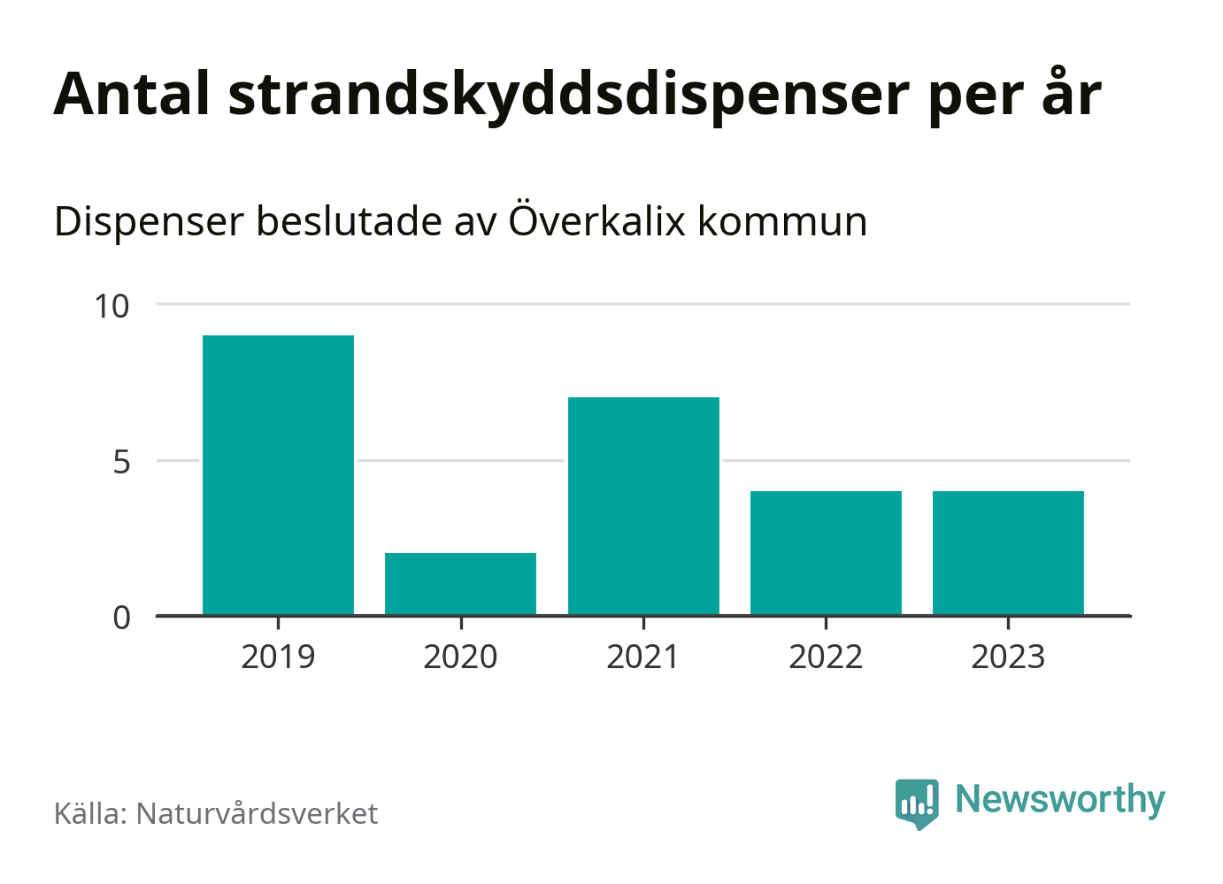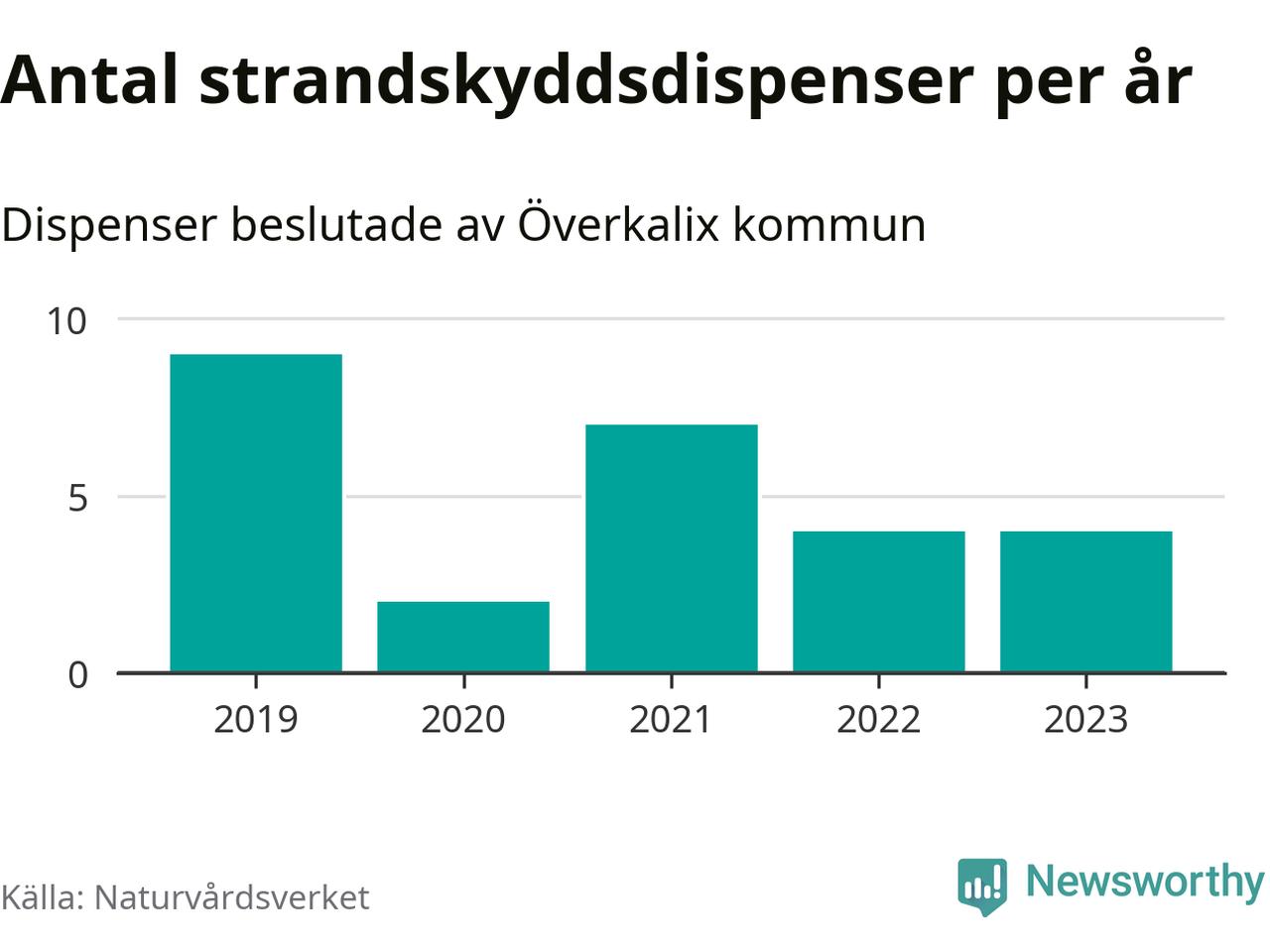 Den som vill bygga nära vatten behöver dispens från strandskyddet, lagstiftningen som ska säkra allmänhetens tillgång till stränderna och bevara livsvillkor för djur och växter. I de flesta fall är det kommunerna som godkänner dispenserna, och under de senaste fem åren har Överkalix kommun fattat 26 beslut för totalt 36 åtgärder inom strandskyddat område, enligt den sammanställning Naturvårdsverket varje år gör. Det är färre än i de flesta kommuner i landet. Flest dispenser i Norrbottens län har godkänts i Luleå – 199 stycken.