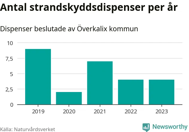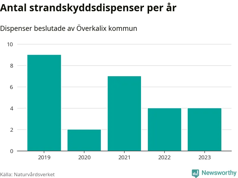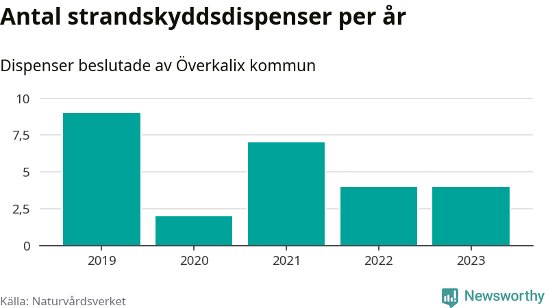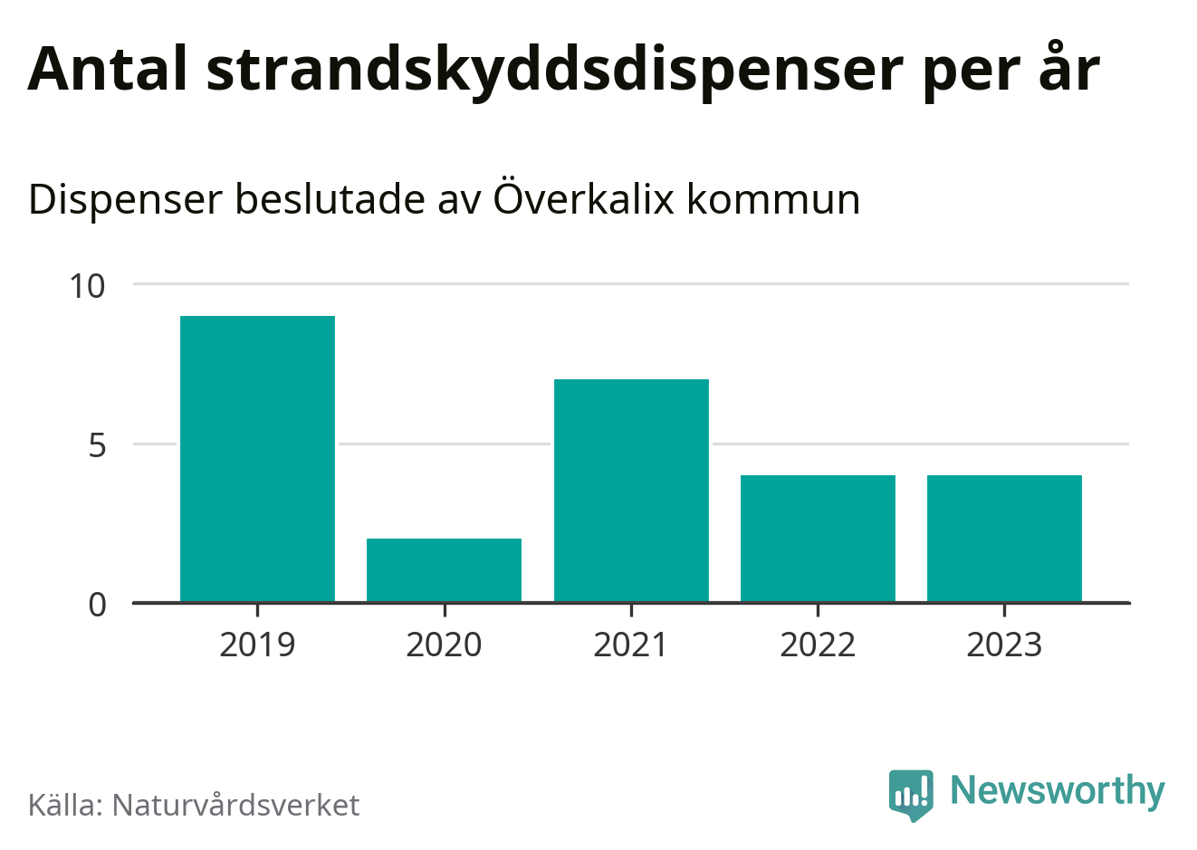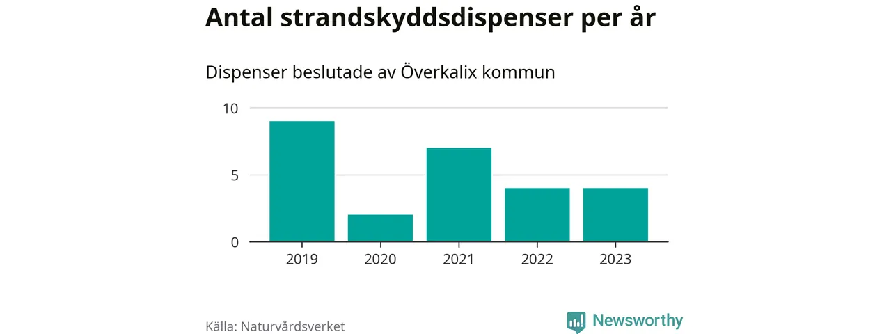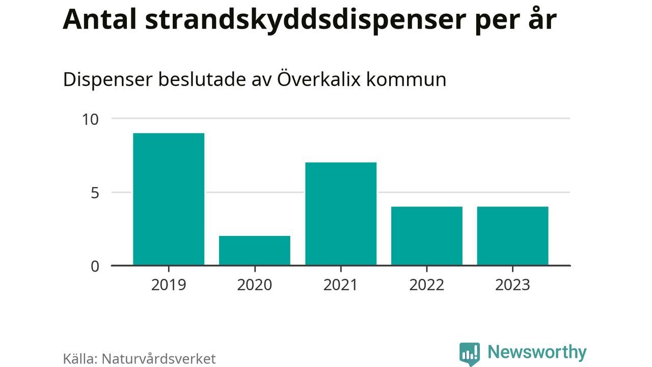 Den som vill bygga nära vatten behöver dispens från strandskyddet, lagstiftningen som ska säkra allmänhetens tillgång till stränderna och bevara livsvillkor för djur och växter. I de flesta fall är det kommunerna som godkänner dispenserna, och under de senaste fem åren har Överkalix kommun fattat 26 beslut för totalt 36 åtgärder inom strandskyddat område, enligt den sammanställning Naturvårdsverket varje år gör. Det är färre än i de flesta kommuner i landet. Flest dispenser i Norrbottens län har godkänts i Luleå – 199 stycken.