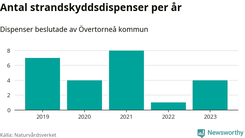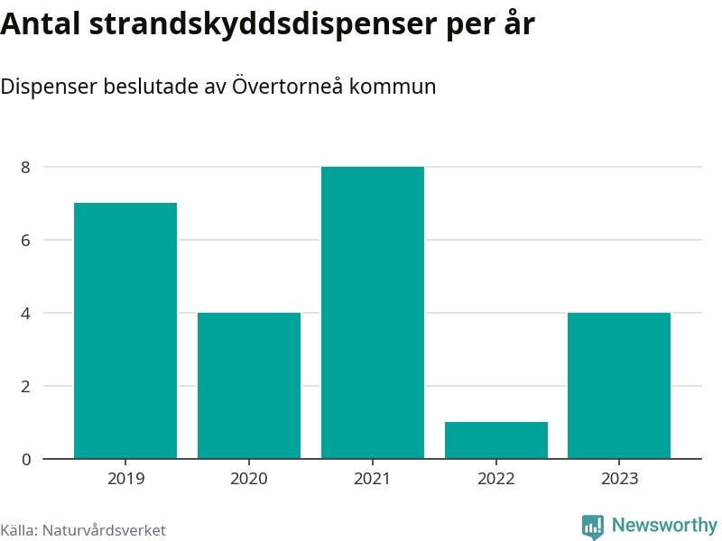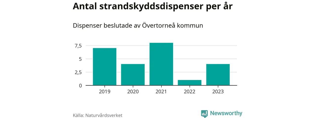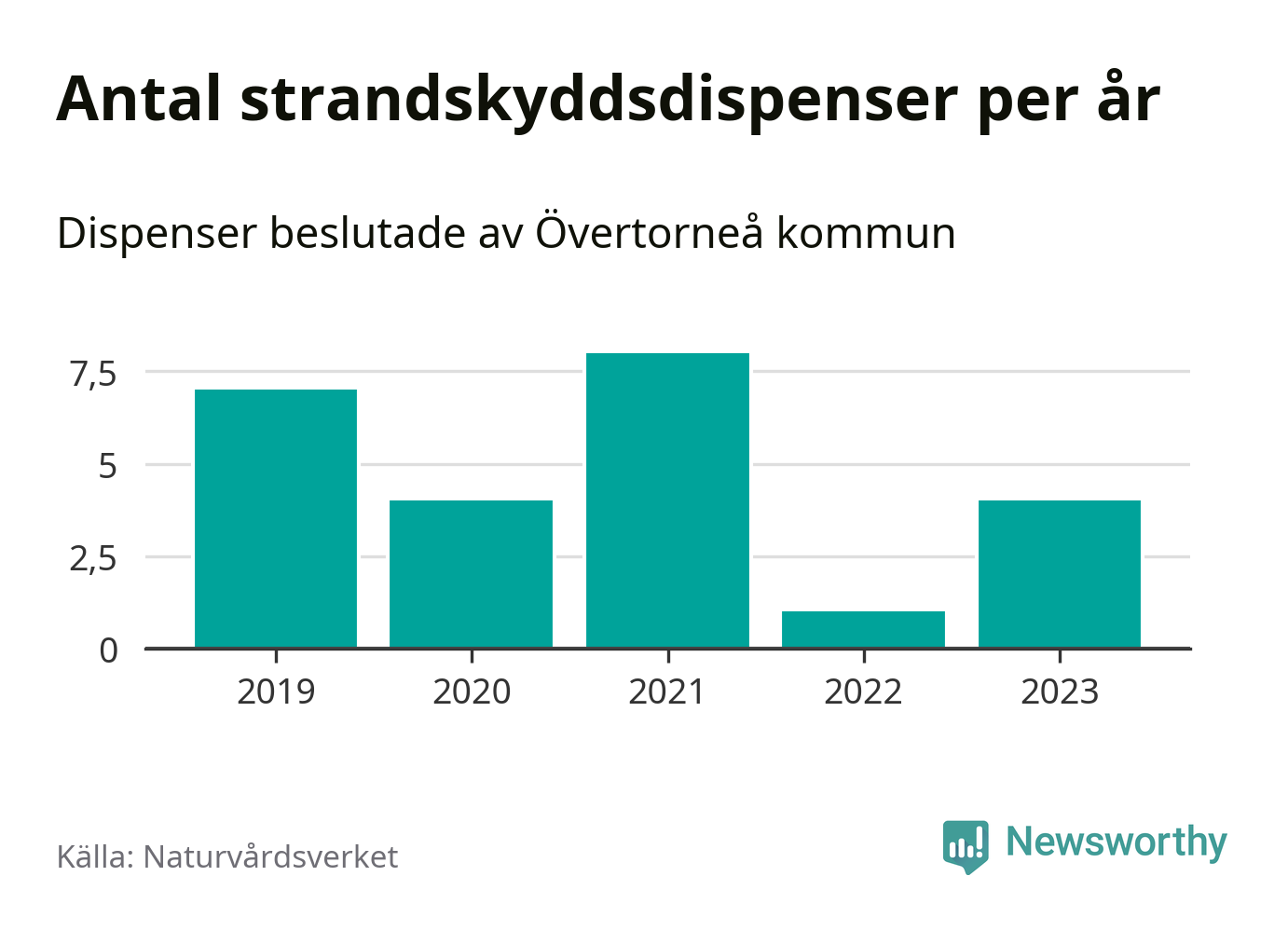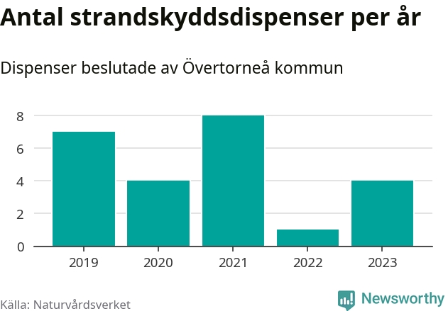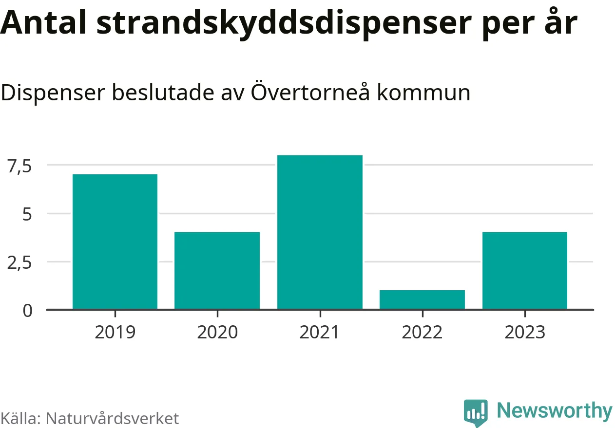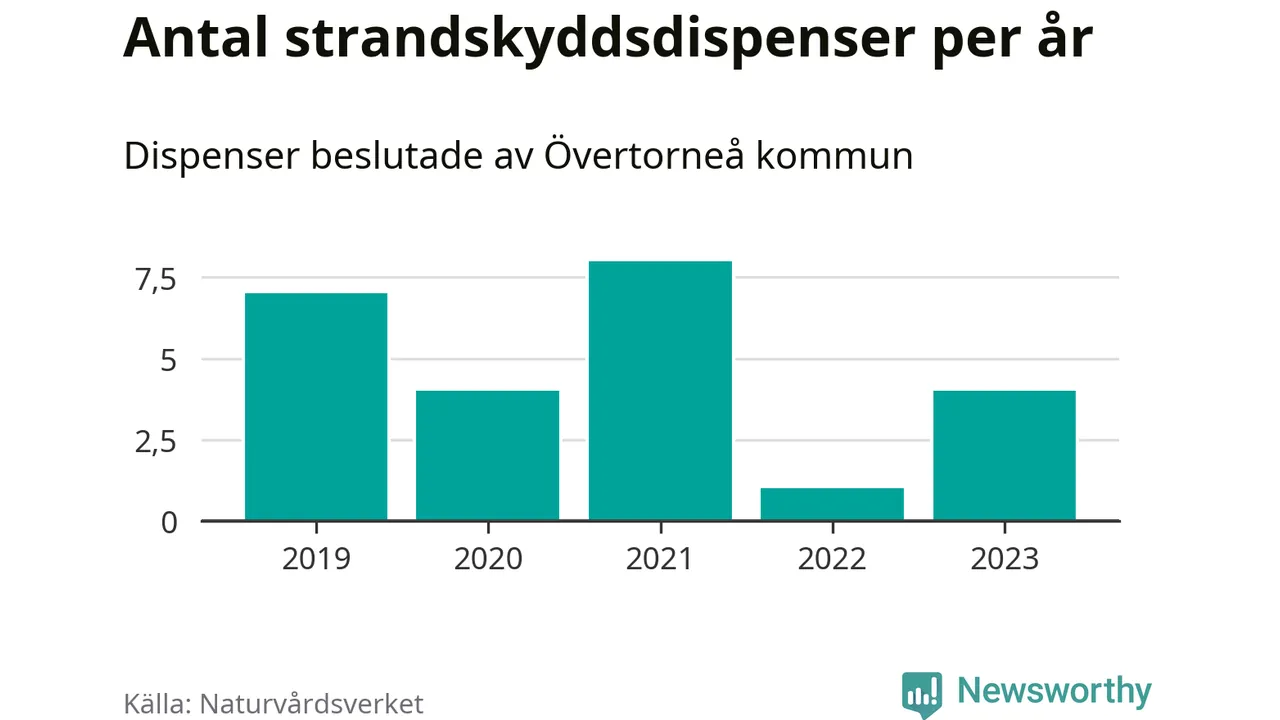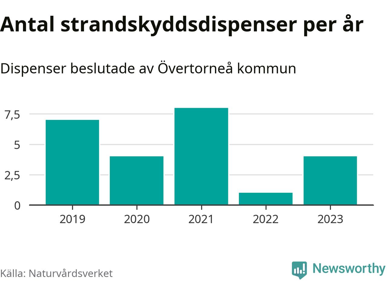 Den som vill bygga nära vatten behöver dispens från strandskyddet, lagstiftningen som ska säkra allmänhetens tillgång till stränderna och bevara livsvillkor för djur och växter. I de flesta fall är det kommunerna som godkänner dispenserna, och under de senaste fem åren har Övertorneå kommun fattat 24 beslut för totalt 34 åtgärder inom strandskyddat område, enligt den sammanställning Naturvårdsverket varje år gör. Det är färre än i de flesta kommuner i landet. Flest dispenser i Norrbottens län har godkänts i Luleå – 199 stycken.
