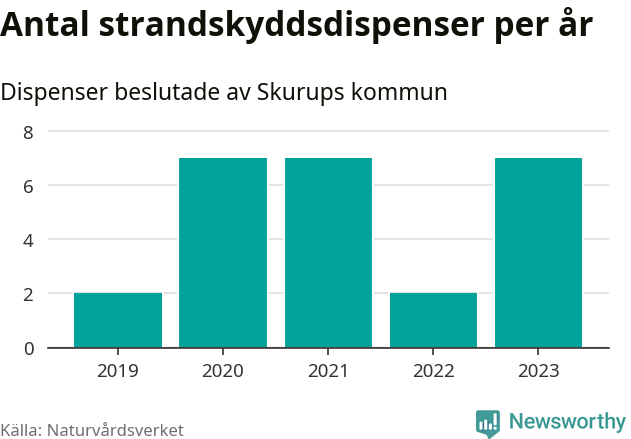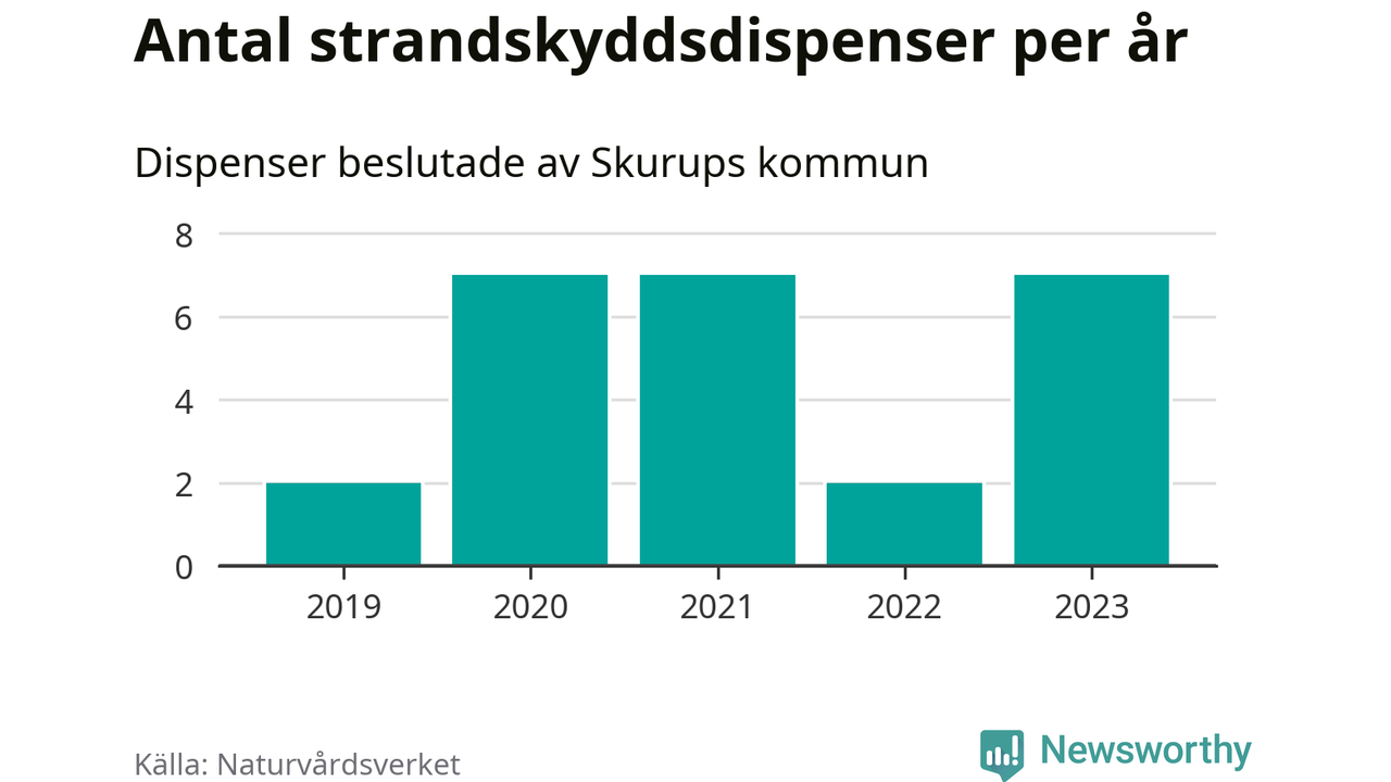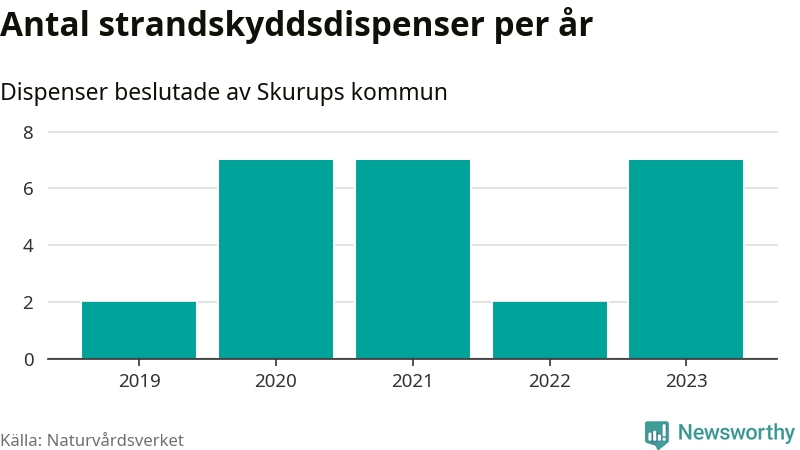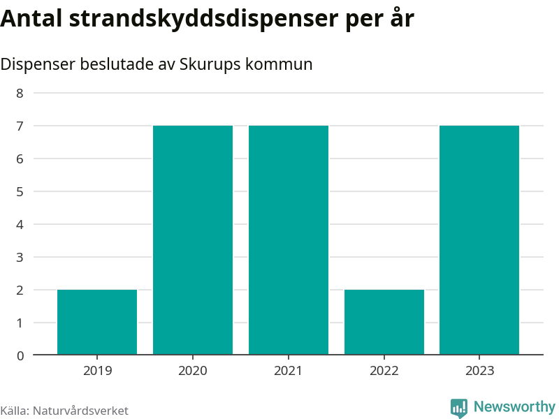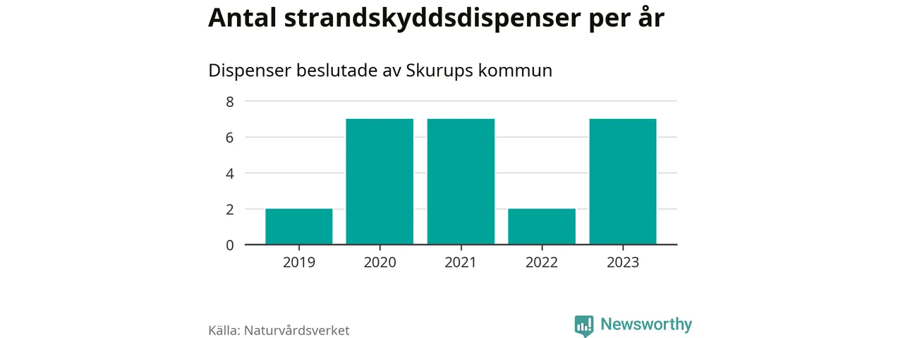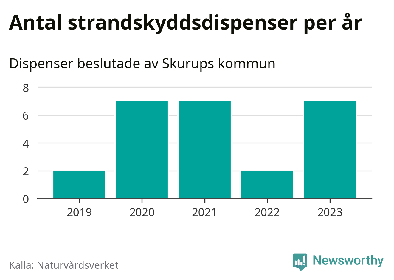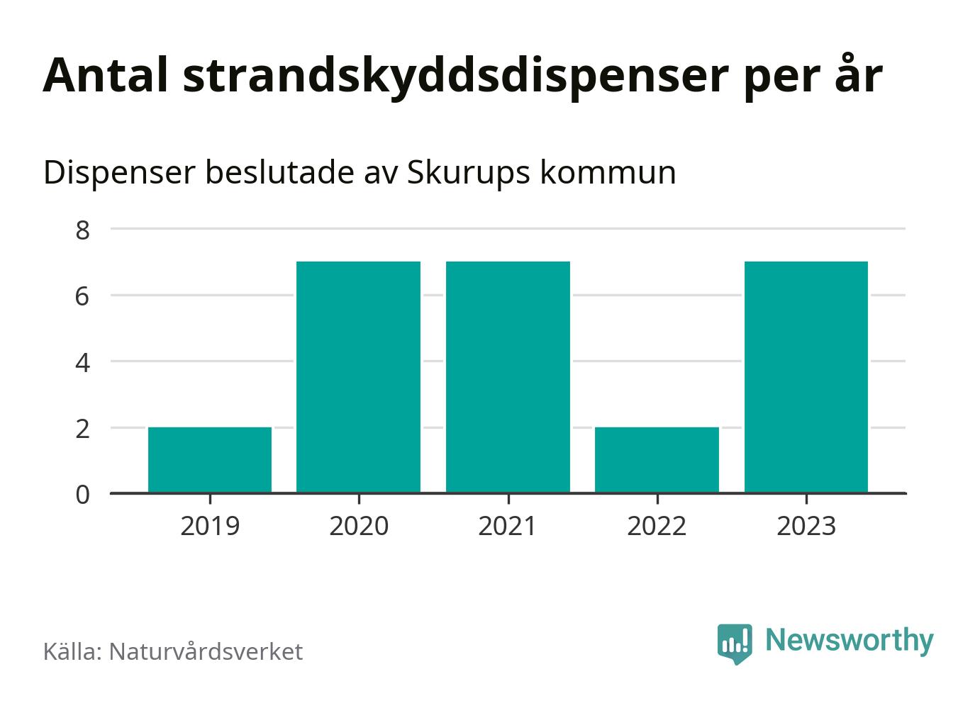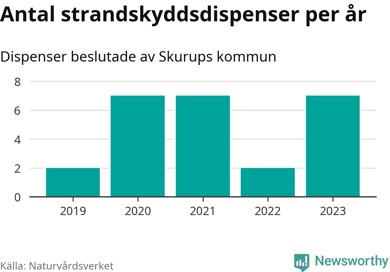 Den som vill bygga nära vatten behöver dispens från strandskyddet, lagstiftningen som ska säkra allmänhetens tillgång till stränderna och bevara livsvillkor för djur och växter. I de flesta fall är det kommunerna som godkänner dispenserna, och under de senaste fem åren har Skurups kommun fattat 25 beslut för totalt 26 åtgärder inom strandskyddat område, enligt den sammanställning Naturvårdsverket varje år gör. Det är färre än i de flesta kommuner i landet. Flest dispenser i Skåne län har godkänts i Kristianstad – 111 stycken.