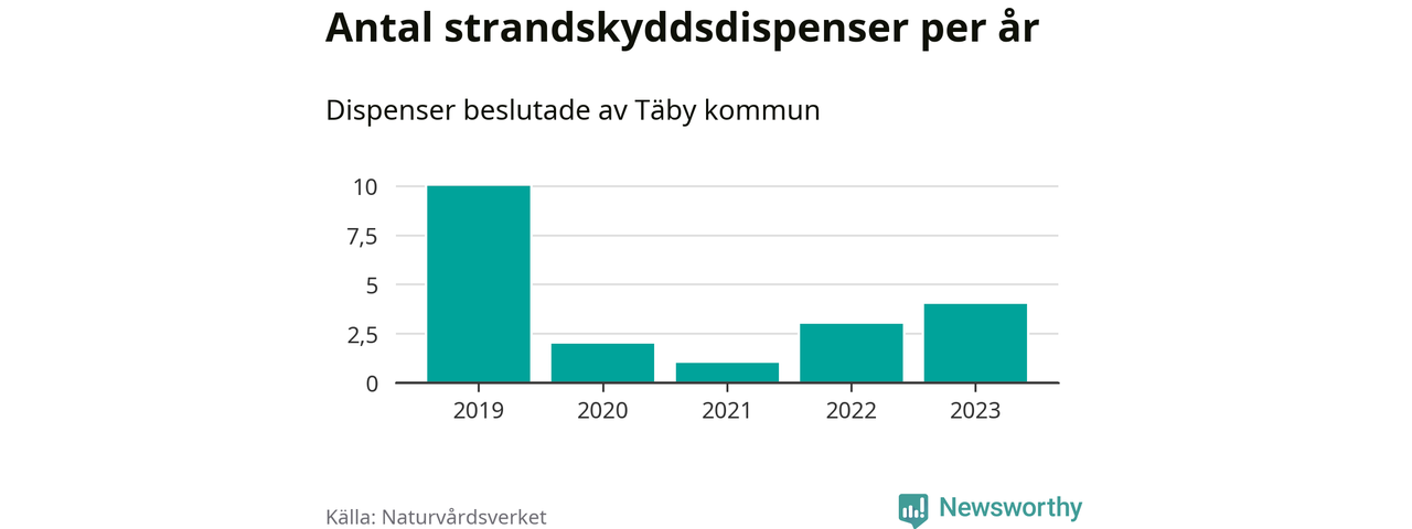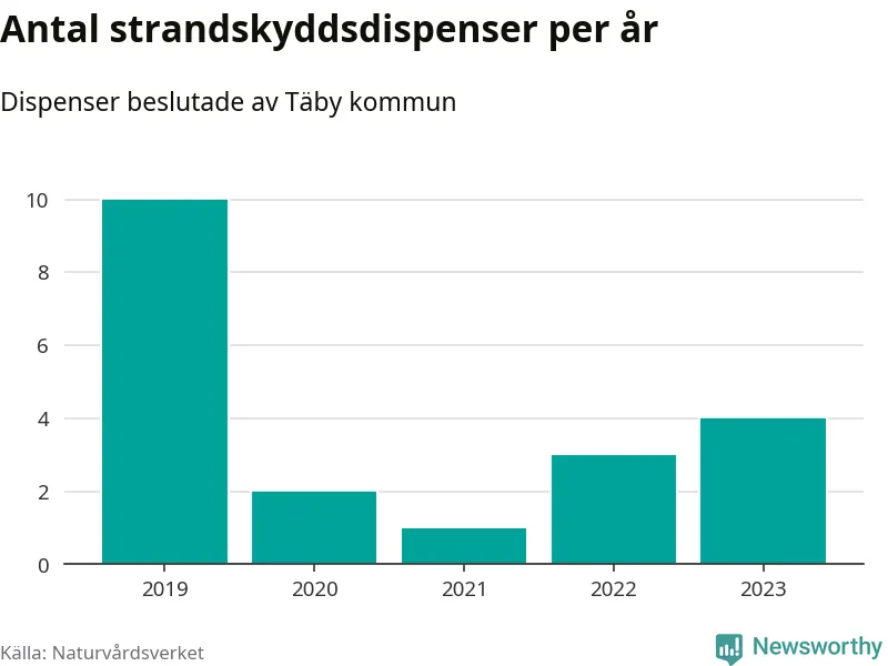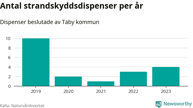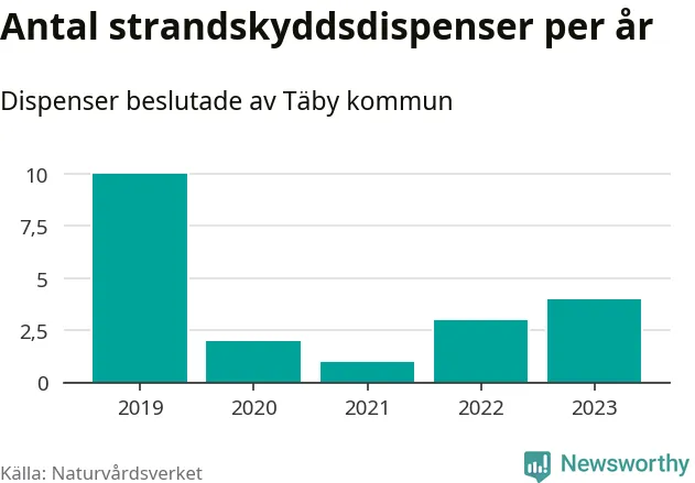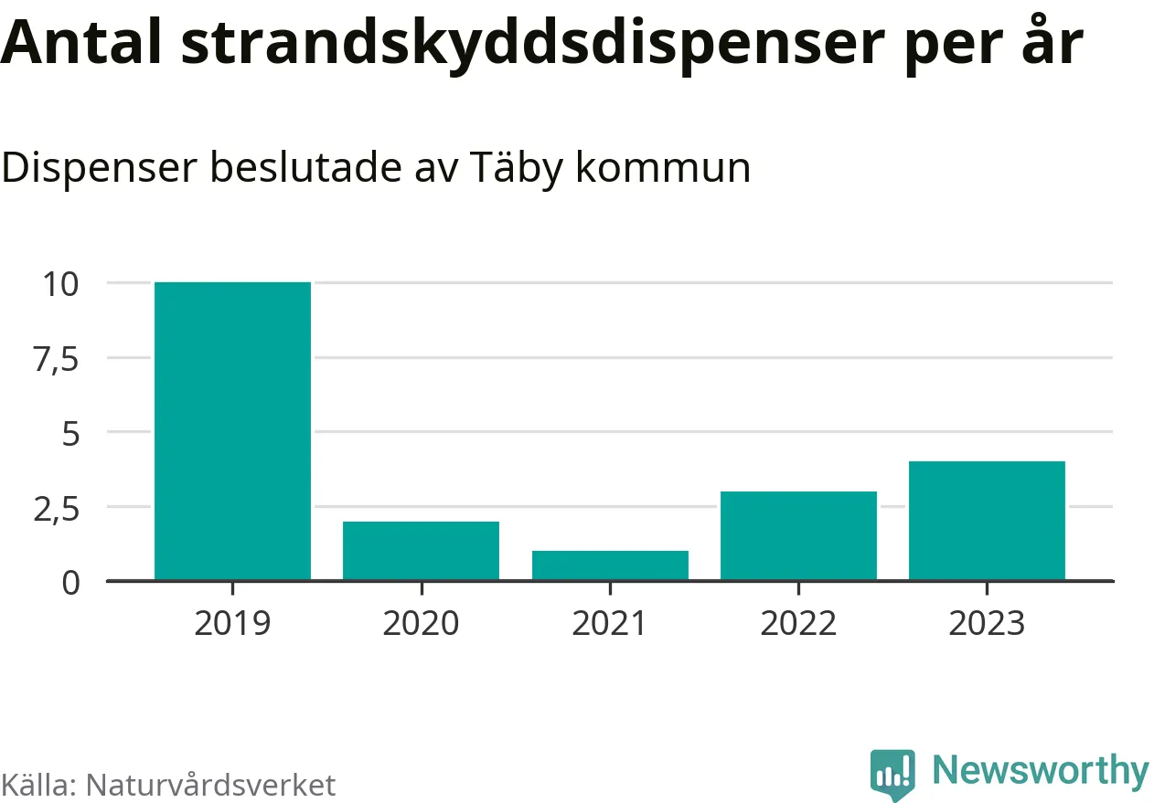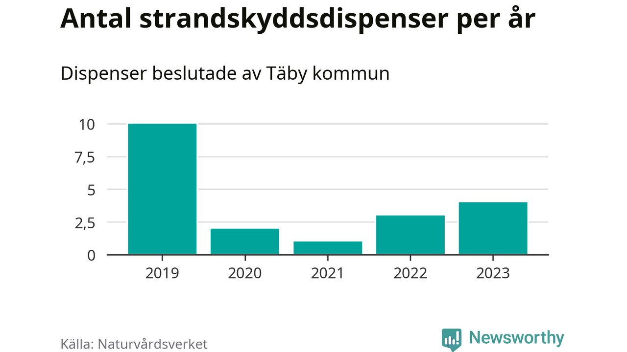 Den som vill bygga nära vatten behöver dispens från strandskyddet, lagstiftningen som ska säkra allmänhetens tillgång till stränderna och bevara livsvillkor för djur och växter. I de flesta fall är det kommunerna som godkänner dispenserna, och under de senaste fem åren har Täby kommun fattat 20 beslut för totalt 30 åtgärder inom strandskyddat område, enligt den sammanställning Naturvårdsverket varje år gör. Det är färre än i de flesta kommuner i landet. Flest dispenser i Stockholms län har godkänts i Värmdö – 1 571 stycken.