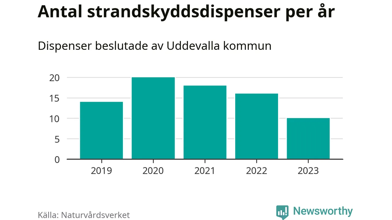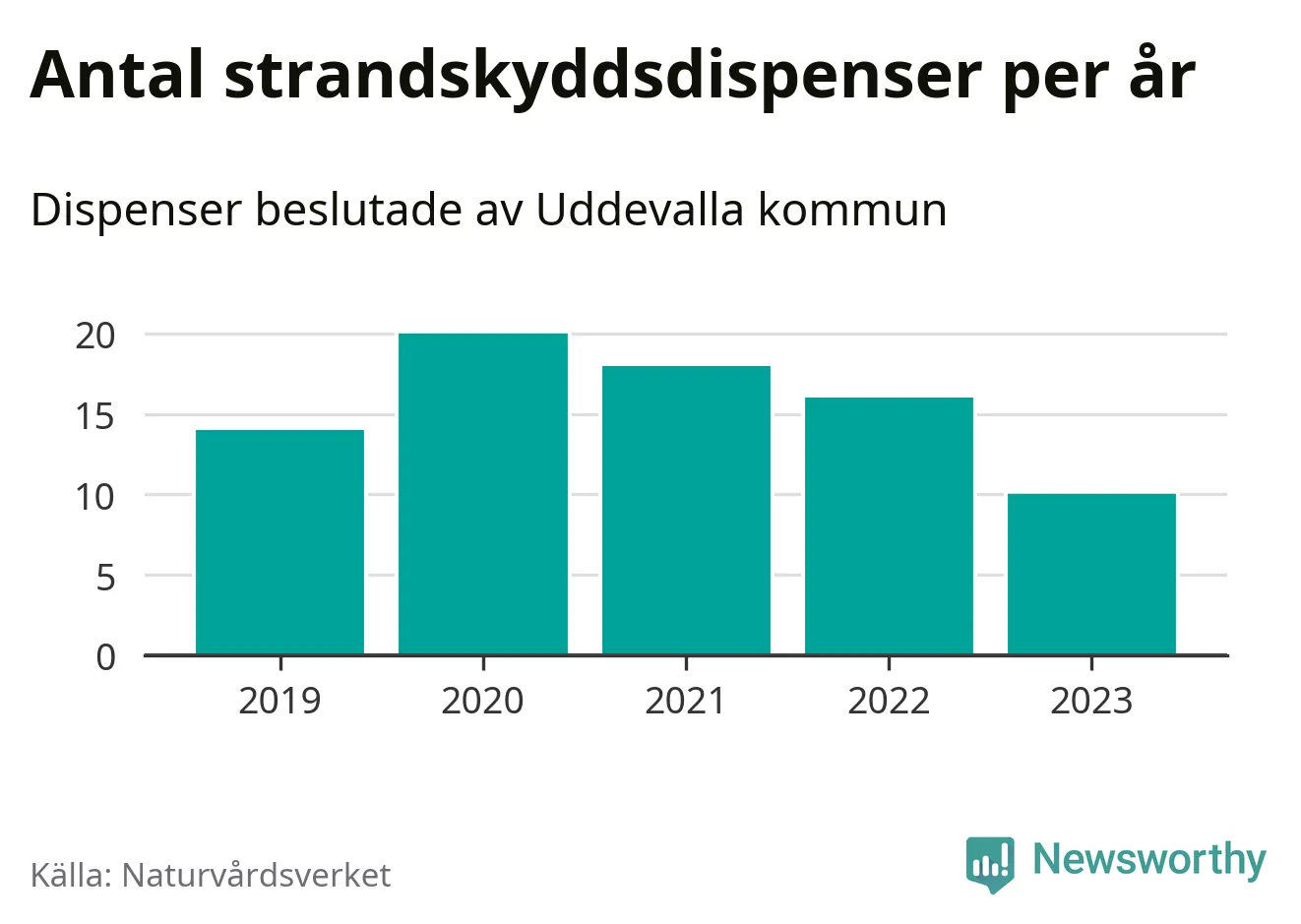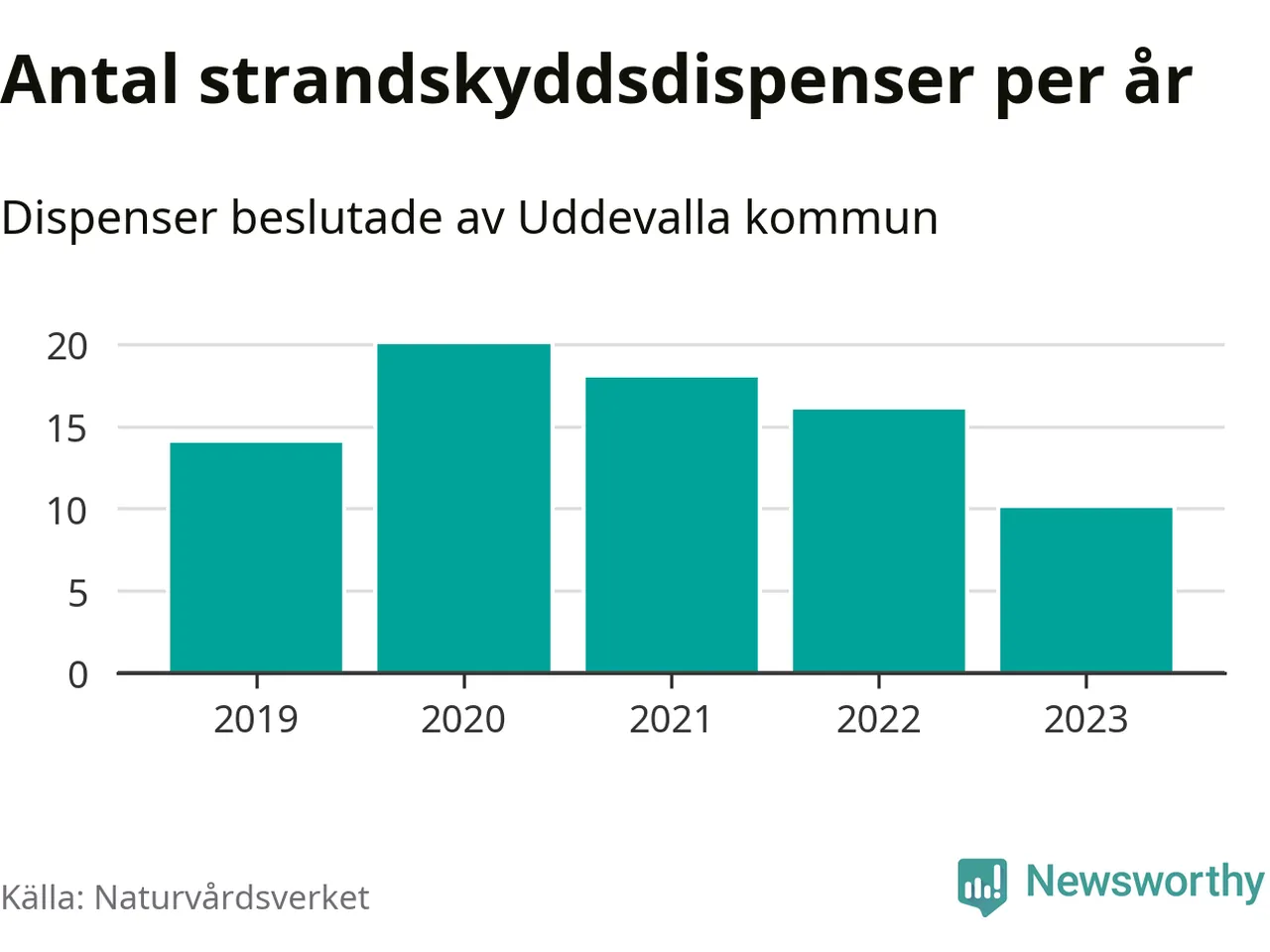 Den som vill bygga nära vatten behöver dispens från strandskyddet, lagstiftningen som ska säkra allmänhetens tillgång till stränderna och bevara livsvillkor för djur och växter. I de flesta fall är det kommunerna som godkänner dispenserna, och under de senaste fem åren har Uddevalla kommun fattat 78 beslut för totalt 109 åtgärder inom strandskyddat område, enligt den sammanställning Naturvårdsverket varje år gör. Det är inte en siffra som sticker ut särskilt jämfört med andra kommuner. Flest dispenser i Västra Götalands län har godkänts i Borås – 220 stycken.