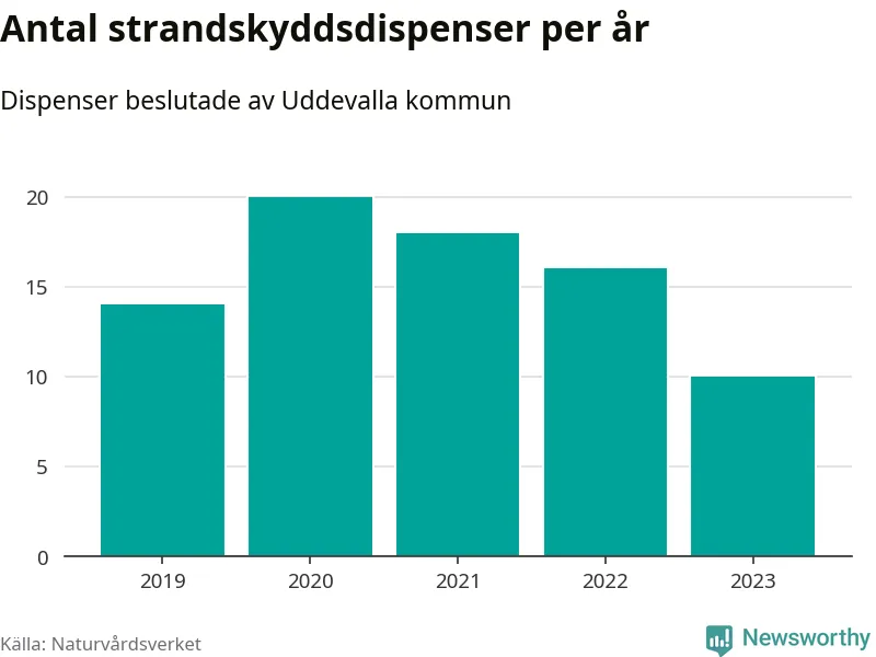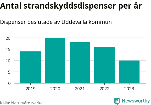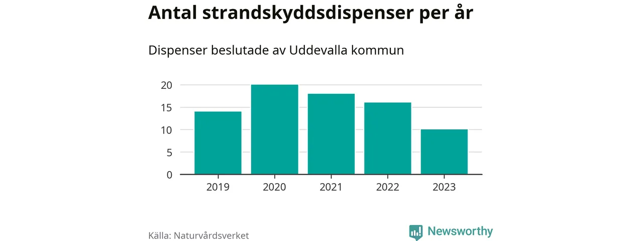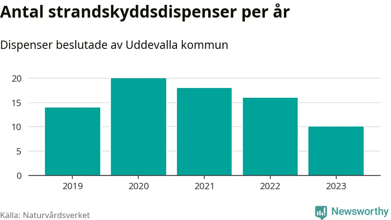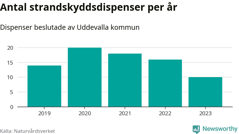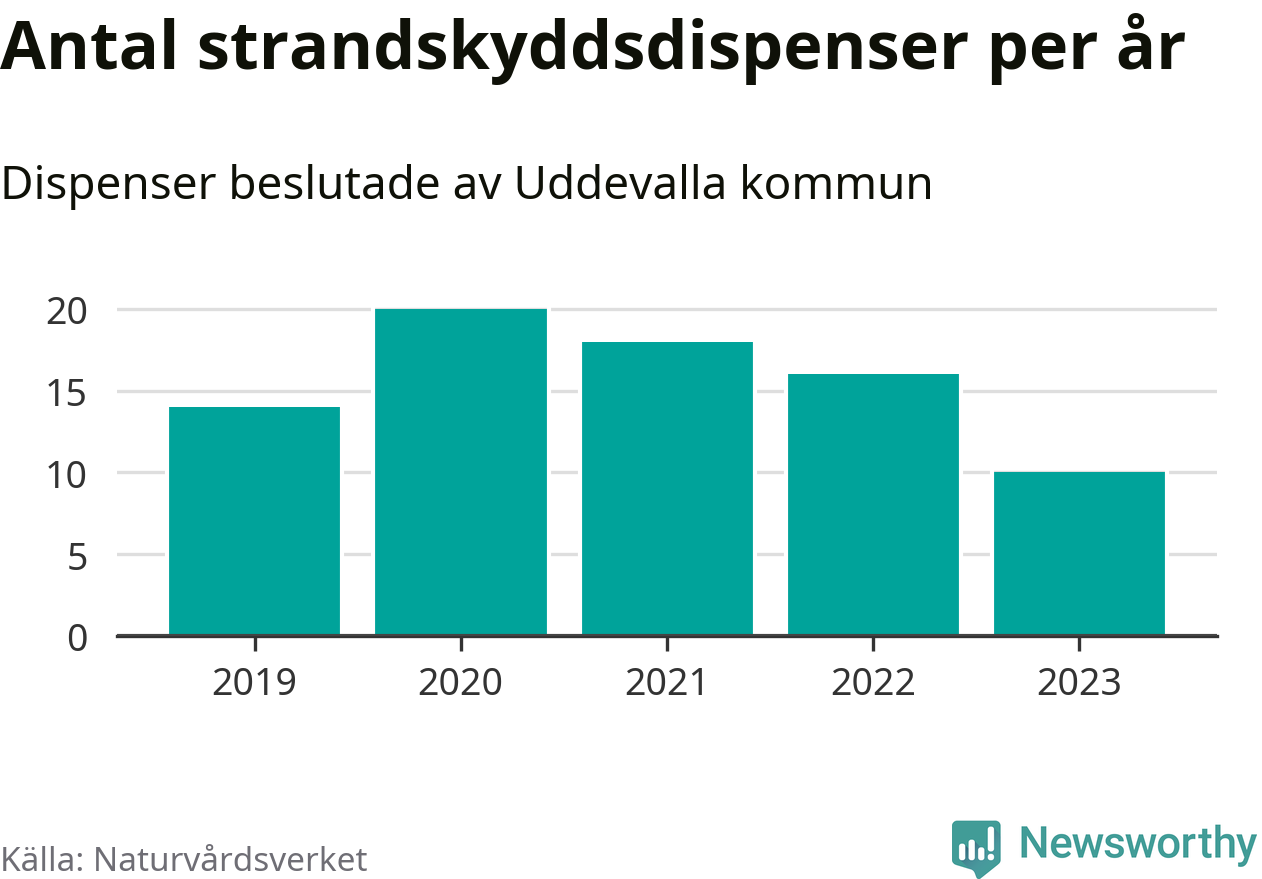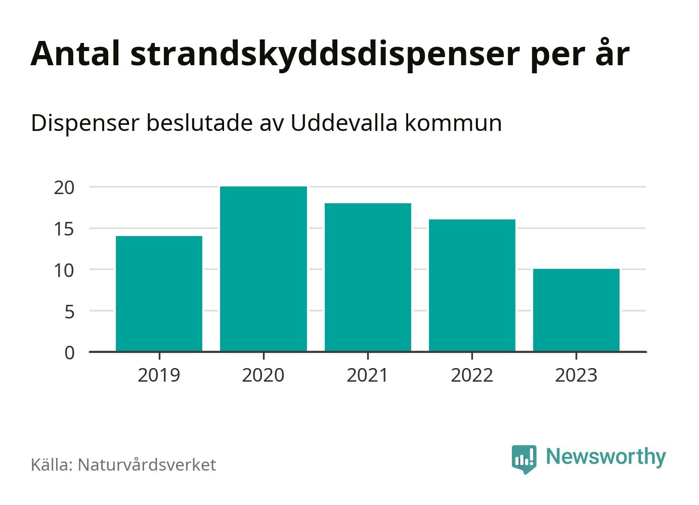Den som vill bygga nära vatten behöver dispens från strandskyddet, lagstiftningen som ska säkra allmänhetens tillgång till stränderna och bevara livsvillkor för djur och växter. I de flesta fall är det kommunerna som godkänner dispenserna, och under de senaste fem åren har Uddevalla kommun fattat 78 beslut för totalt 109 åtgärder inom strandskyddat område, enligt den sammanställning Naturvårdsverket varje år gör. Det är inte en siffra som sticker ut särskilt jämfört med andra kommuner. Flest dispenser i Västra Götalands län har godkänts i Borås – 220 stycken.